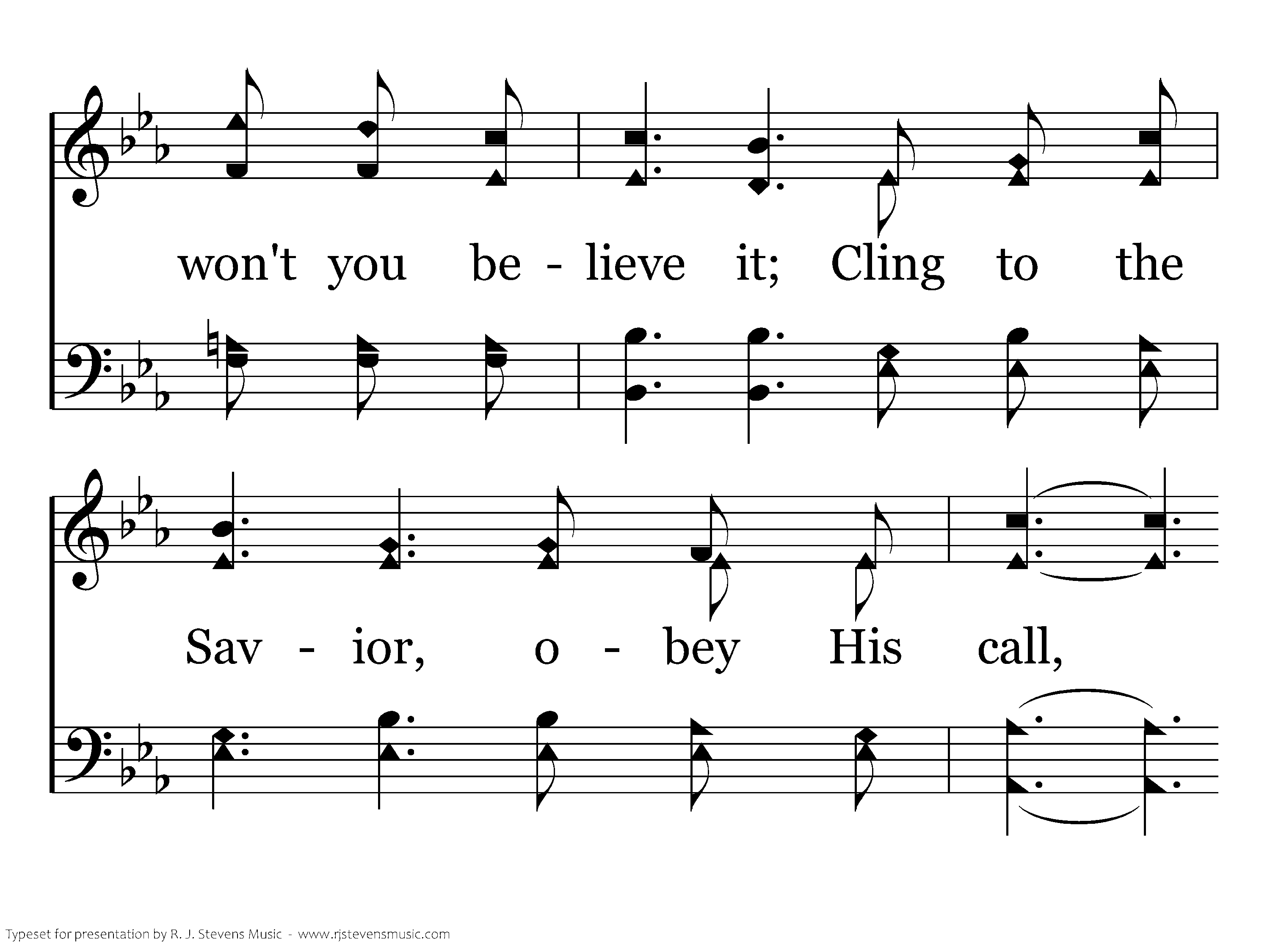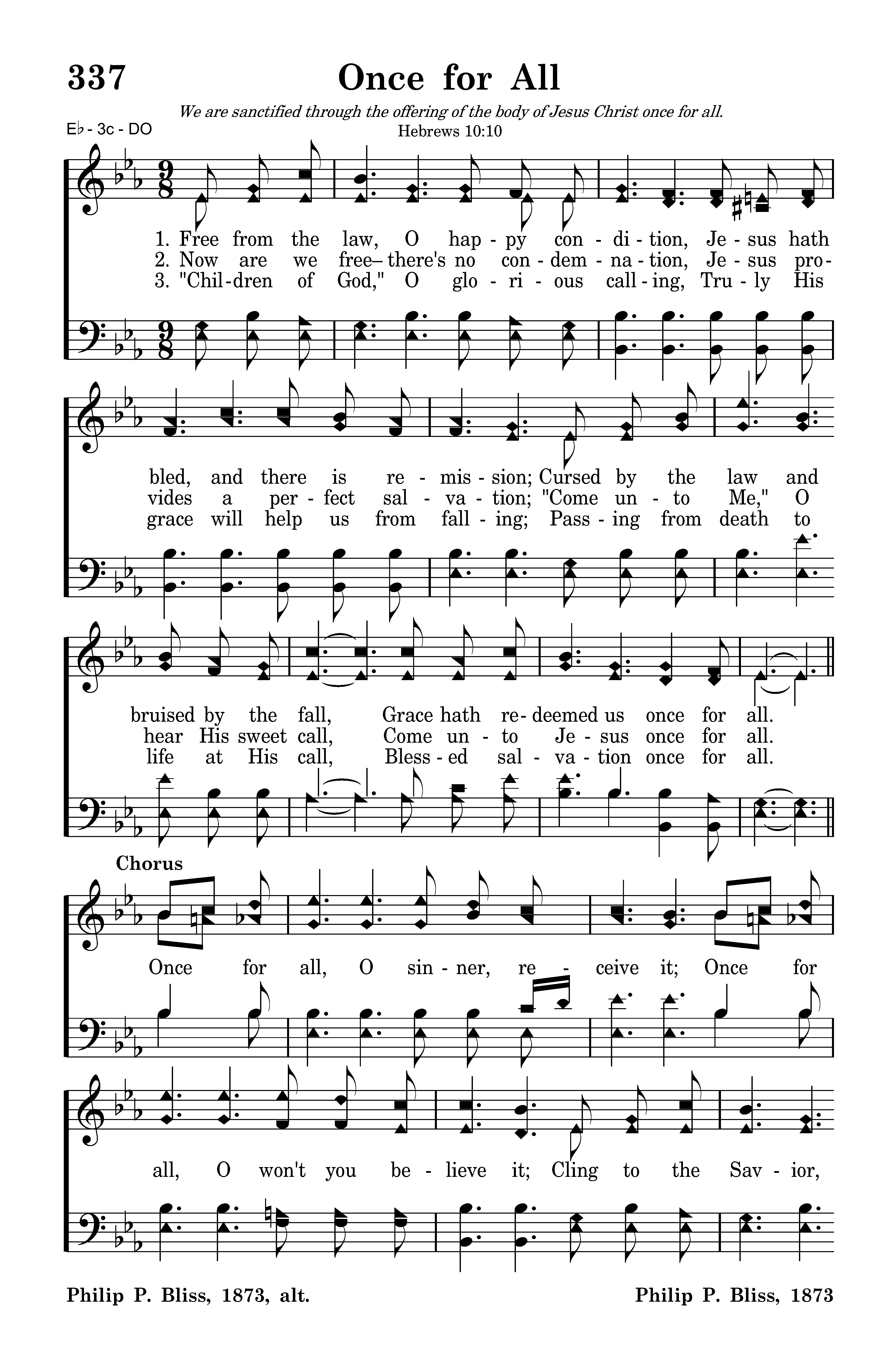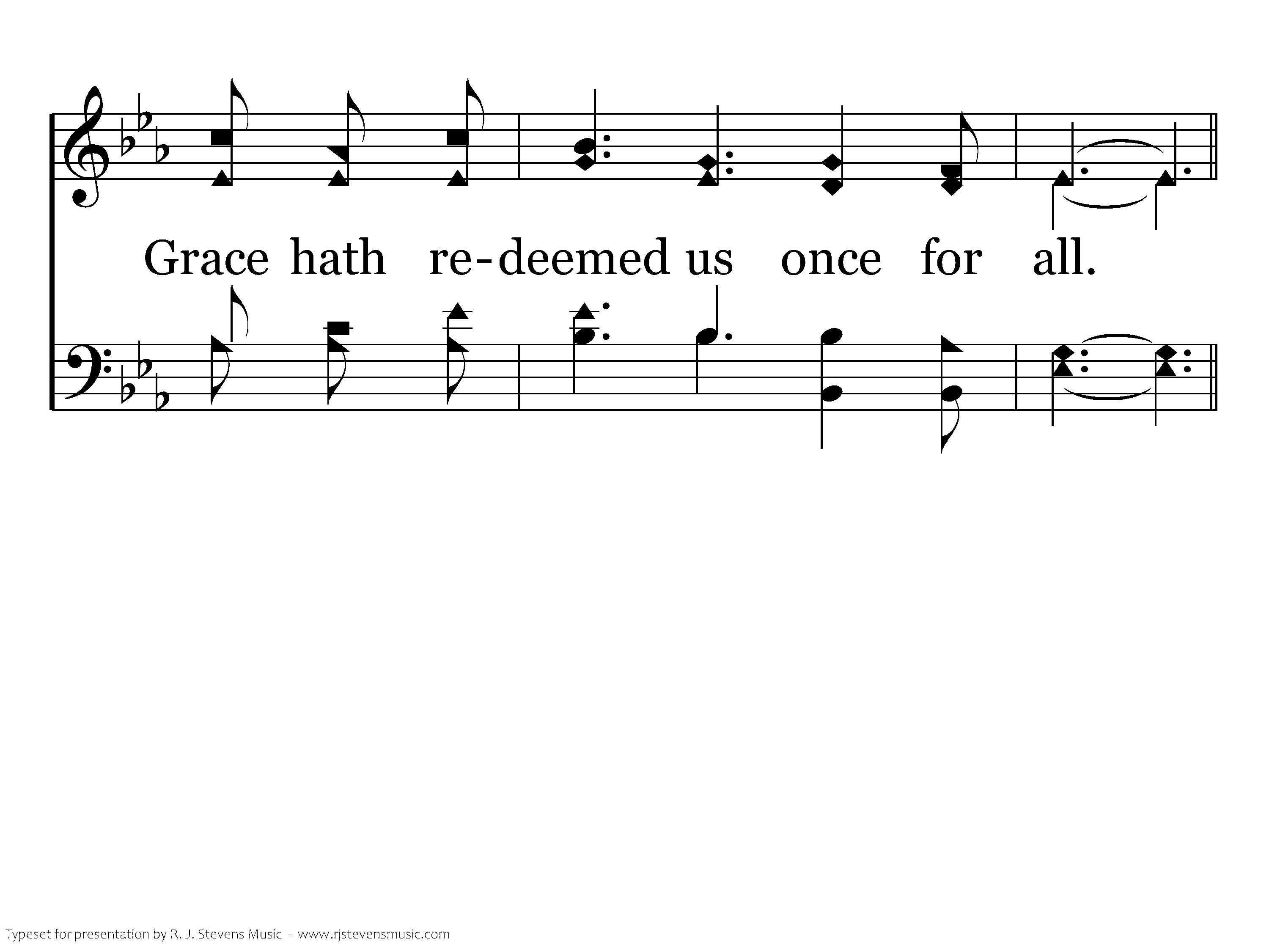 Once for all, O sinner receive it; Once for all, O won't you believe it; Cling to the Savior, Obey his call, Christ hath redeemed us once for all.