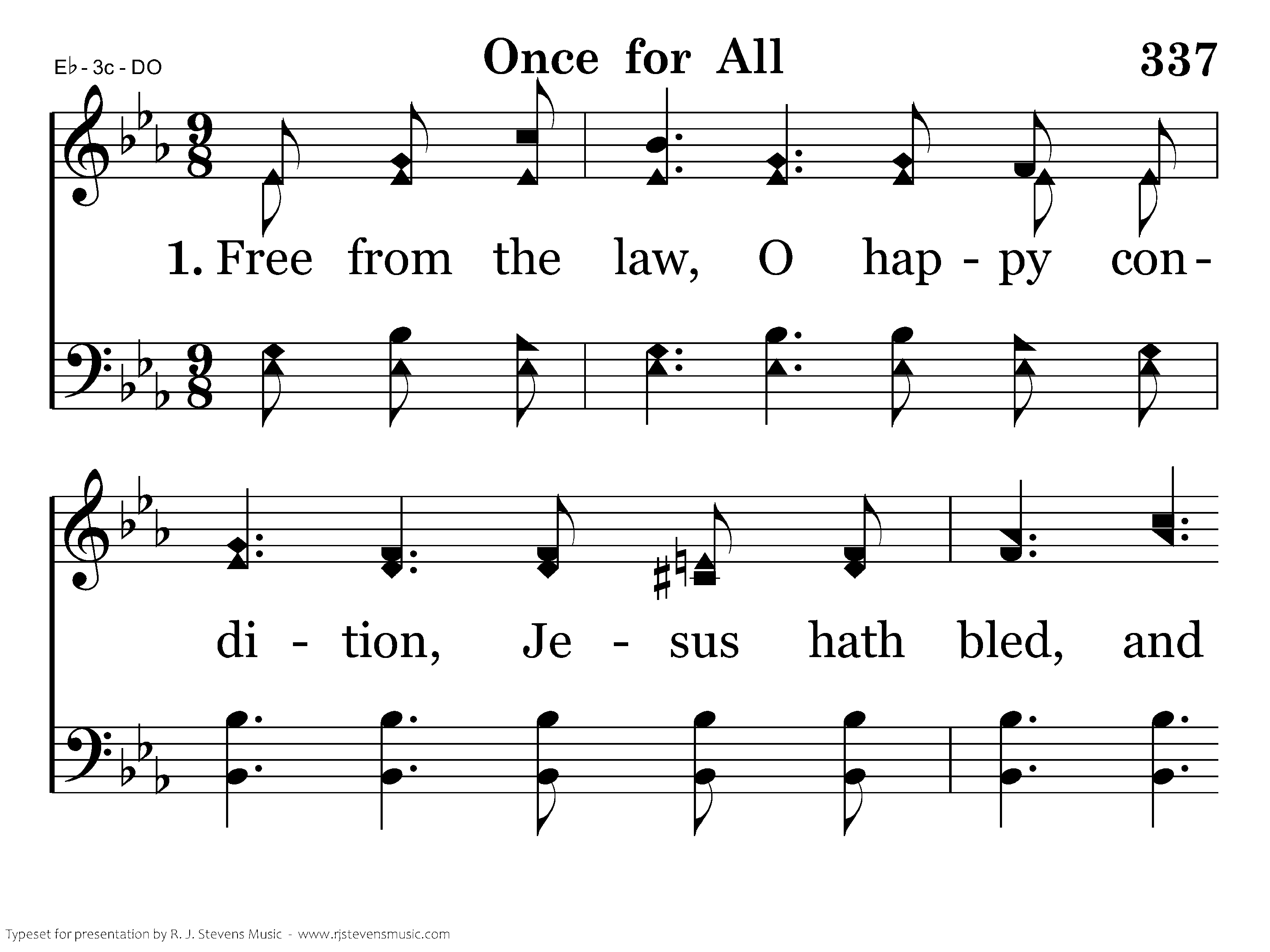Free from the law, O happy condition, Jesus hath bled, and there is remission; Cursed by the law and bruised by the fall, Grace hath redeemed us once for all.