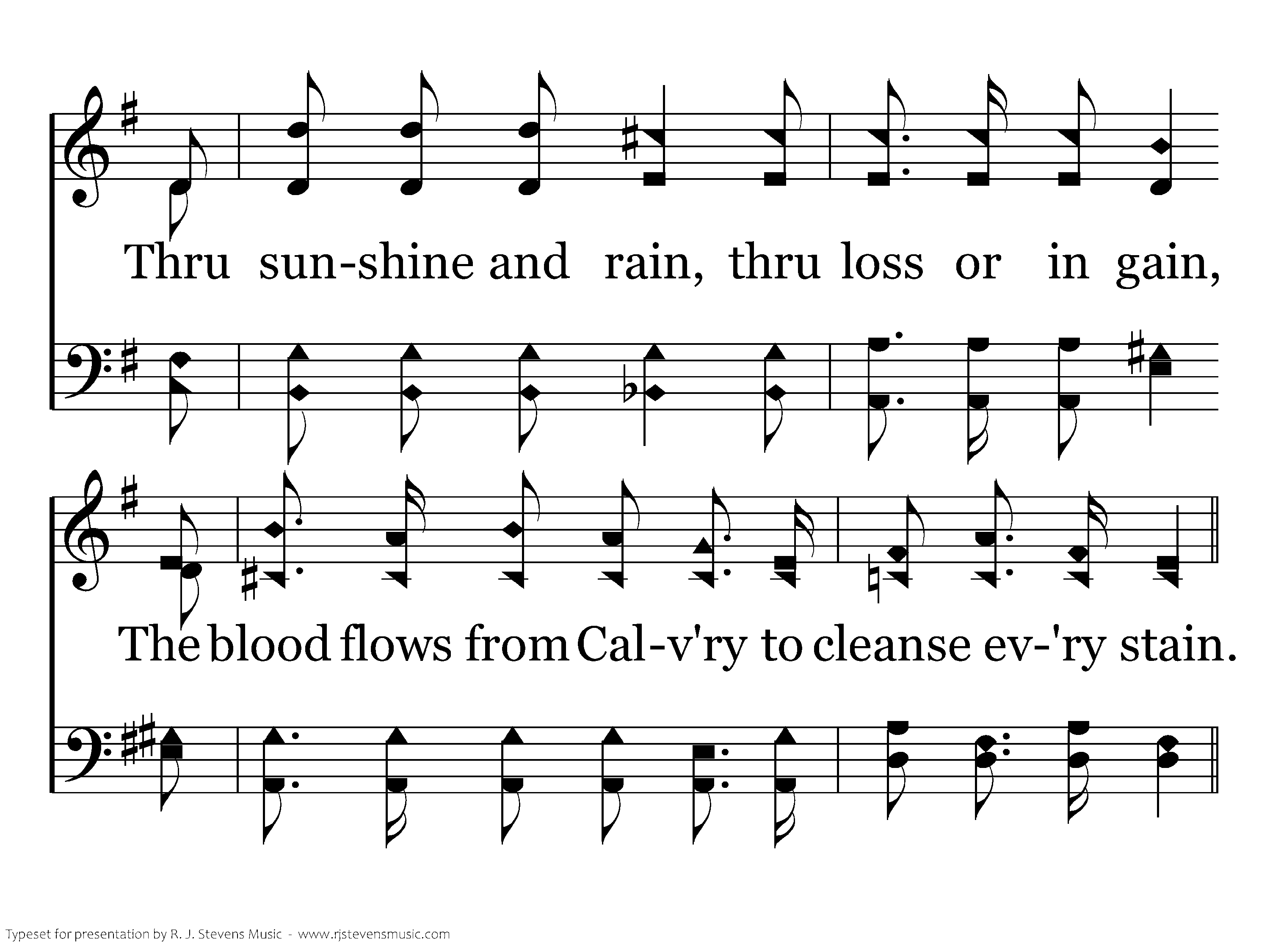 The hand of my Savior is stong, And the love of my Savior is long; Thru sunshine and rain, thru loss or in gain, The blood flows from Calv'ry to cleanse every stain.