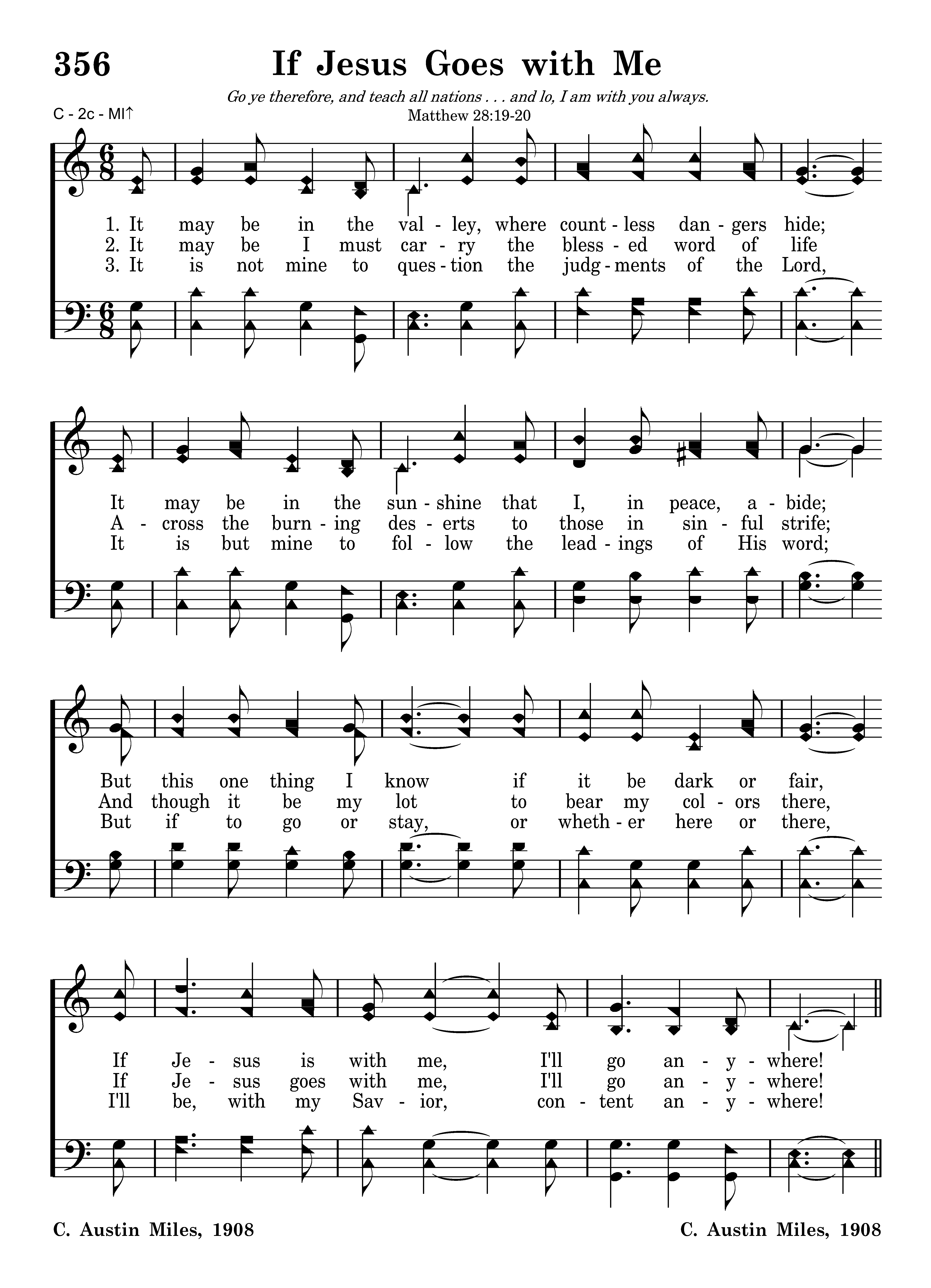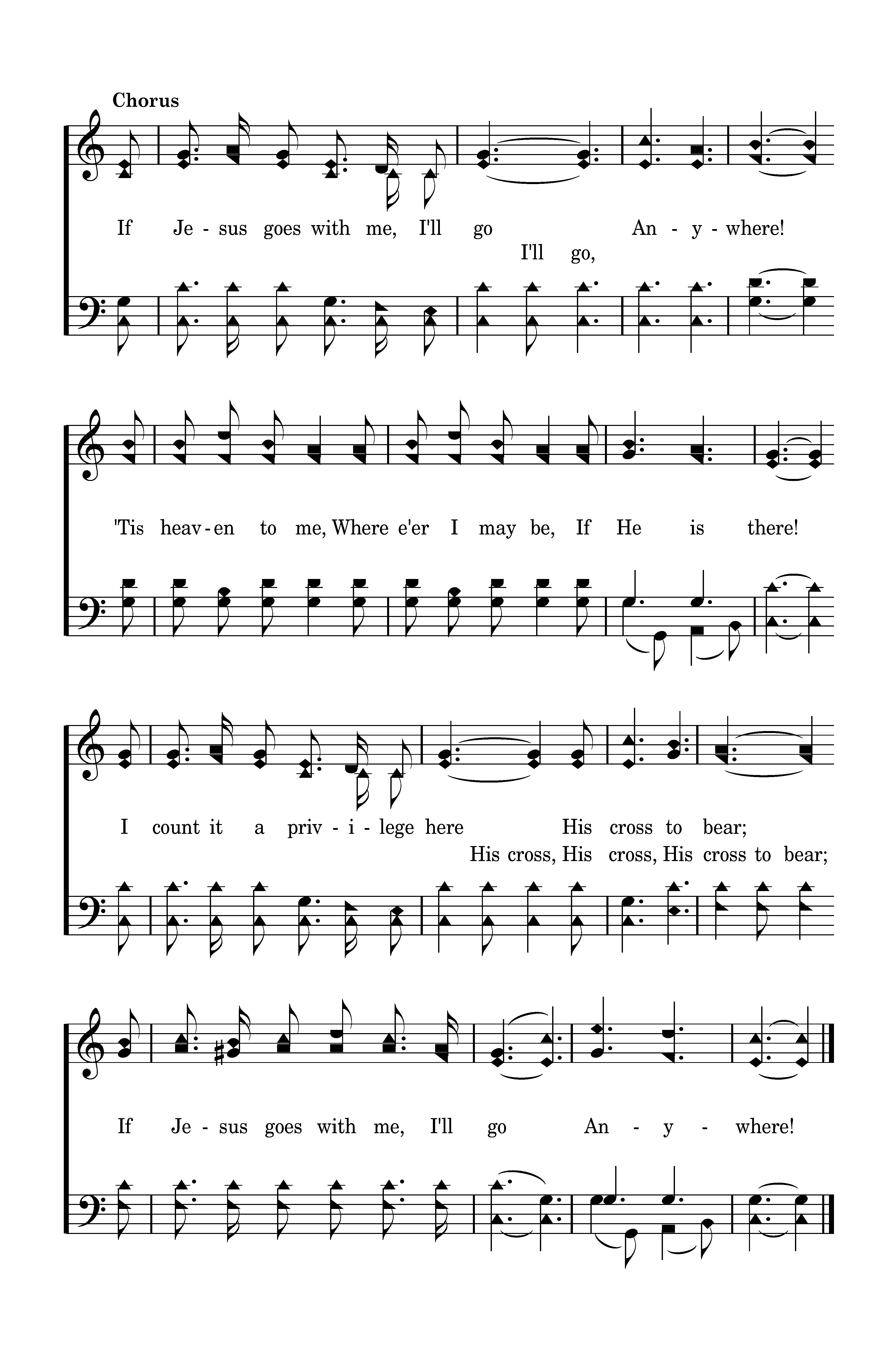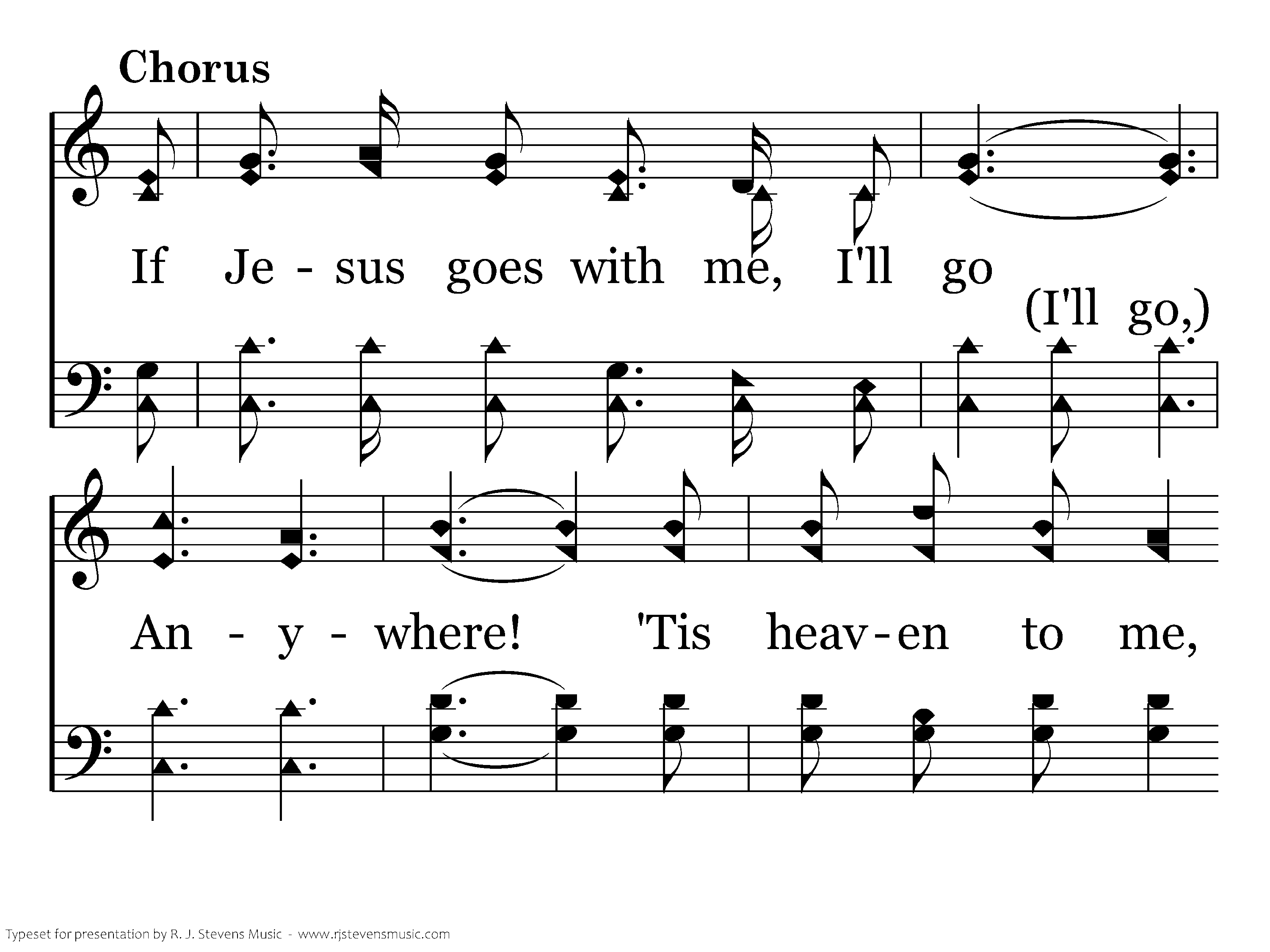 If Jesus goes with me, I'll go Anywhere! 'Tis heaven to me, Where e'er I may be, If He is there! I count it a privilege here His cross to bear; If Jesus goes with me, I'll go Anywhere!