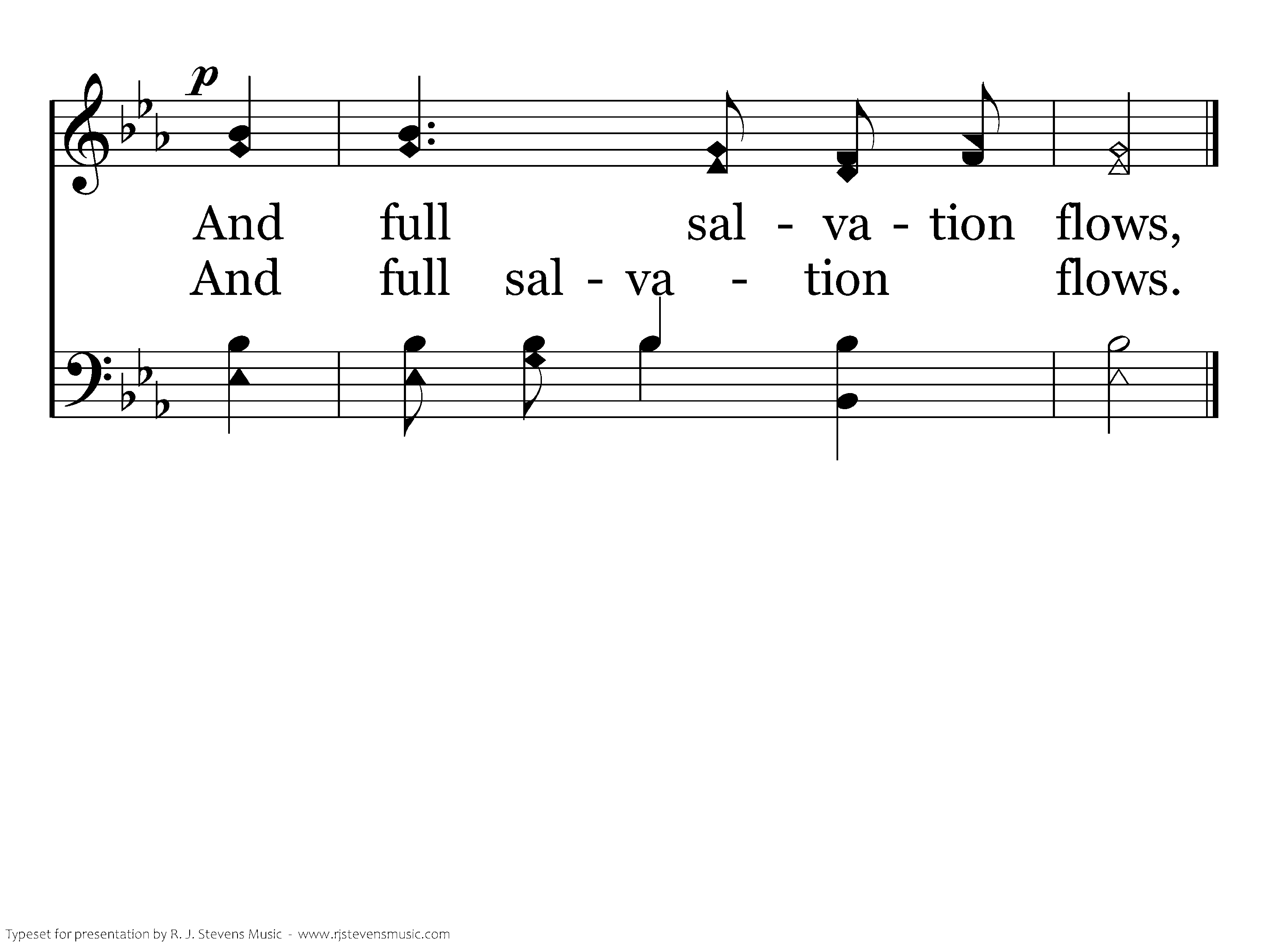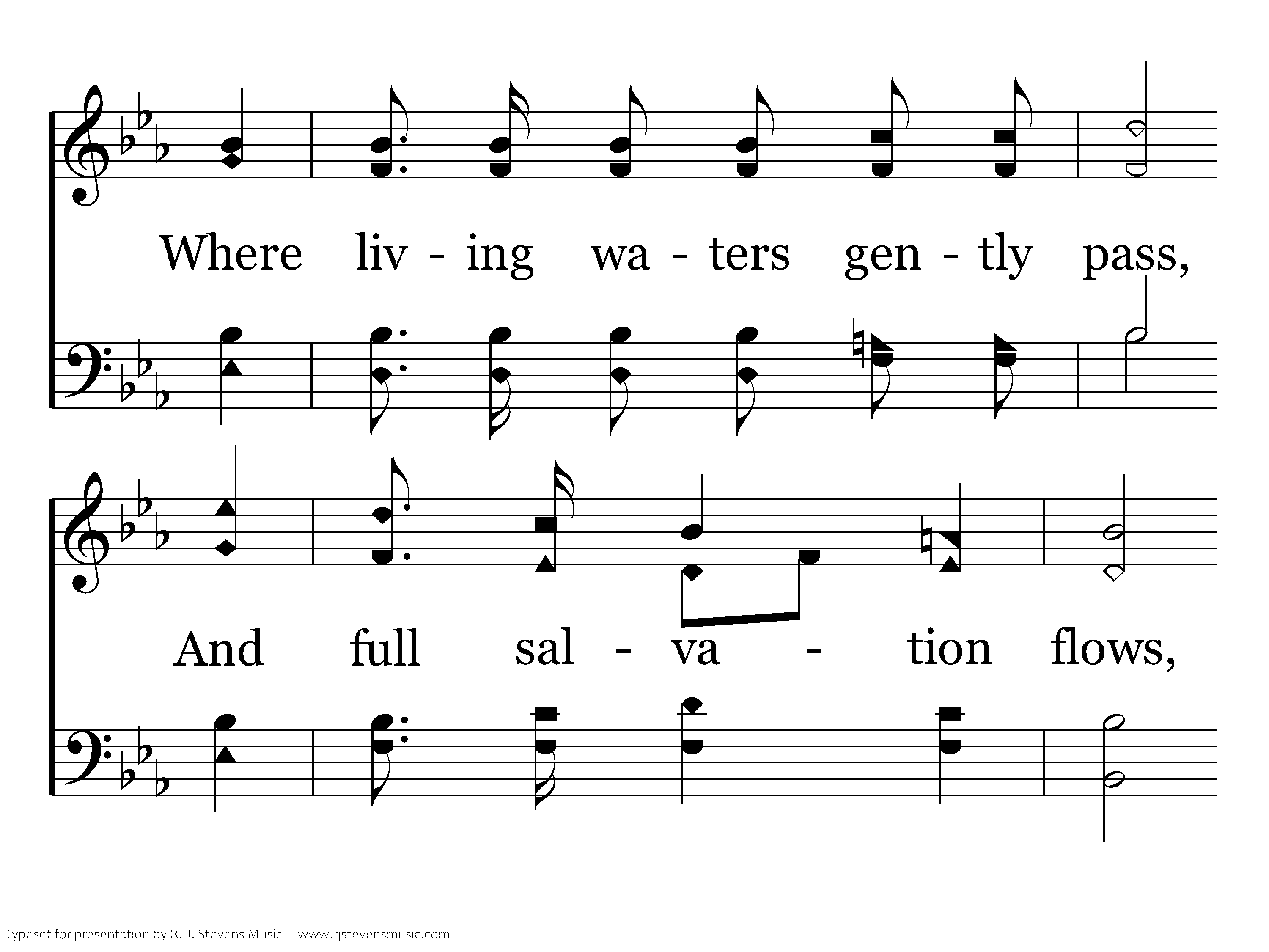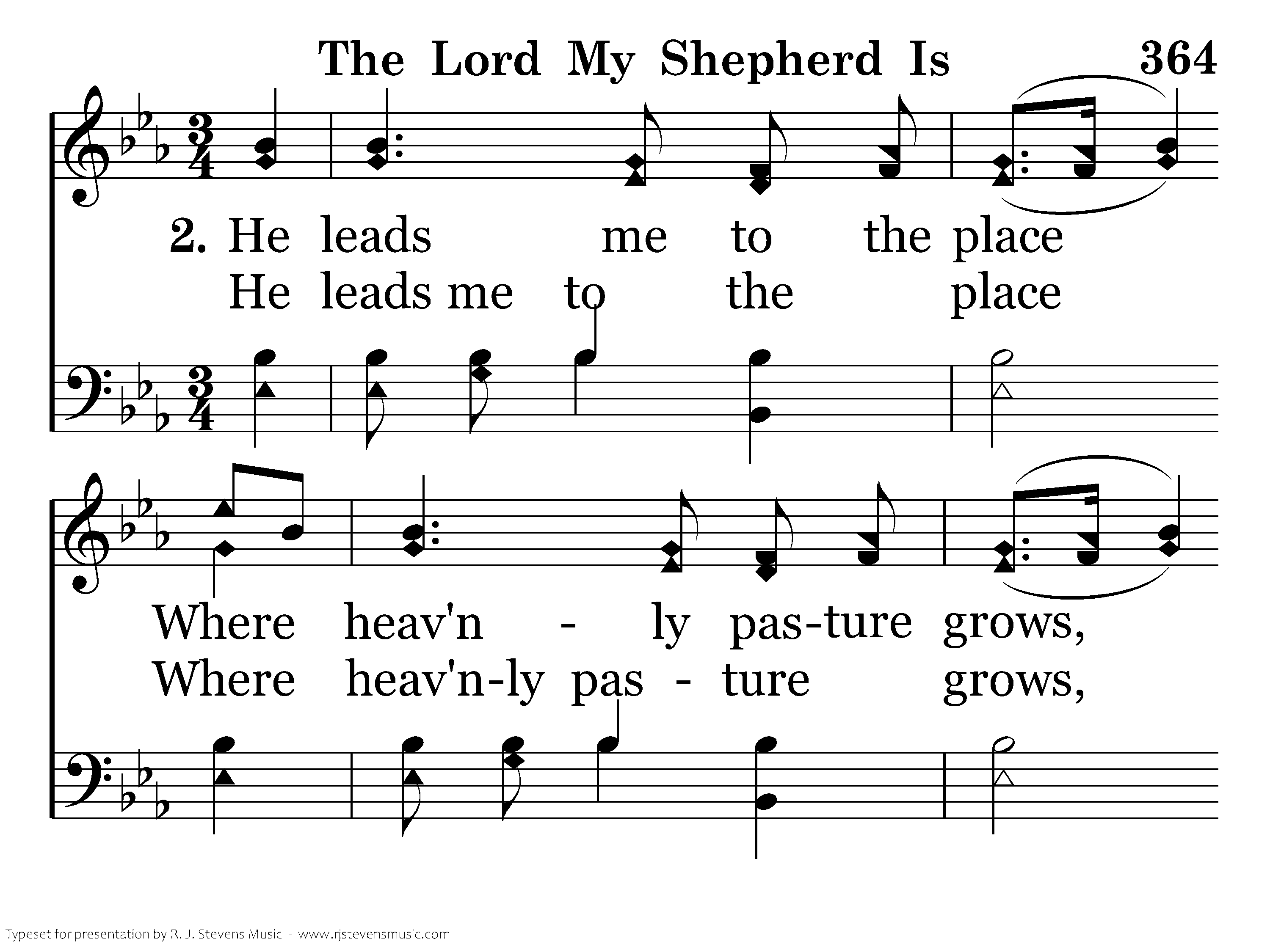 He leads me to the place Where heav'nly pasture grows, Where living waters gently pass, And full salvation flows, And full salvation flows.