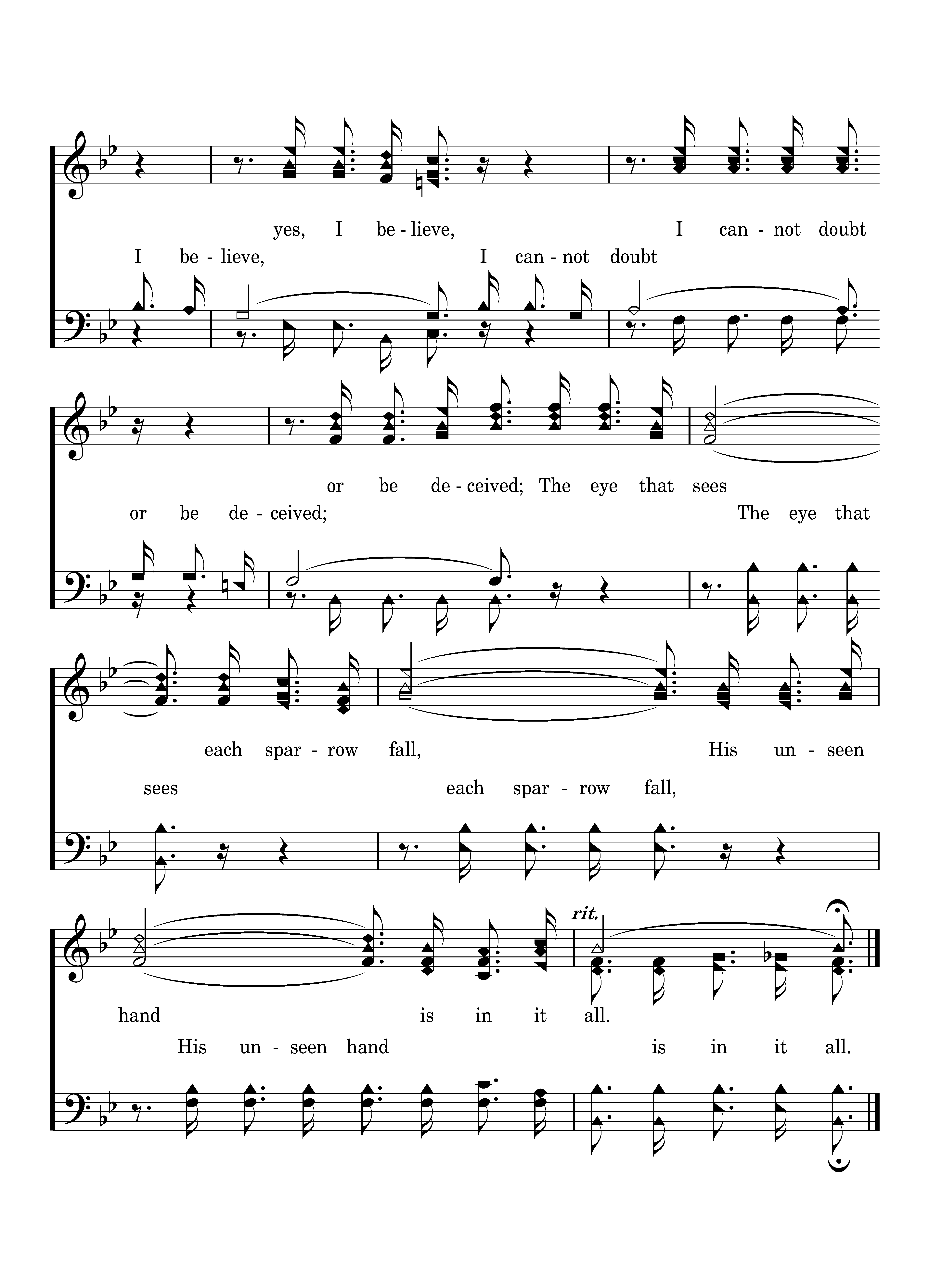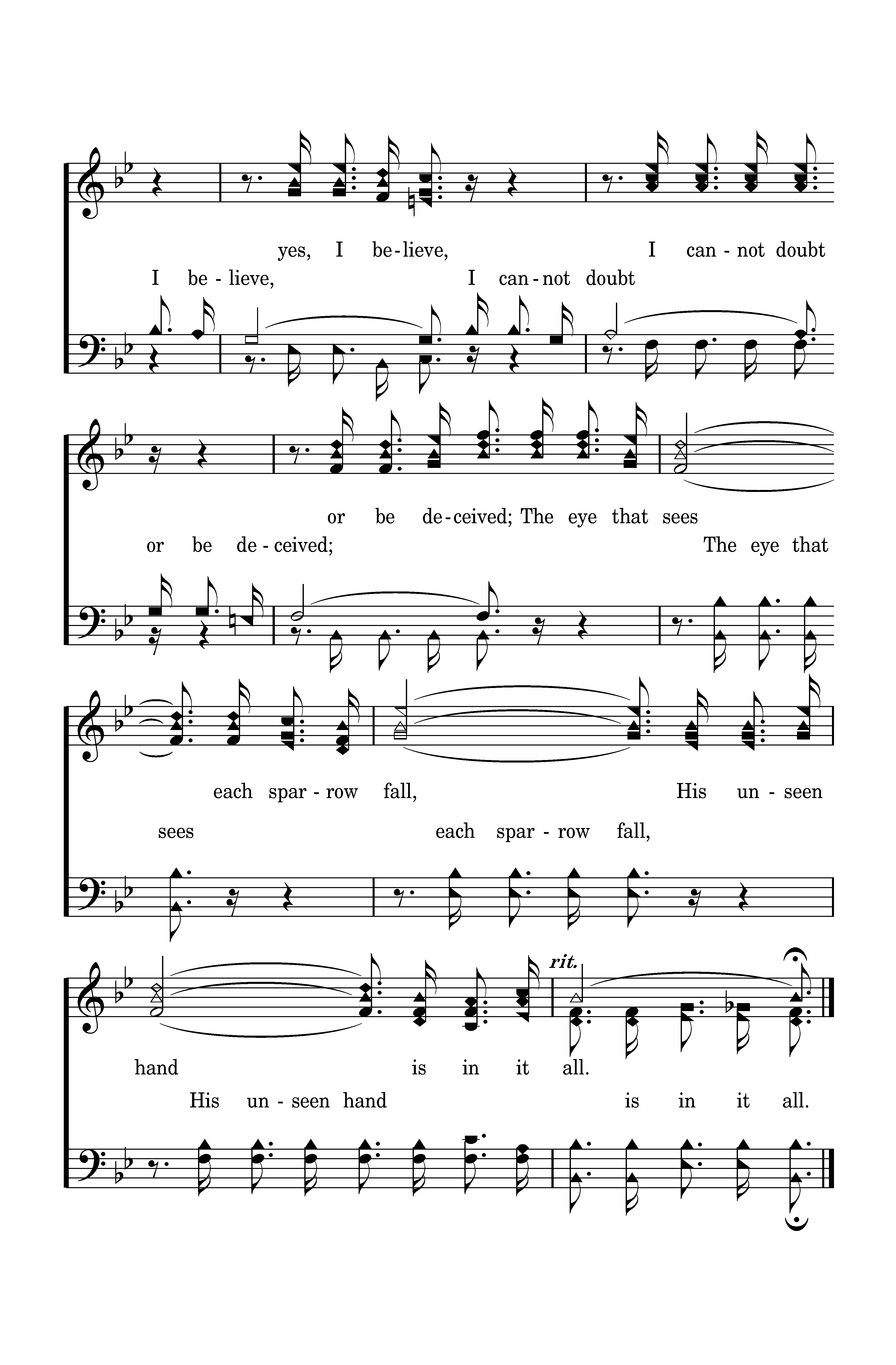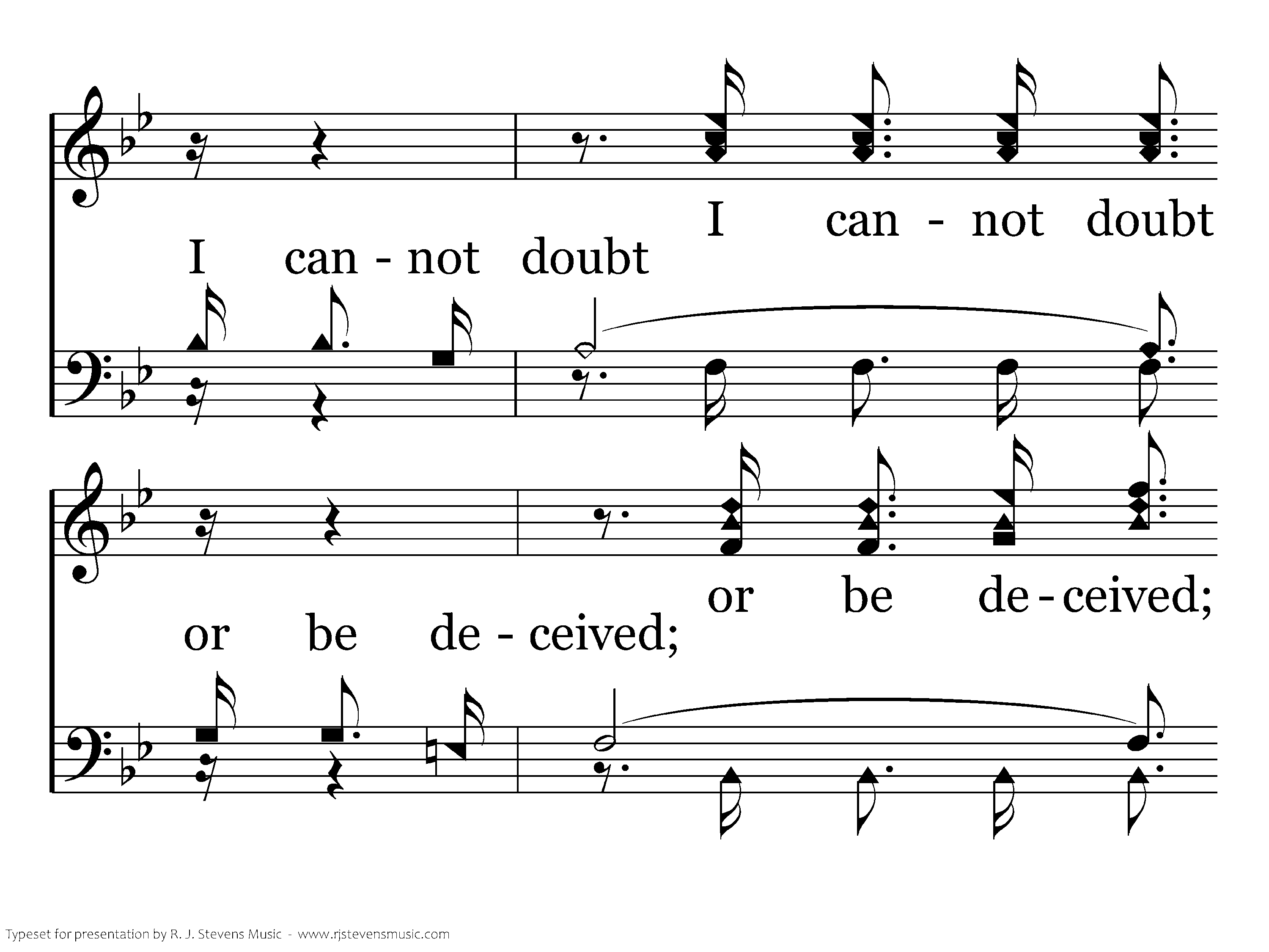 Lord, I believe, yes, I believe, I cannot doubt or be deceived; The eye that sees each sparrow fall, His unseen hand is in it all.