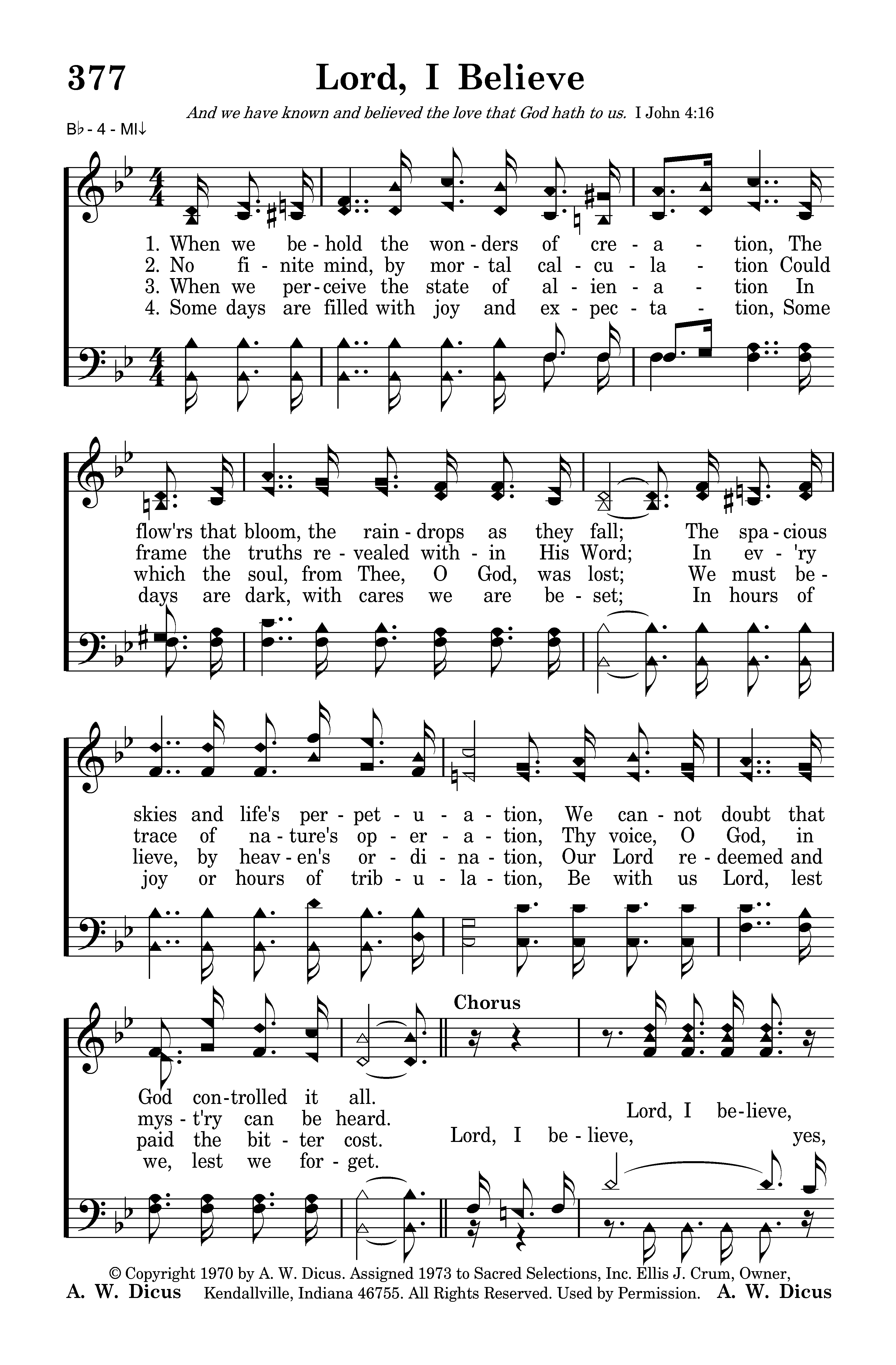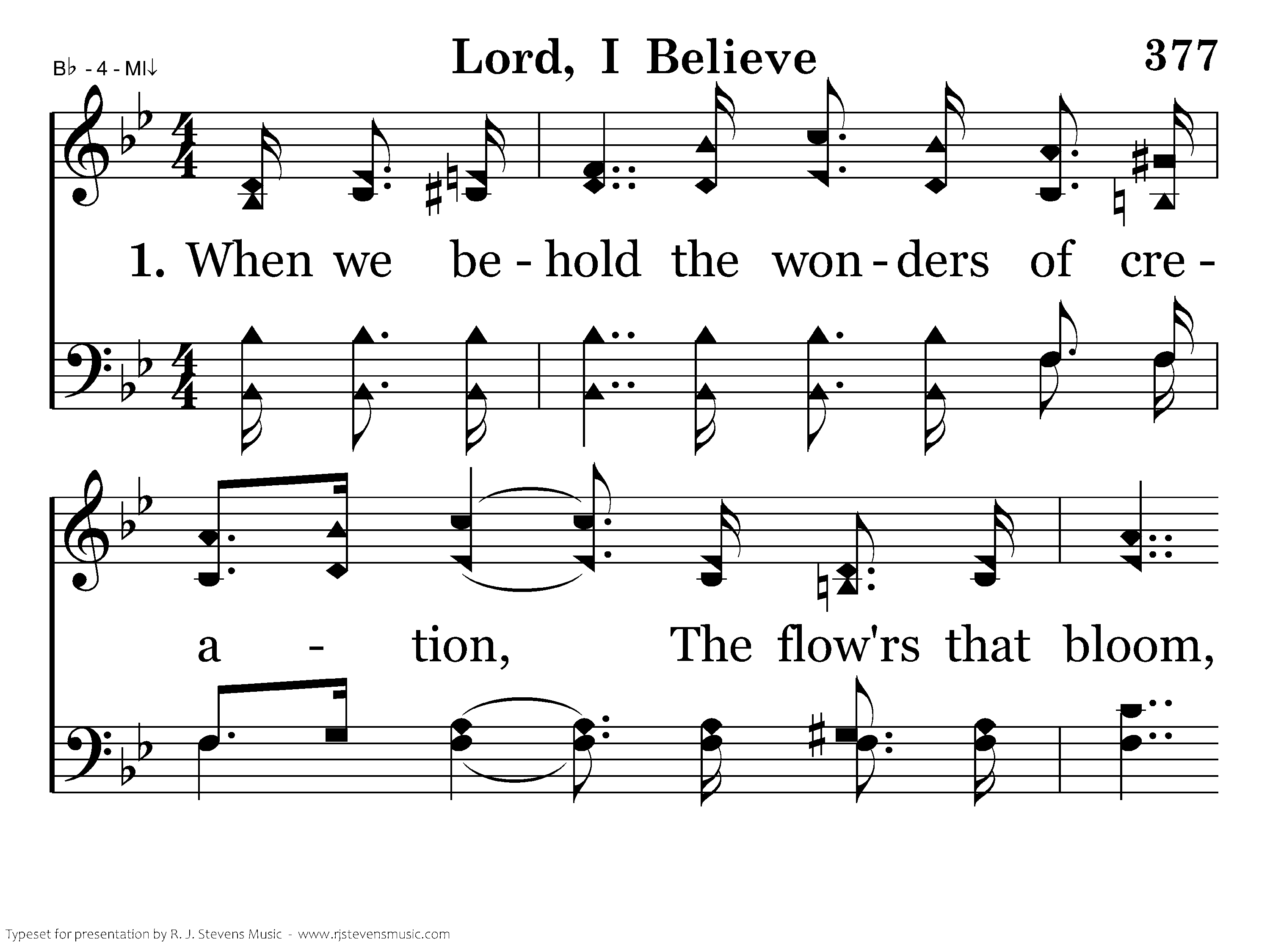 When we behold the wonders of creation, The flow'rs that bloom, the raindrops as they fall; The spacious skies and life's perpetuation, We cannot doubt that God controlled it all.