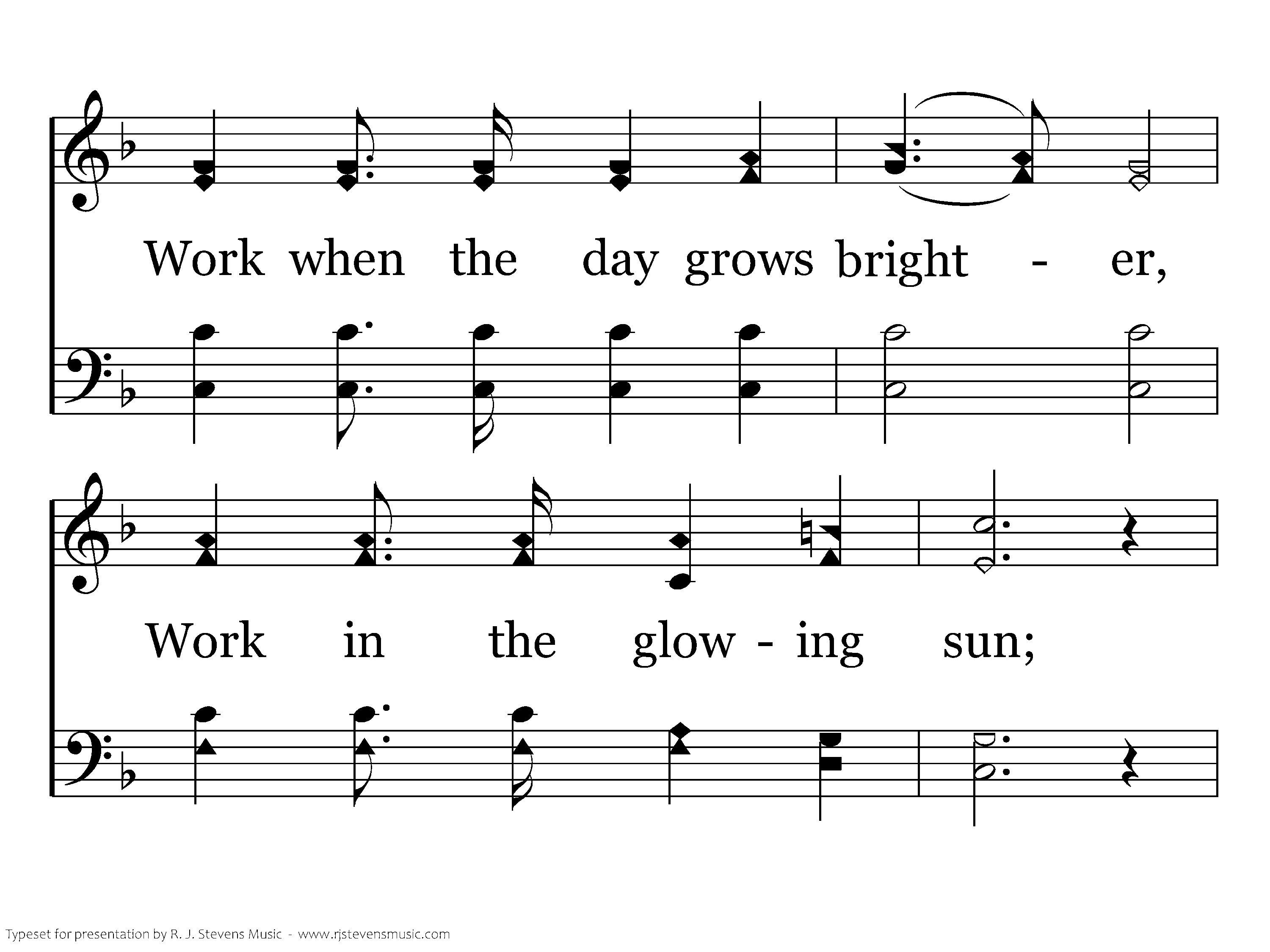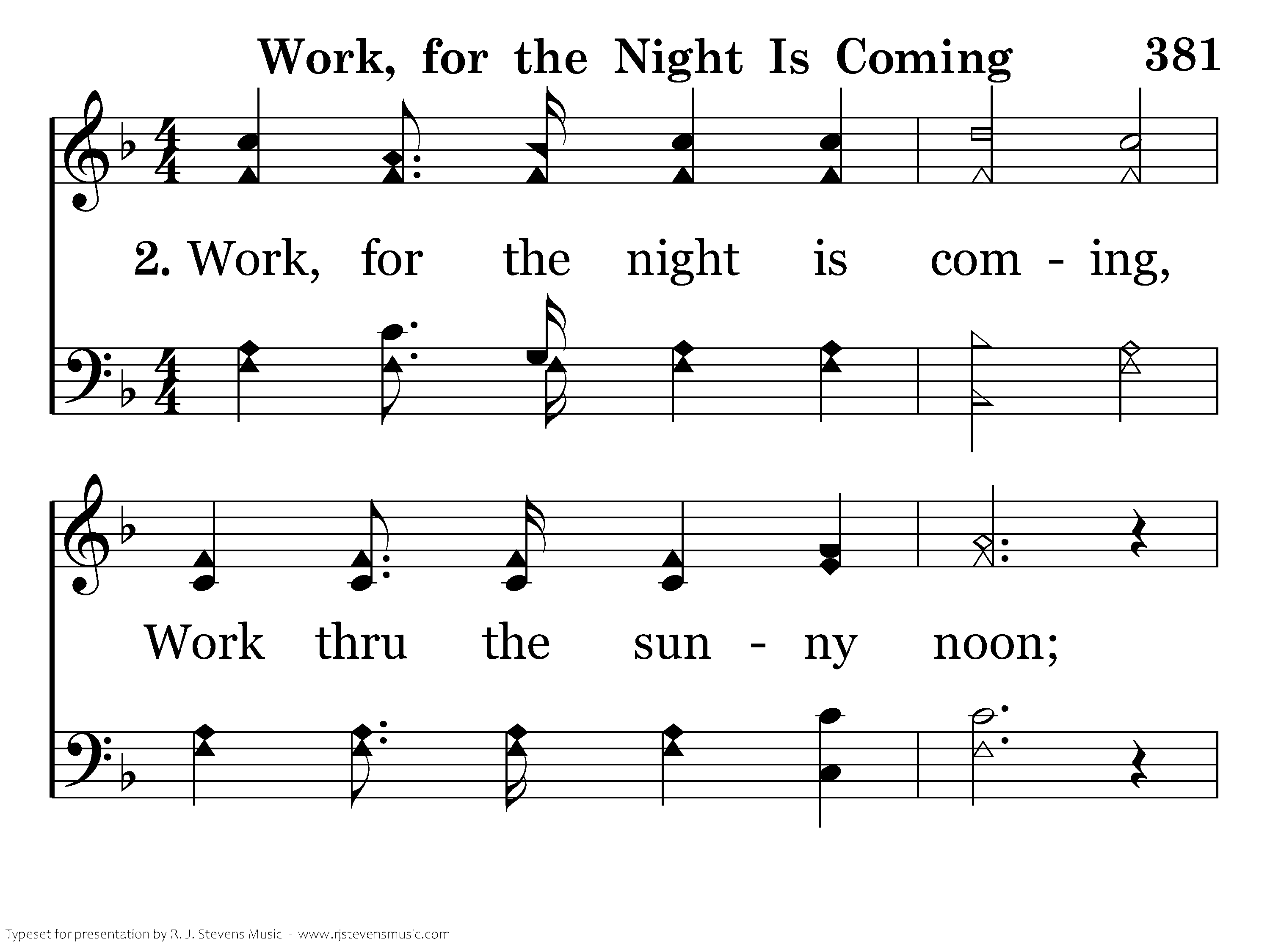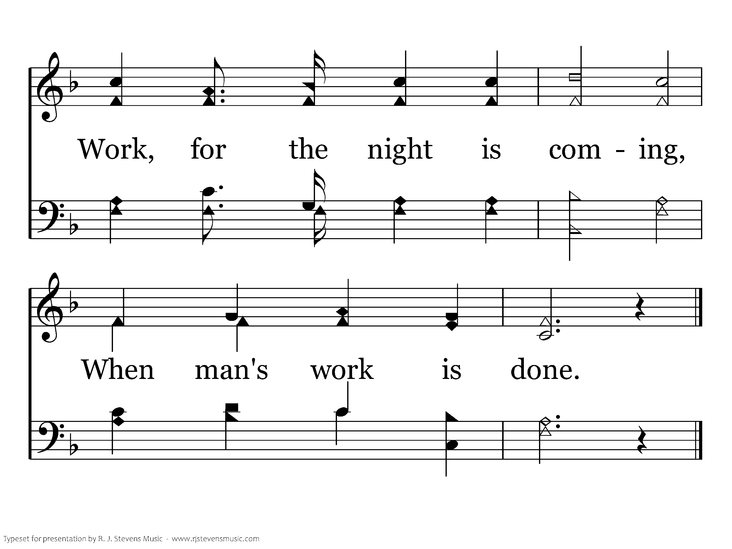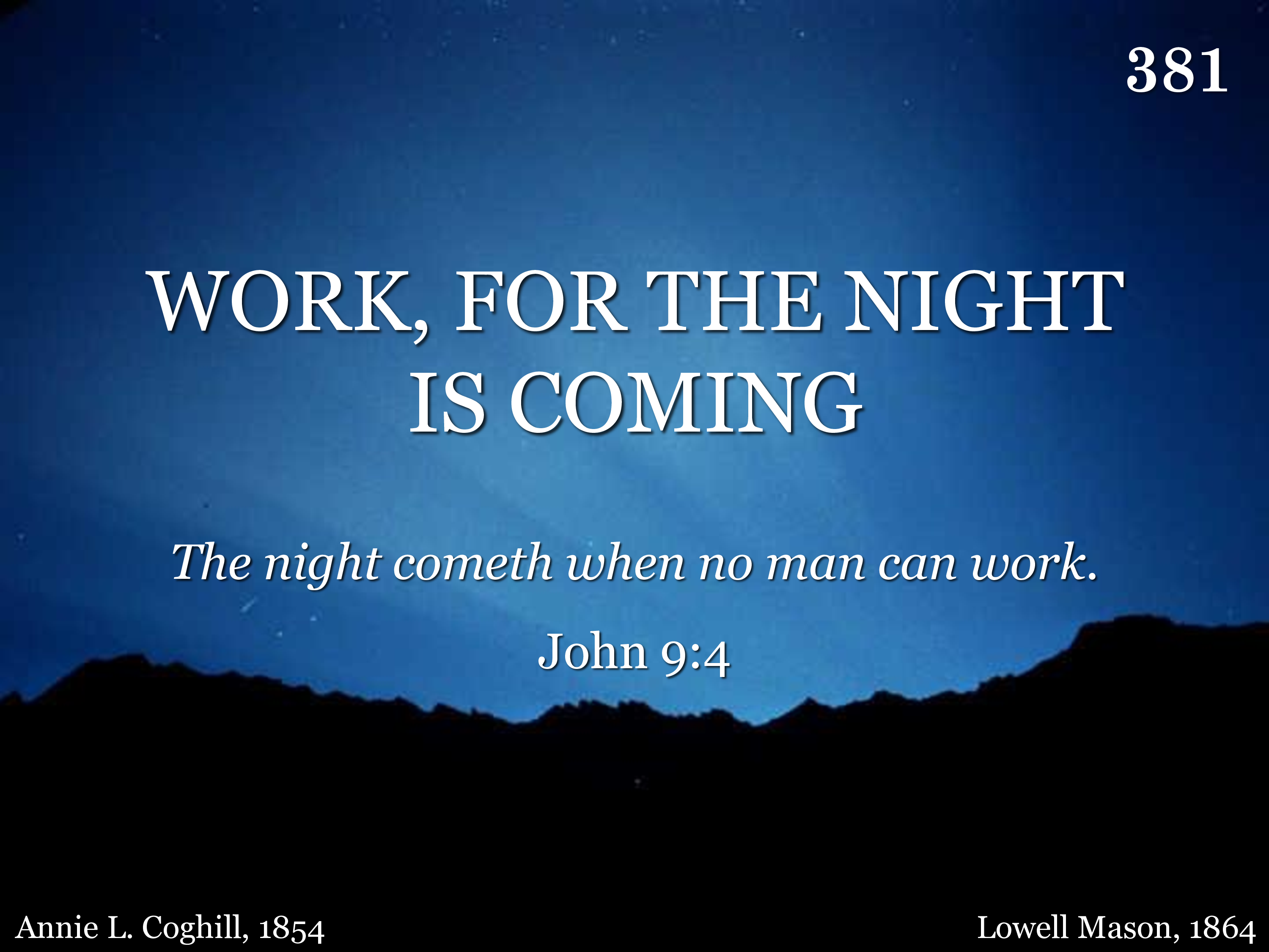 Work, for the night is coming, Work thru the morning hours; Work while the dew is sparkling, Work 'mid springing flow'rs. Work when the day grows brighter, Work in the glowing sun; Work, for the night is coming, When man's work is done.