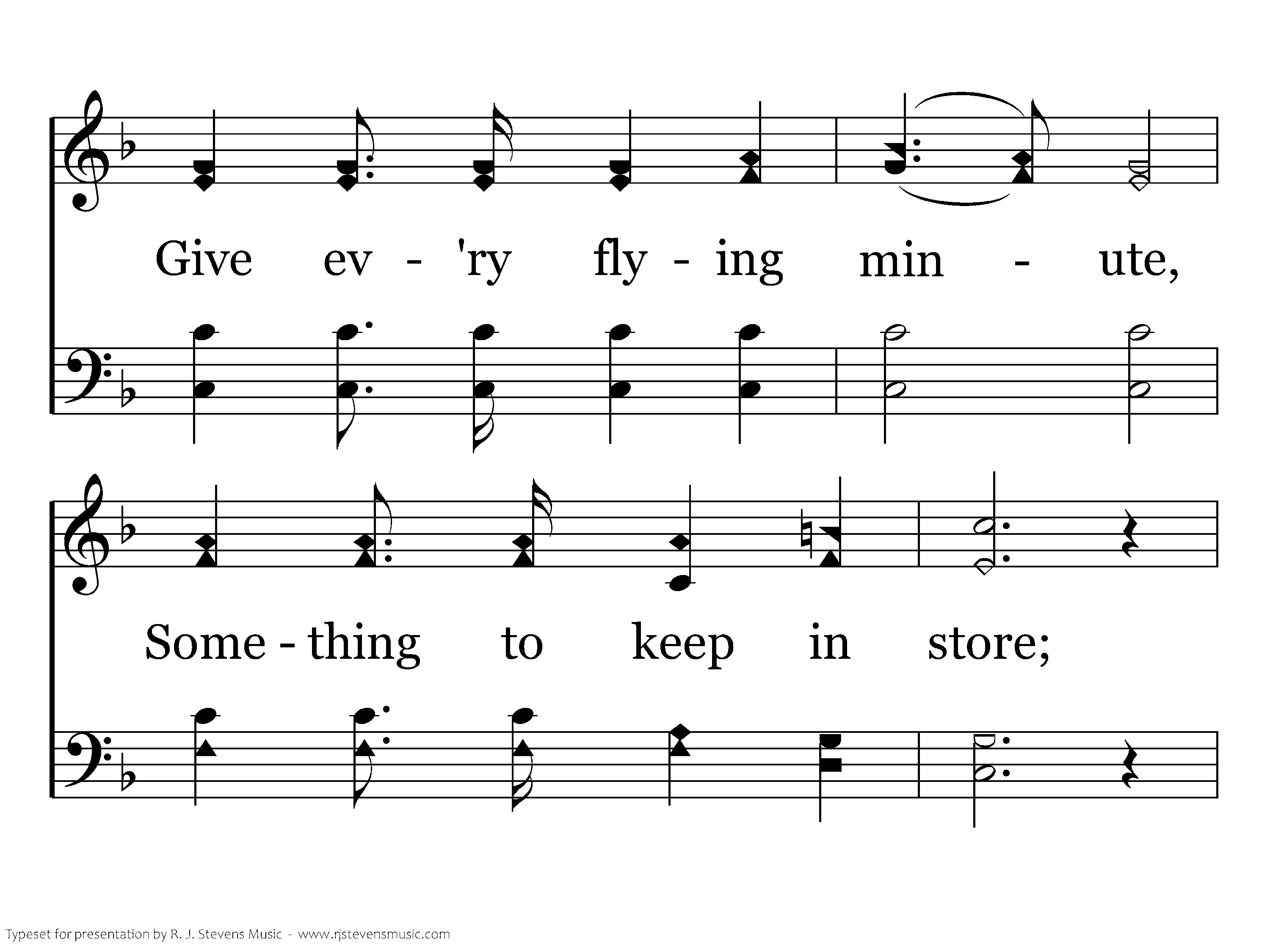 Work, for the night is coming, Work thru the sunny noon; Fill brightest hours with labor, Rest comes sure and soon. Give ev'ry flying minute, Something to keep in store; Work, for the night is coming, When man works no more.