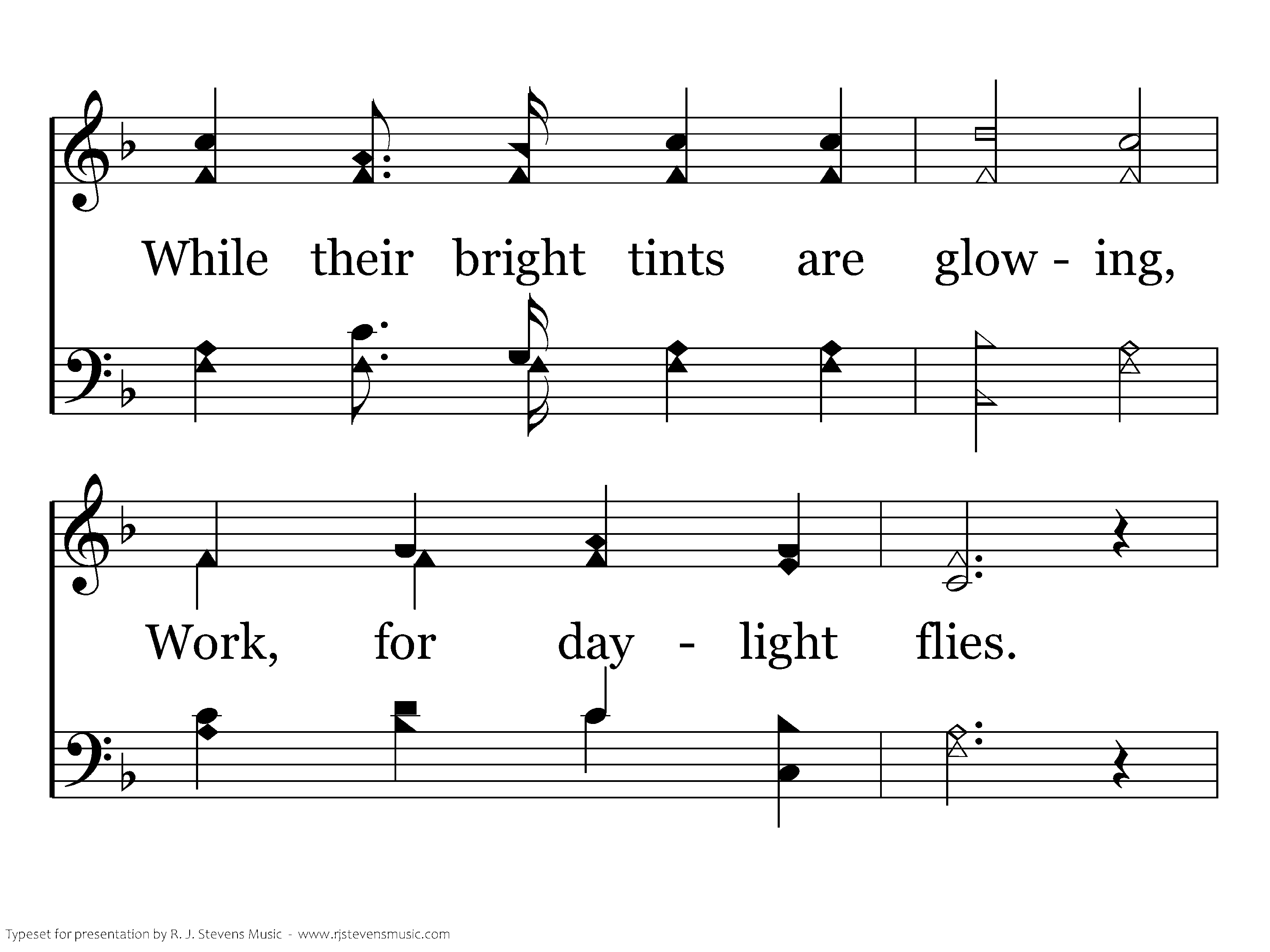Work, for the night is coming, Under the sunset skies; While their bright tints are glowing, Work, for daylight flies. Work till the last beam fadeth, Fadeth to shine no more; Work, while the night is dark'ning, When man's work is o'er.