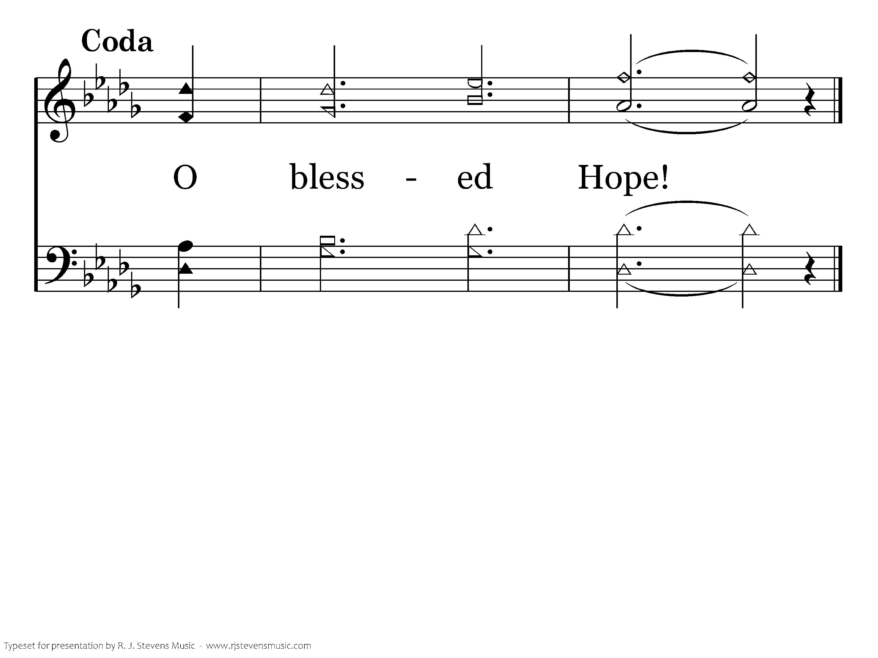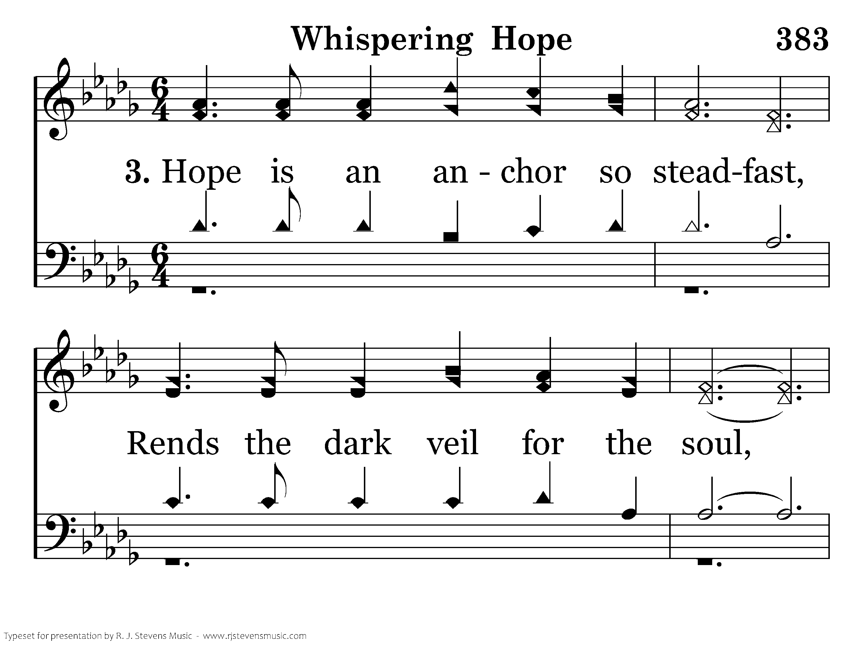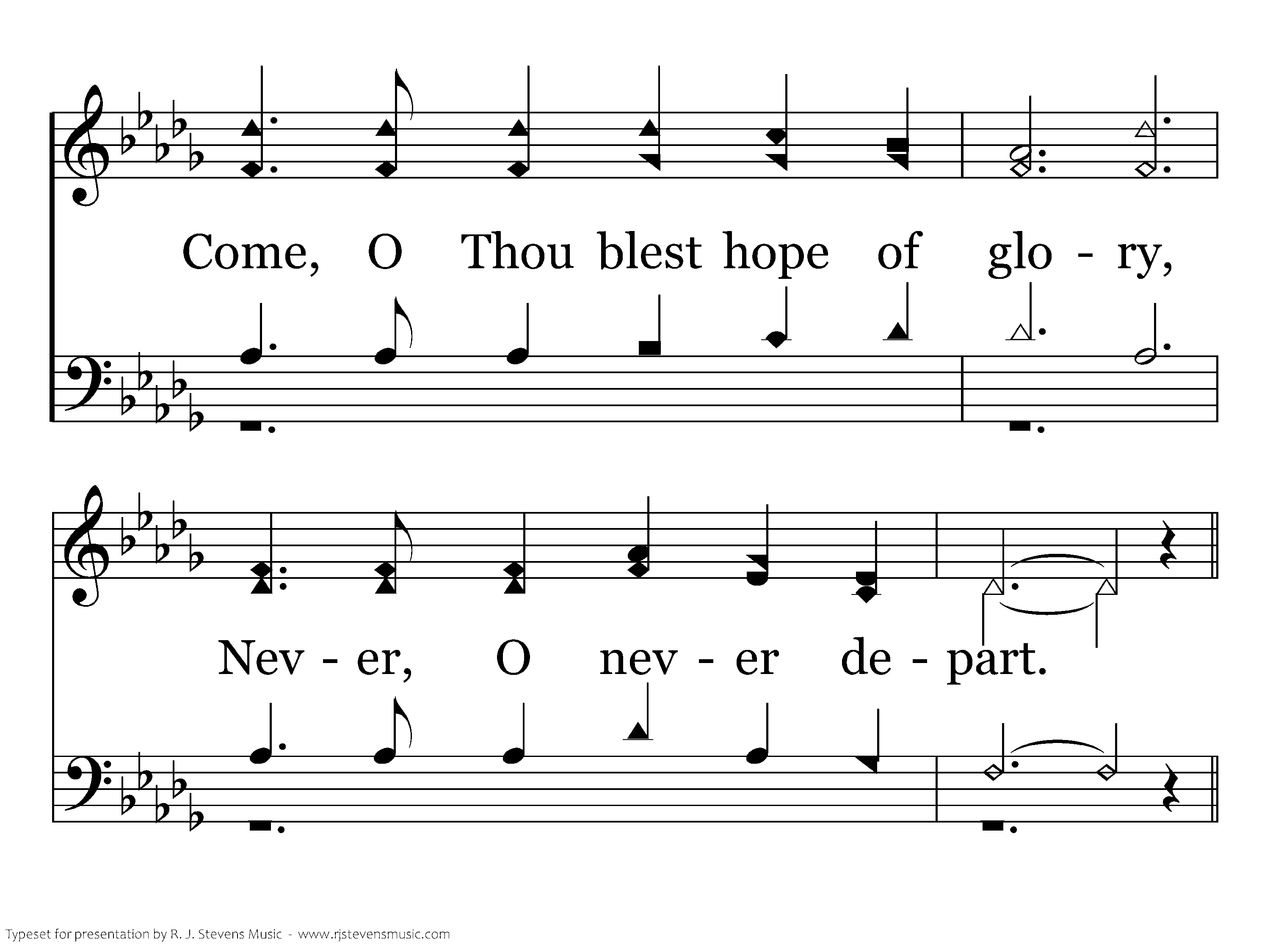 Hope, as an anchor so steadfast, Rends the dark veil for the soul, Whither the Master has entered, Robbing the grave of its goal; Come then, O come, glad fruition, Come to my sad, weary heart; Come, O Thou blest hope of glory, Never, O never depart.
