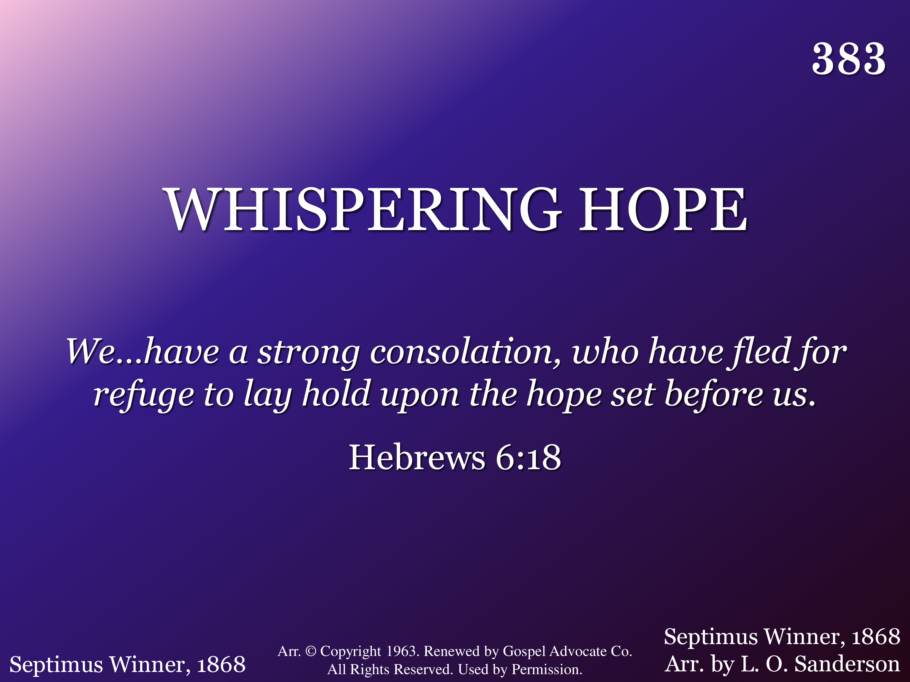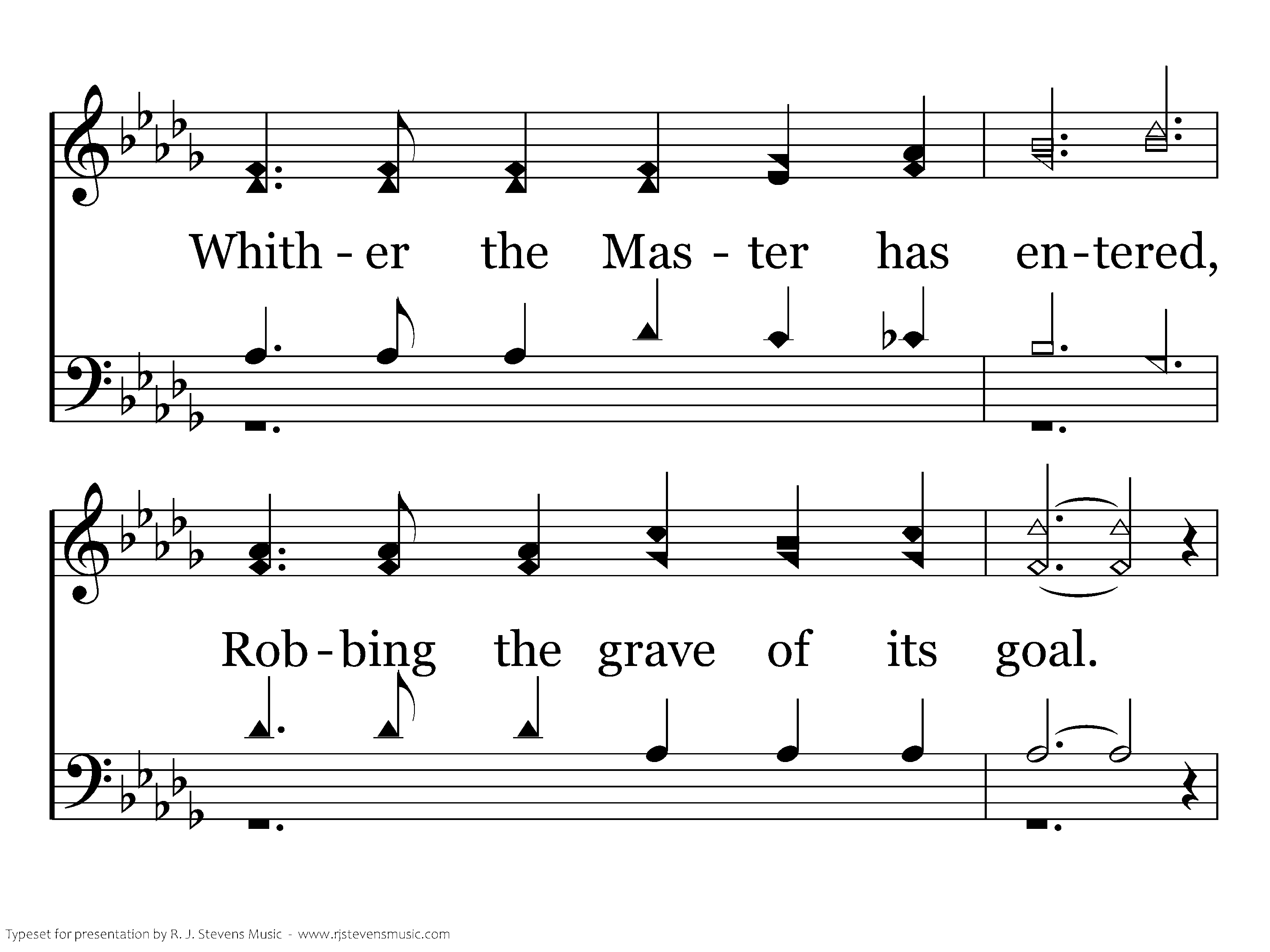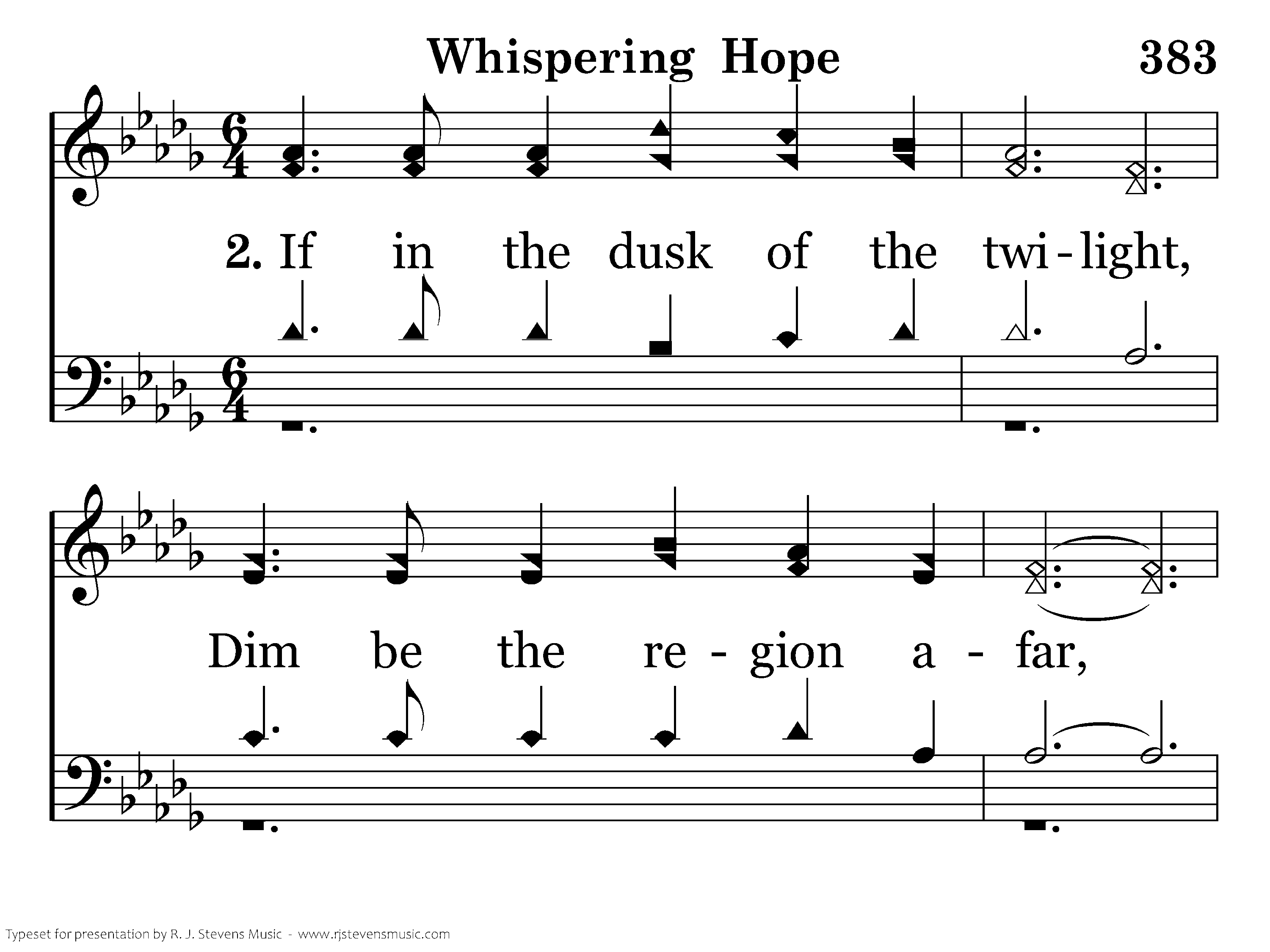 Hope, as an anchor so steadfast, Rends the dark veil for the soul, Whither the Master has entered, Robbing the grave of its goal; Come then, O come, glad fruition, Come to my sad, weary heart; Come, O Thou blest hope of glory, Never, O never depart.
