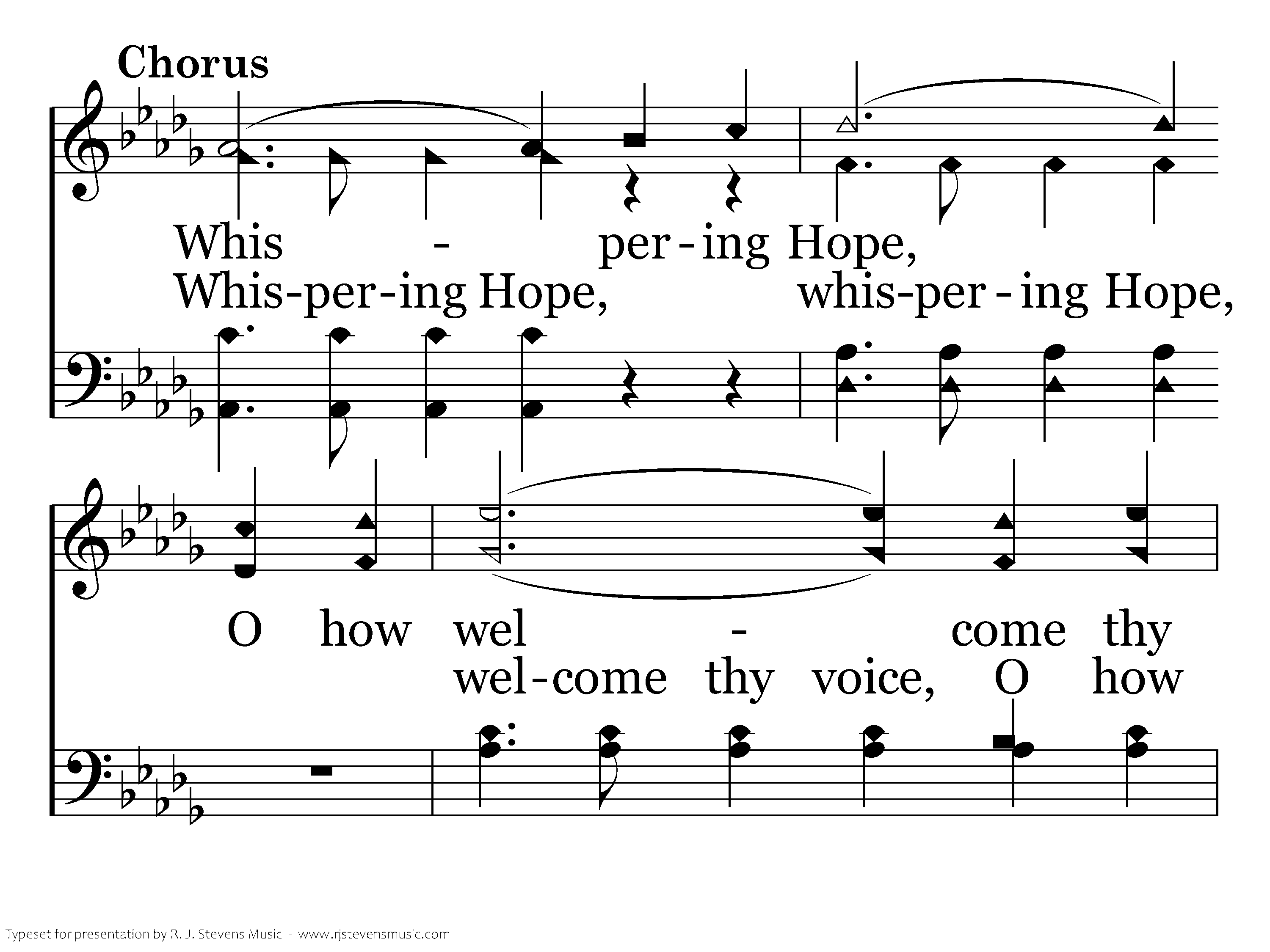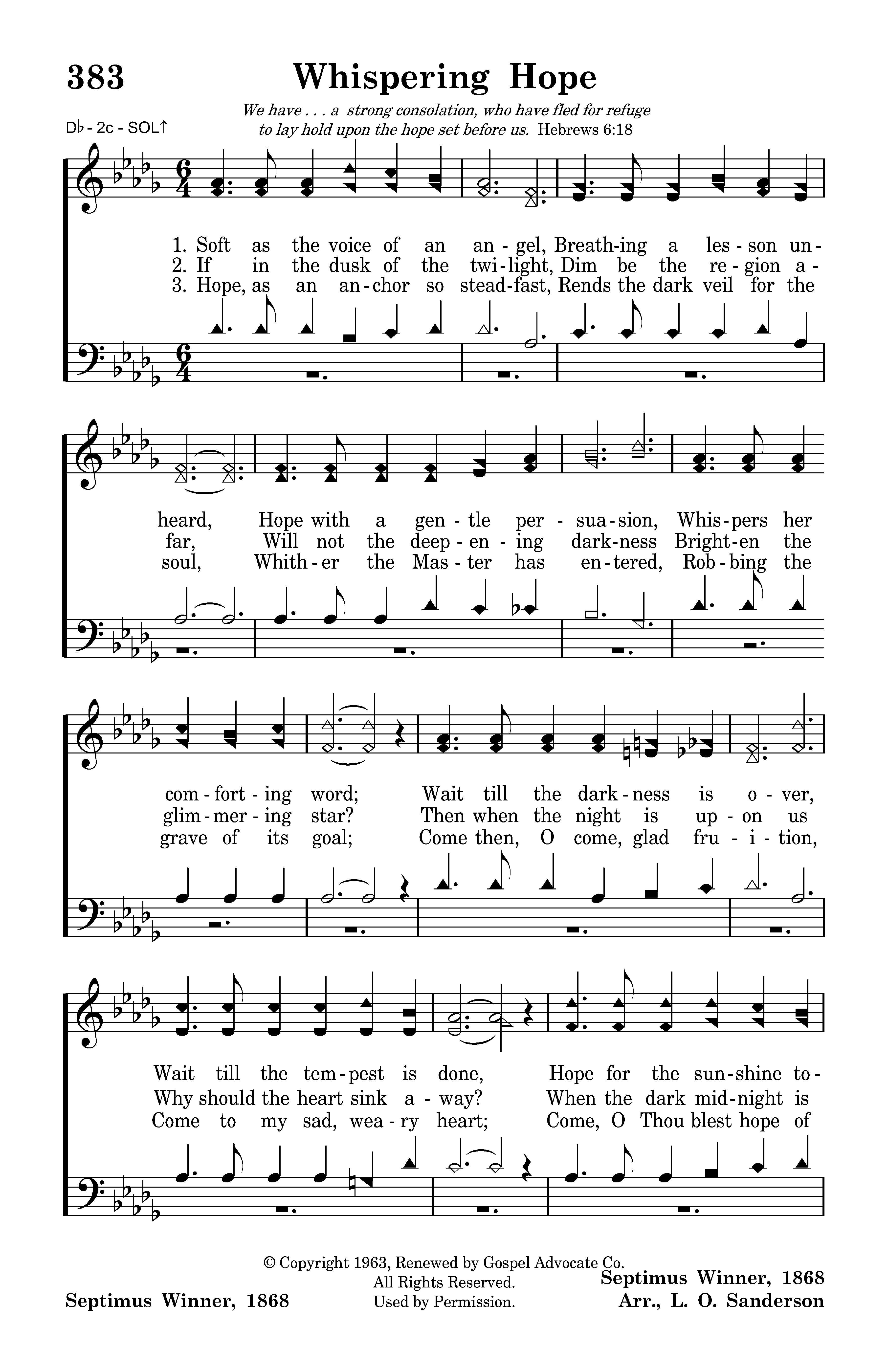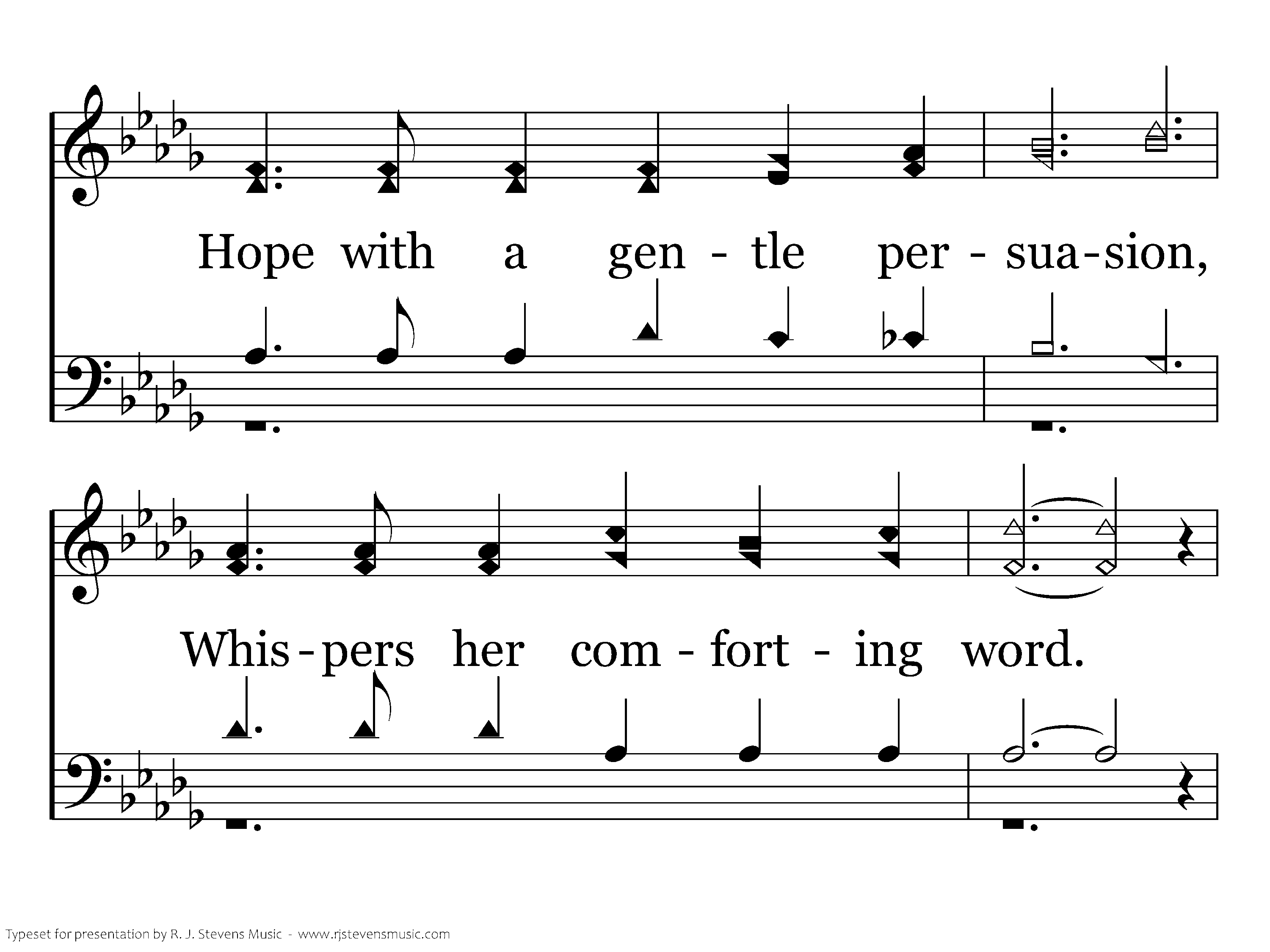 Soft as the voice of an angel, Breathing a lesson unheard, Hope with a gentle persuasion, Whispers her comforting word; Wait till the darkness is over, Wait till the tempest is done, Hope for the sunshine tomorrow, After the shower is gone.