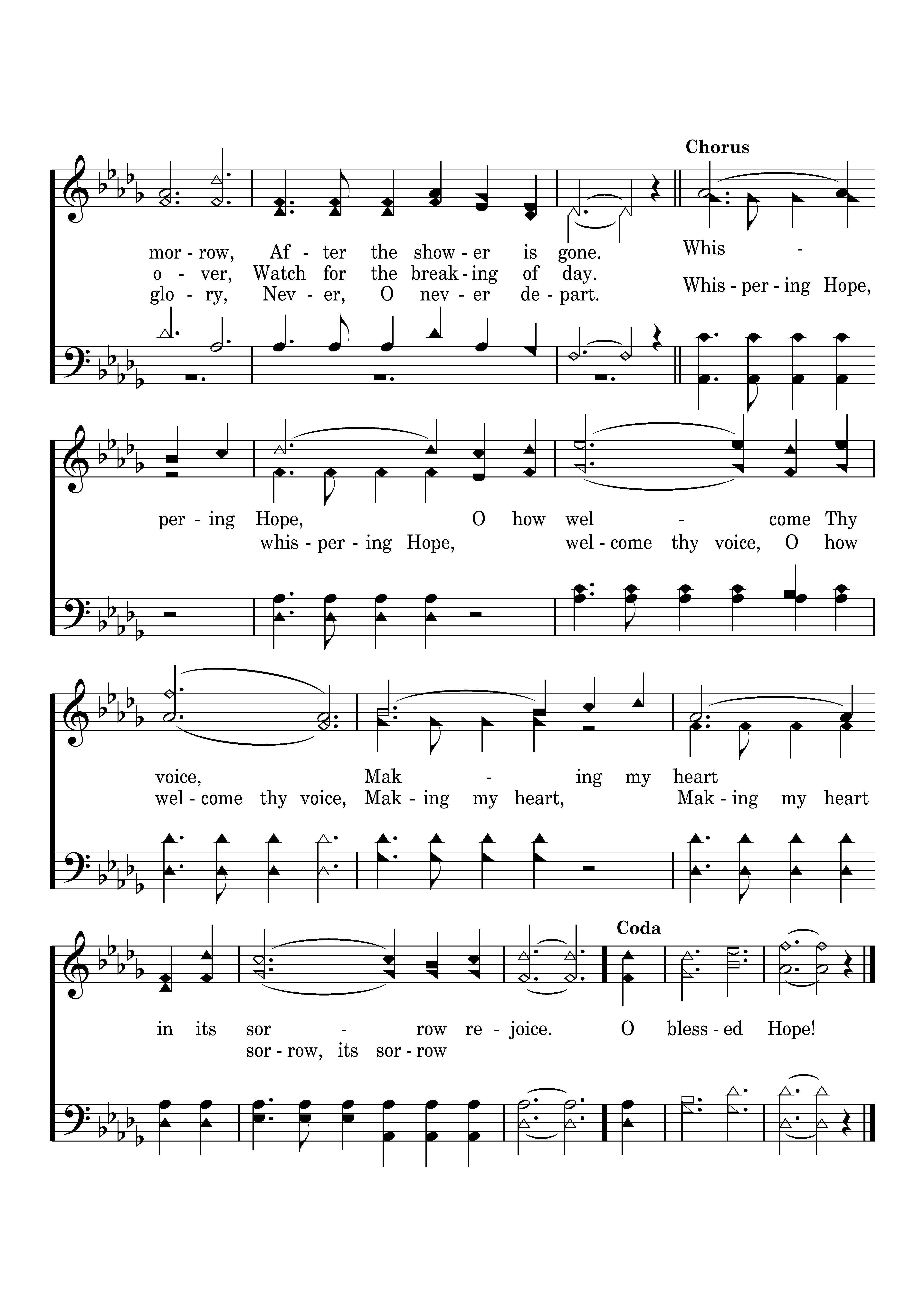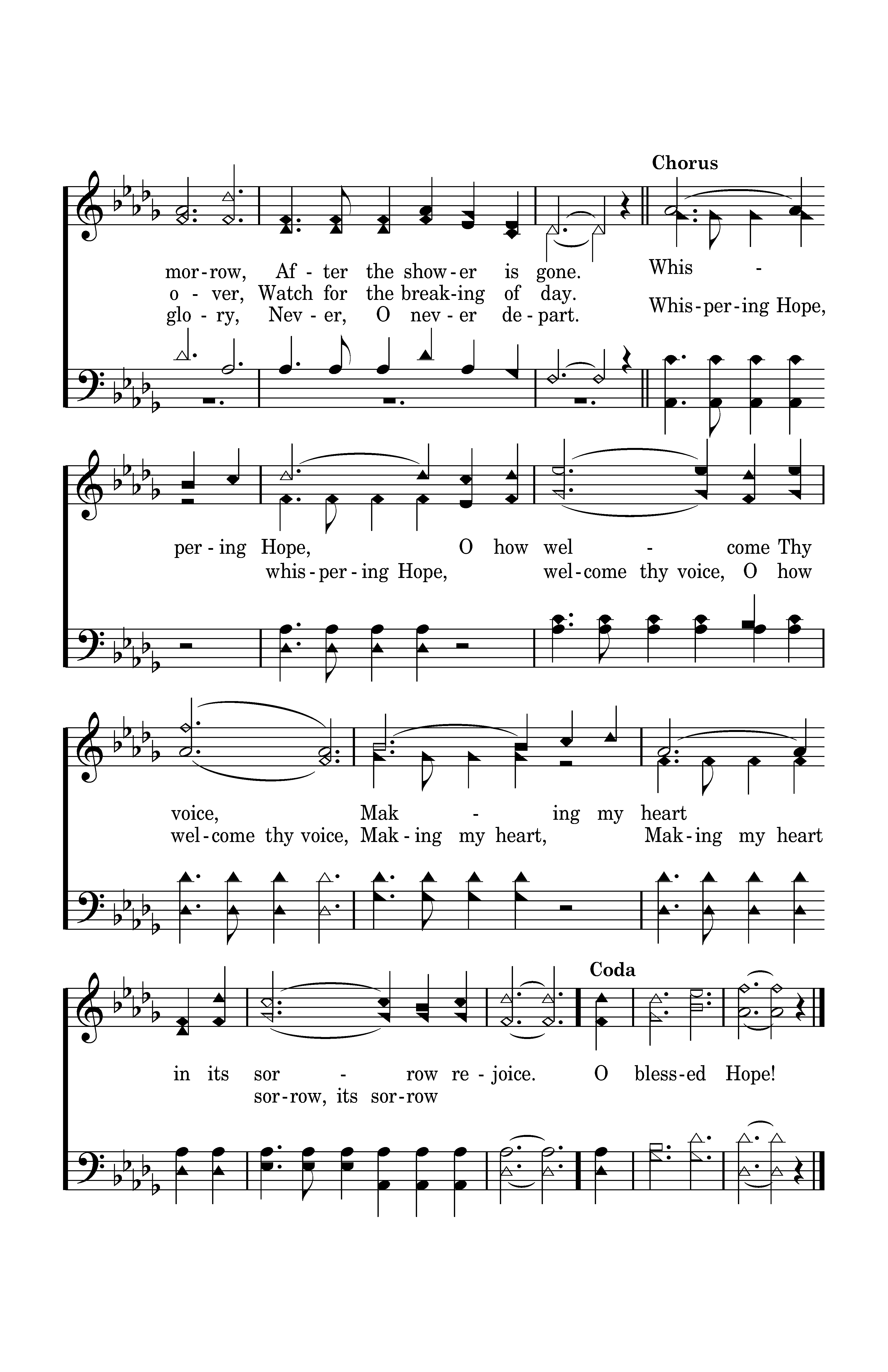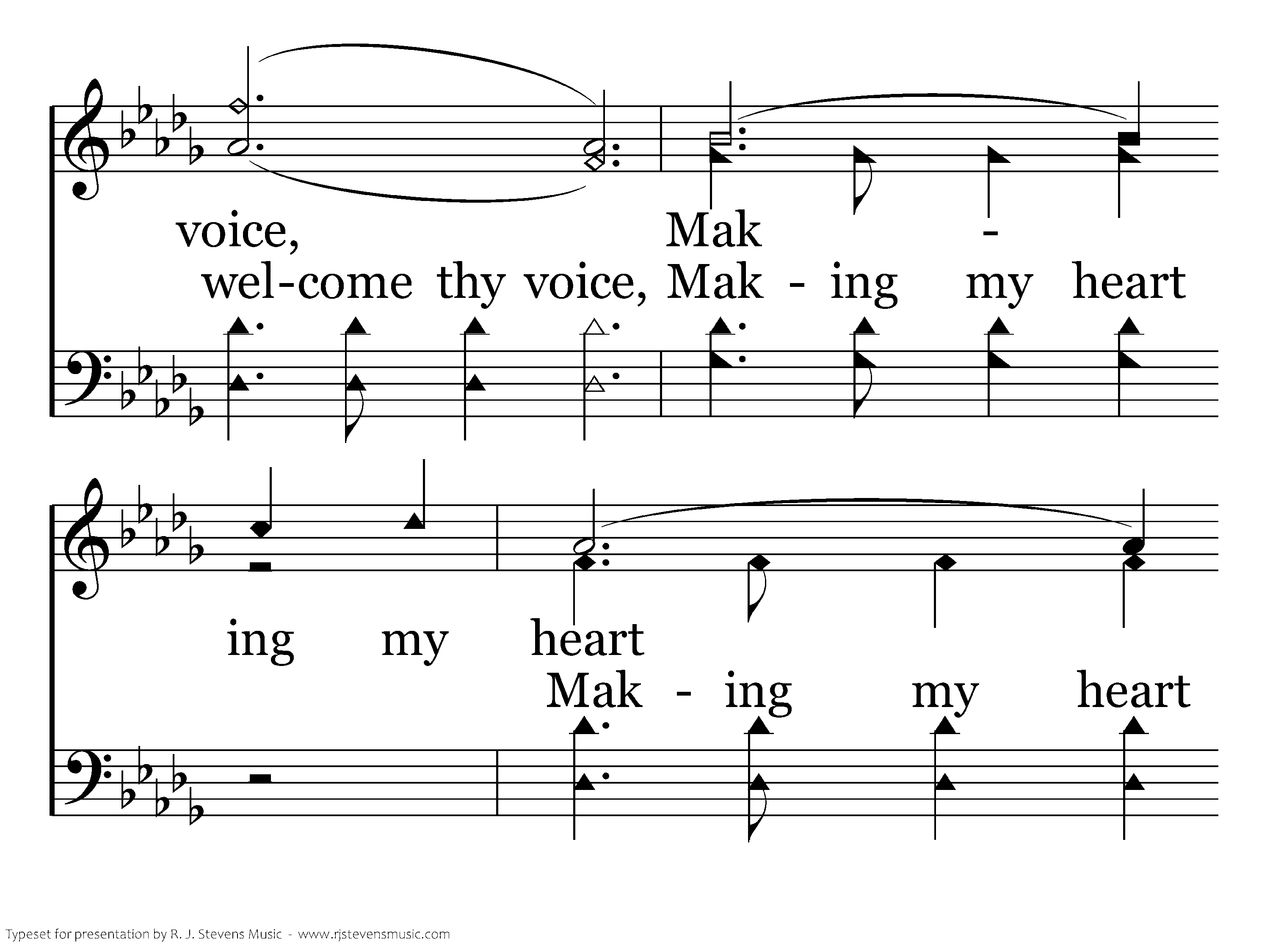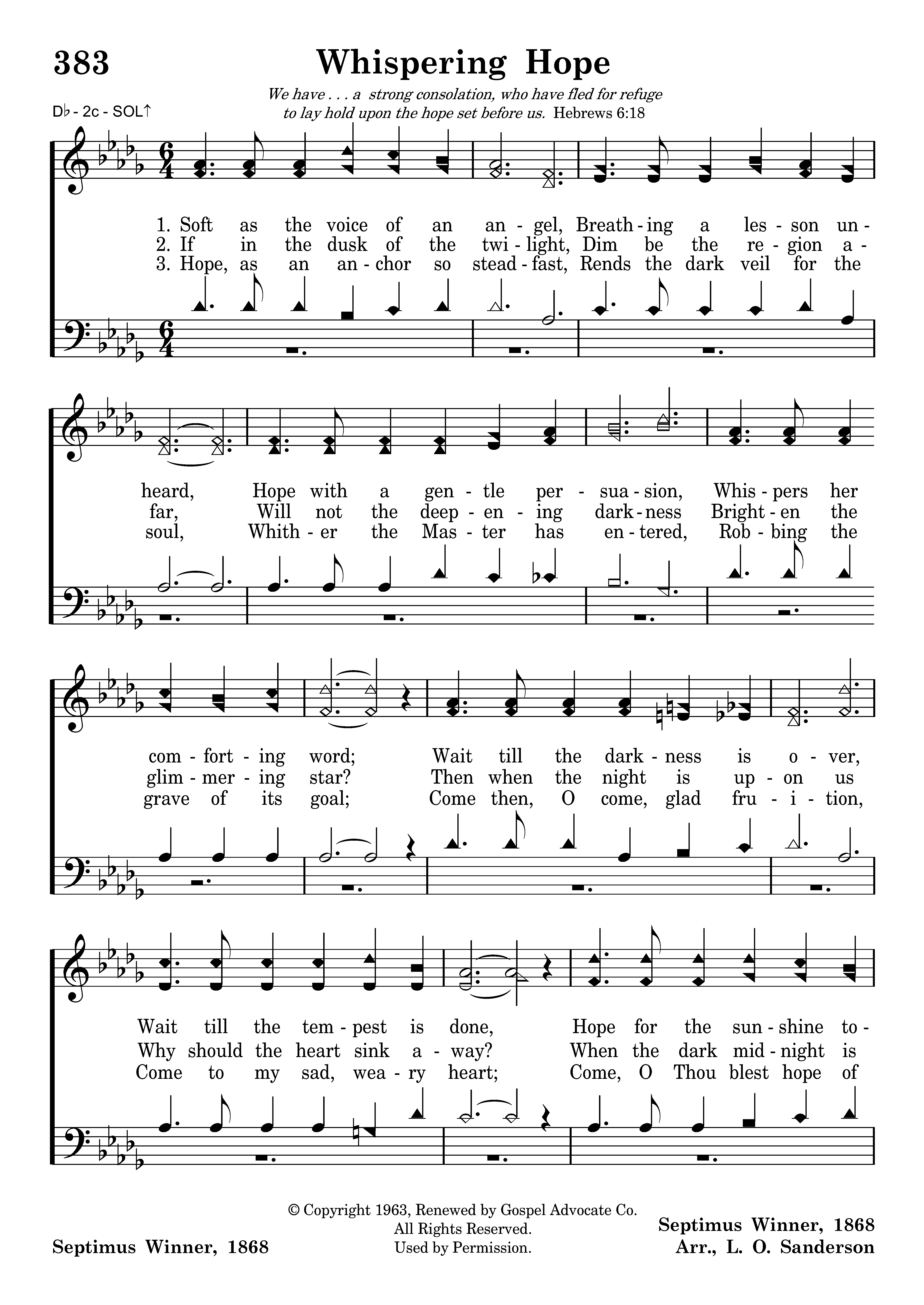 Soft as the voice of an angel, Breathing a lesson unheard, Hope with a gentle persuasion, Whispers her comforting word; Wait till the darkness is over, Wait till the tempest is done, Hope for the sunshine tomorrow, After the shower is gone.