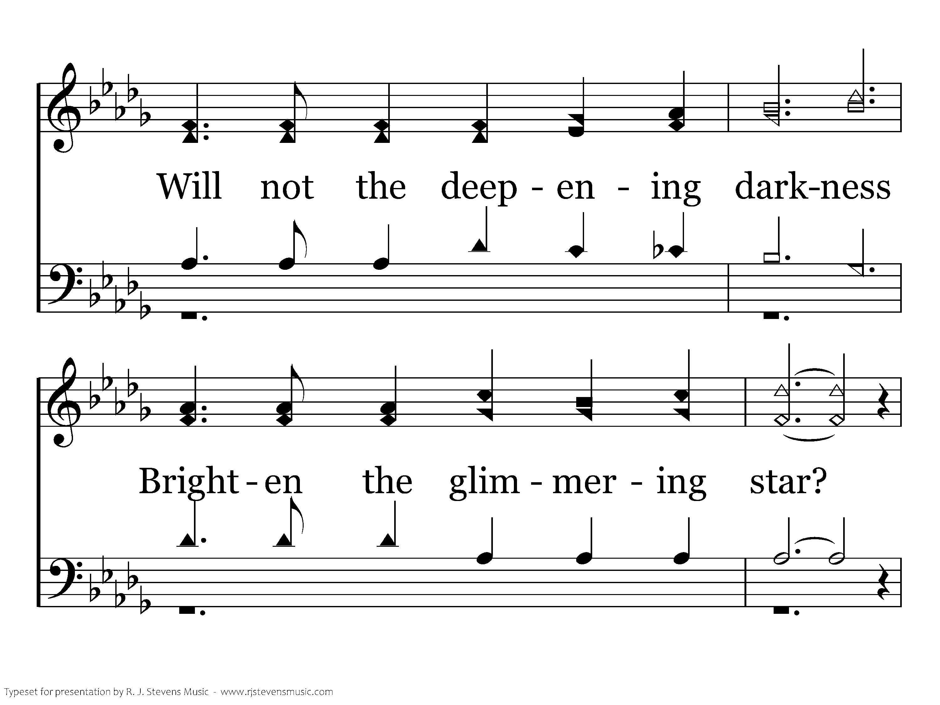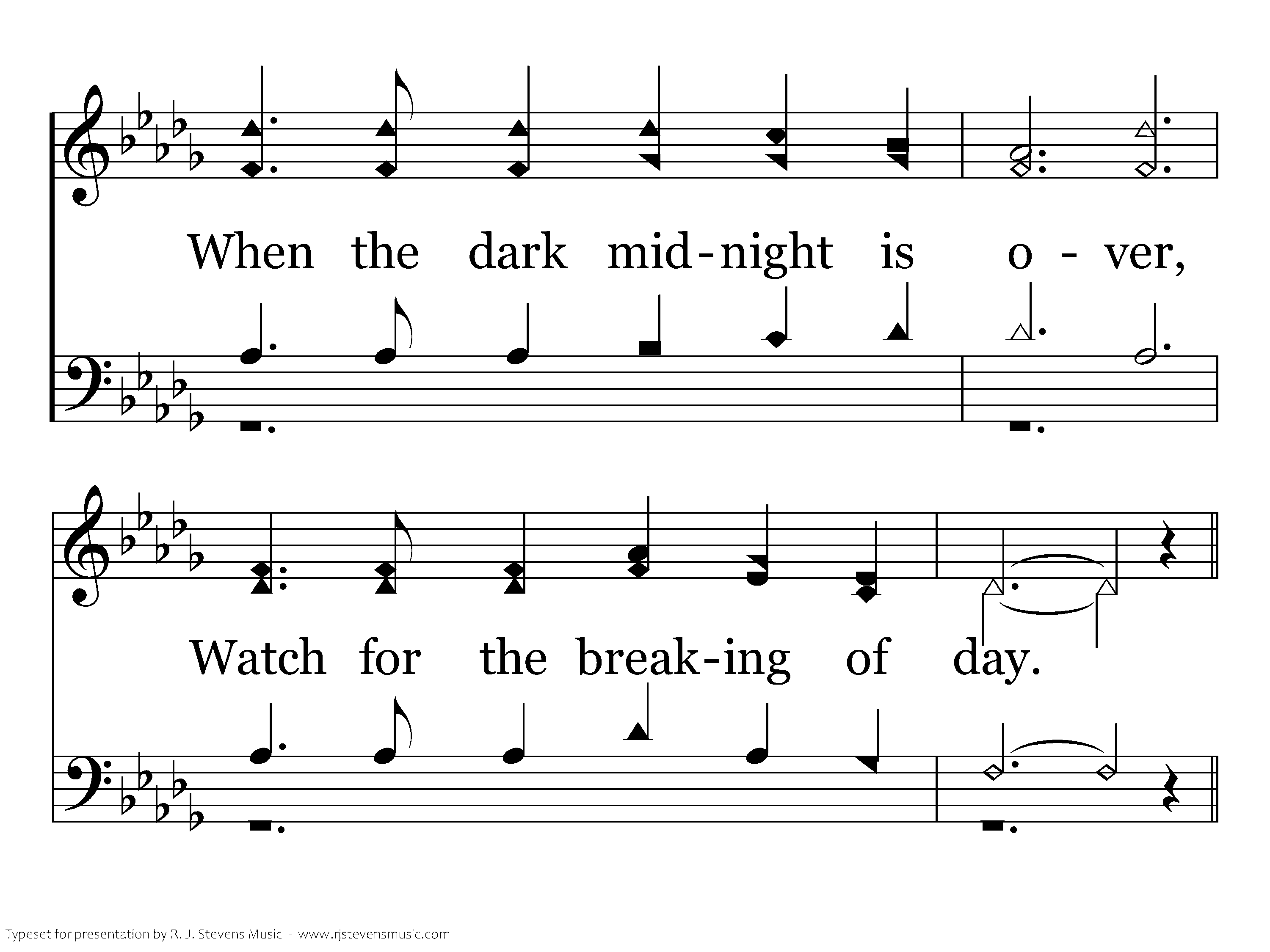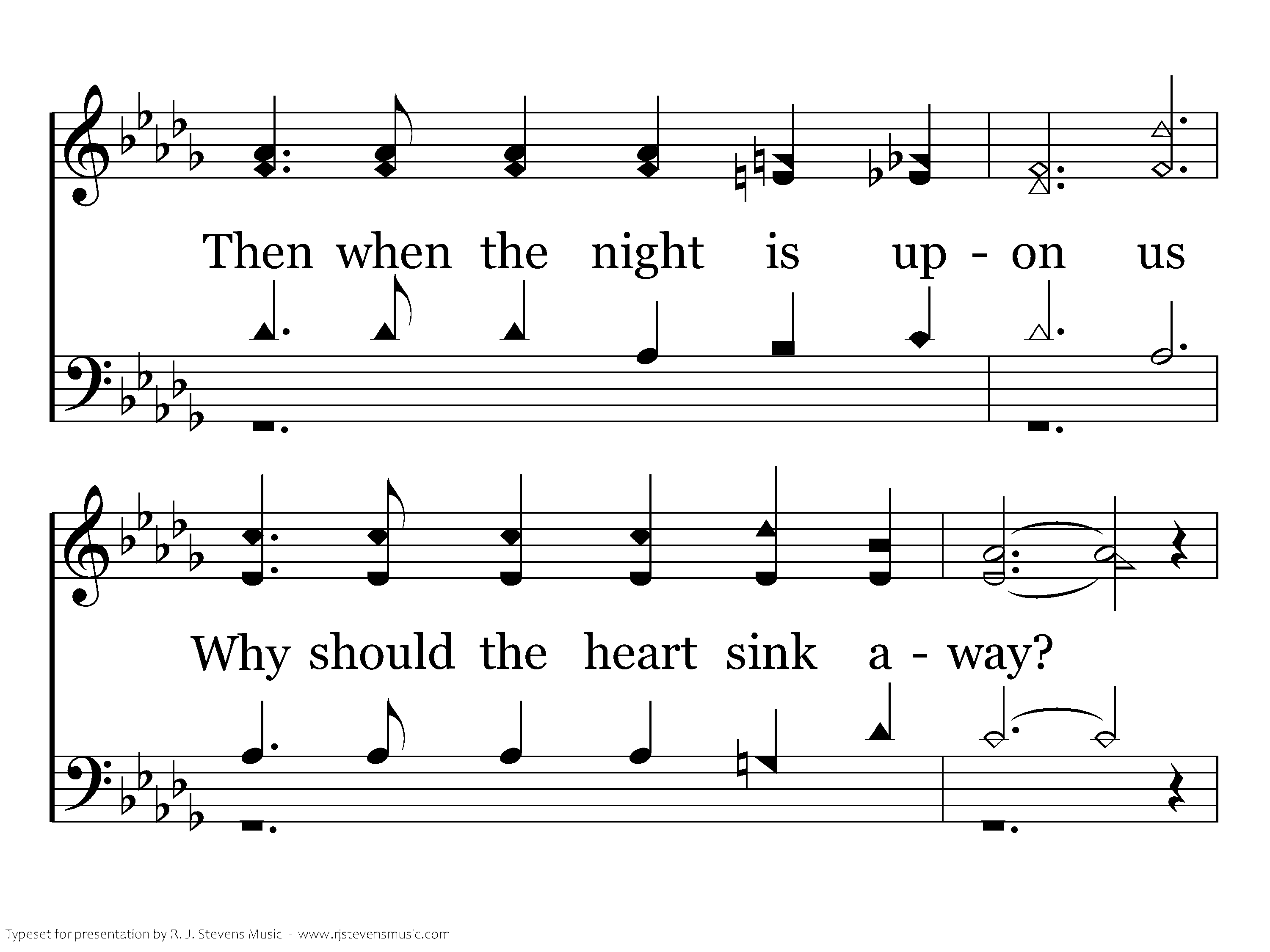 If in the dusk of the twilight, Dim be the region afar, Will not the deepening darkness Brighten the glimmering star? Then when the night is upon us Why should the heart sink away? When the dark midnight is over, Watch for the breaking of day.