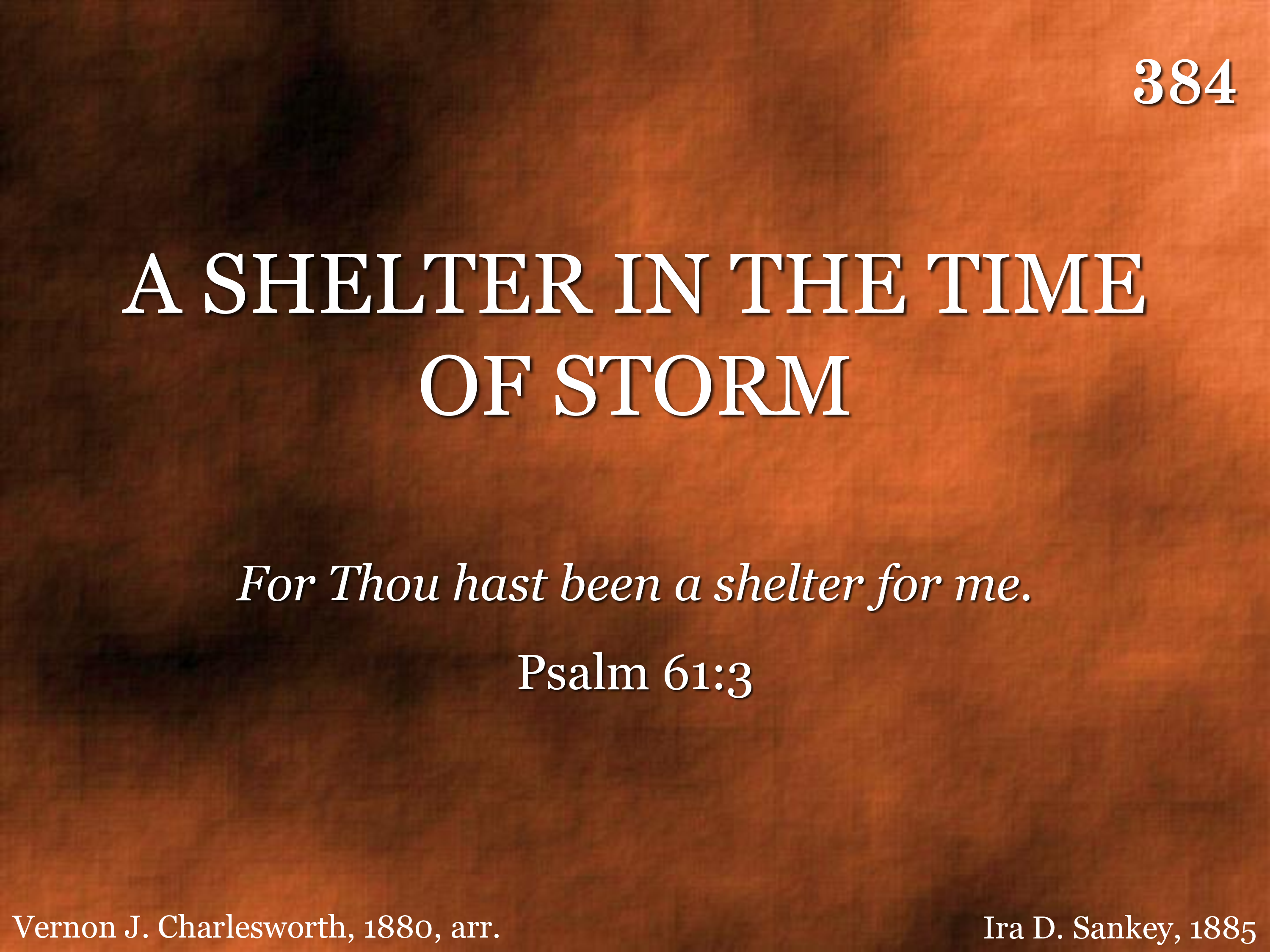 A shade by day, defence by night, A shelter in the time of storm; No fears alarm, no foes affright, A shelter in the time of storm.