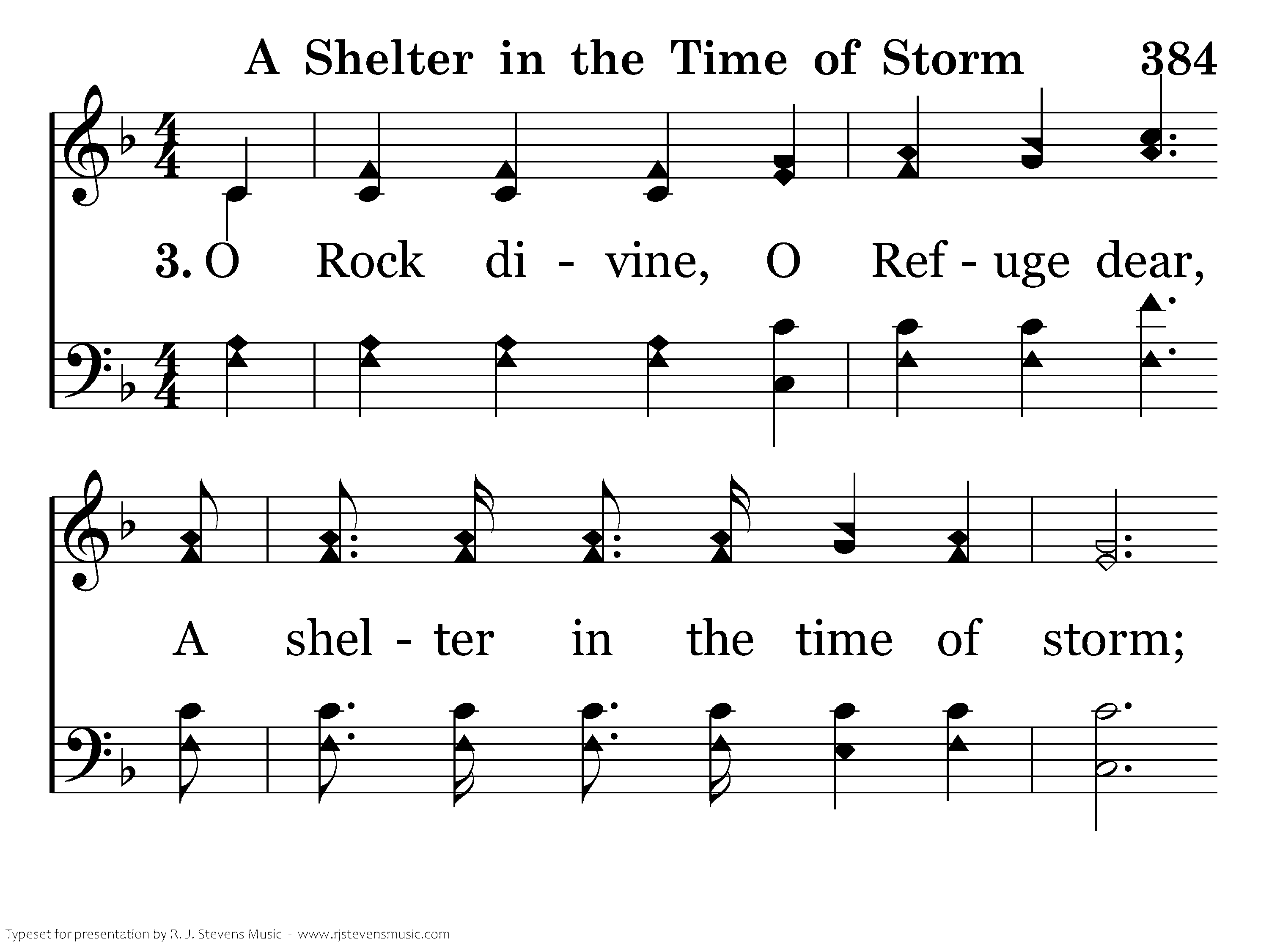 O Rock divine, O Refuge dear, A shelter in the time of storm; Be Thou our helper ever near, A shelter in the time of storm.