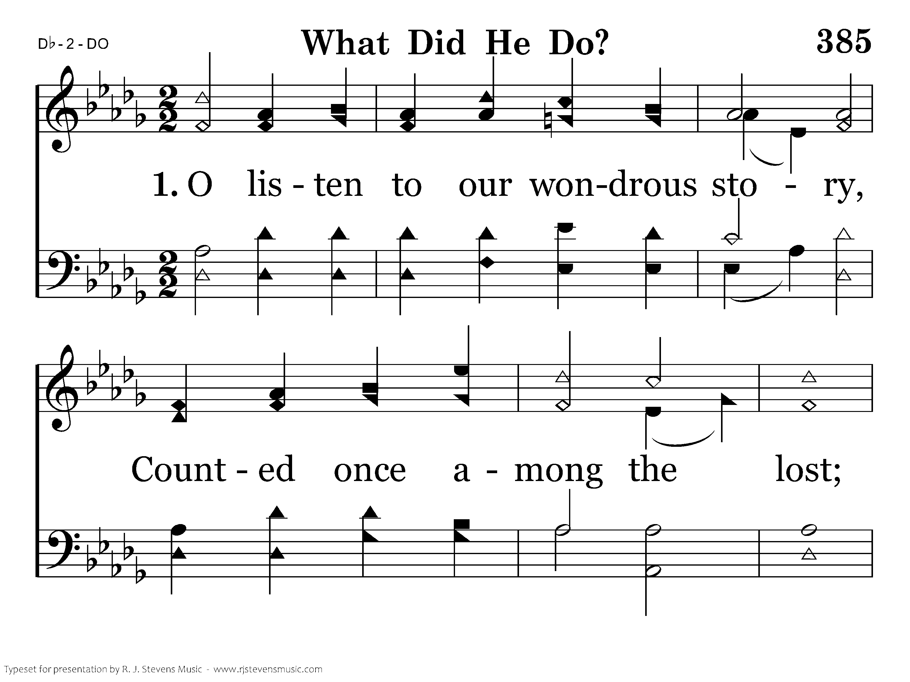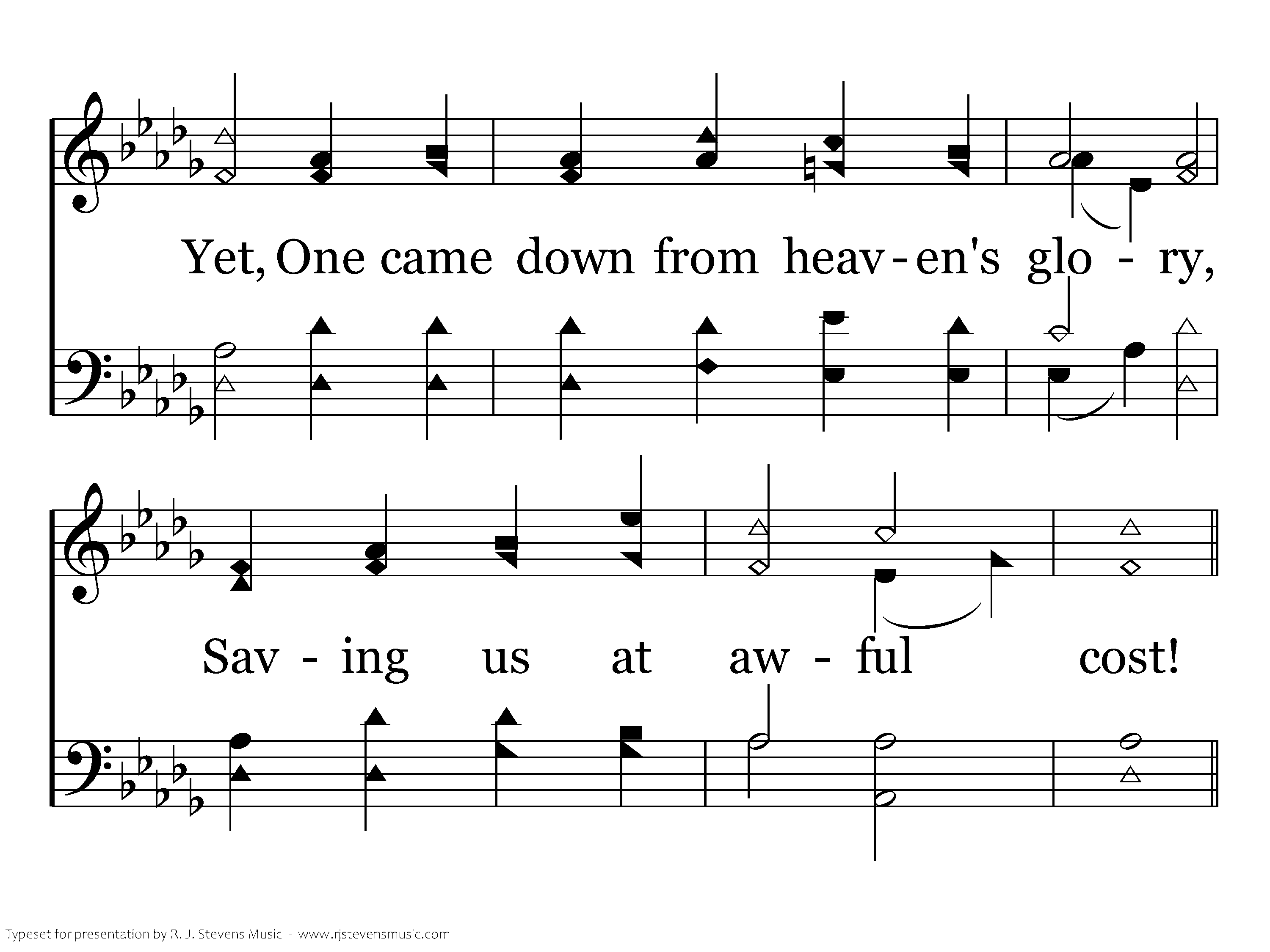 O listen to our wondrous story, Counted once among the lost; Yet, One came down from heaven's glory, Saving us at awful cost!