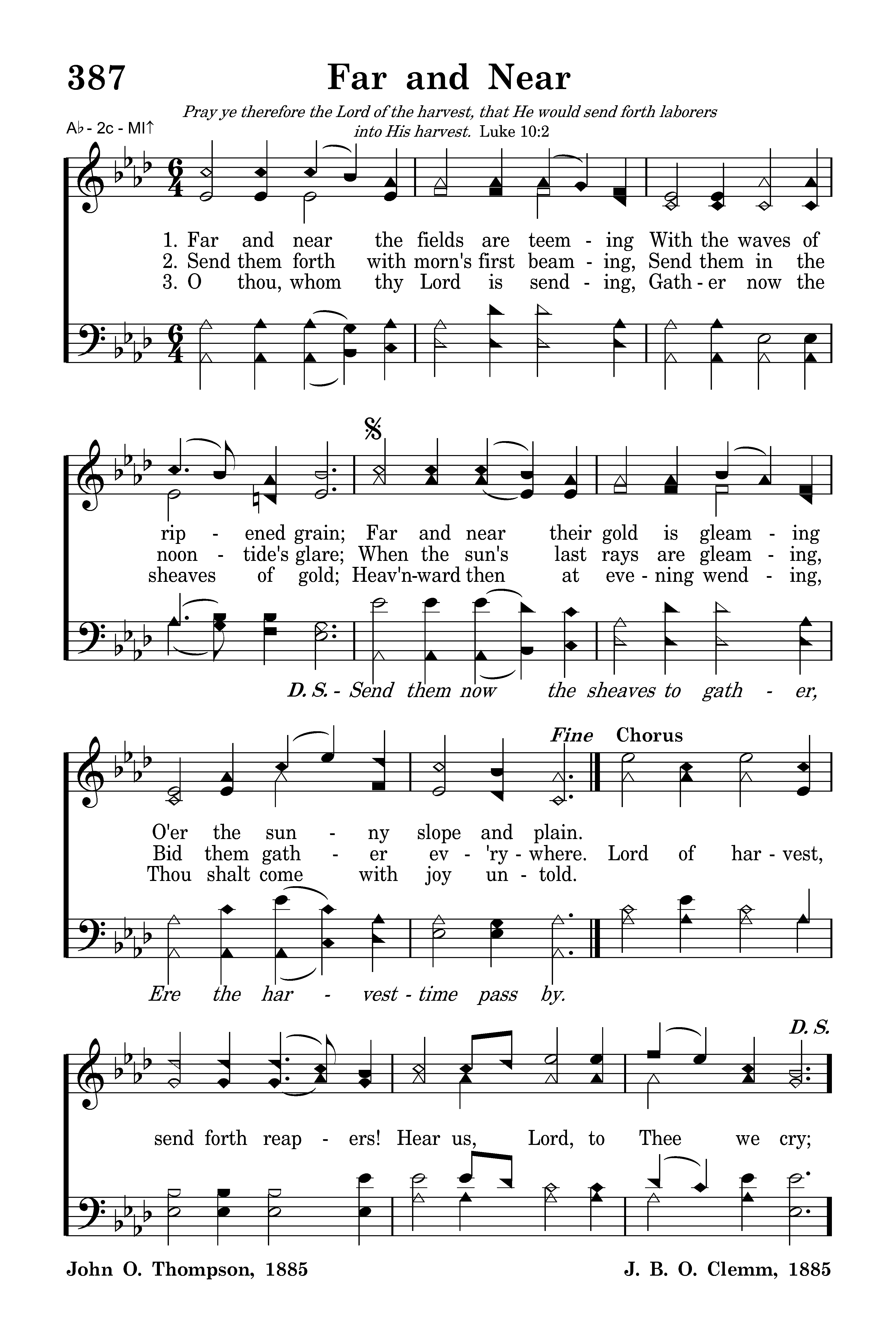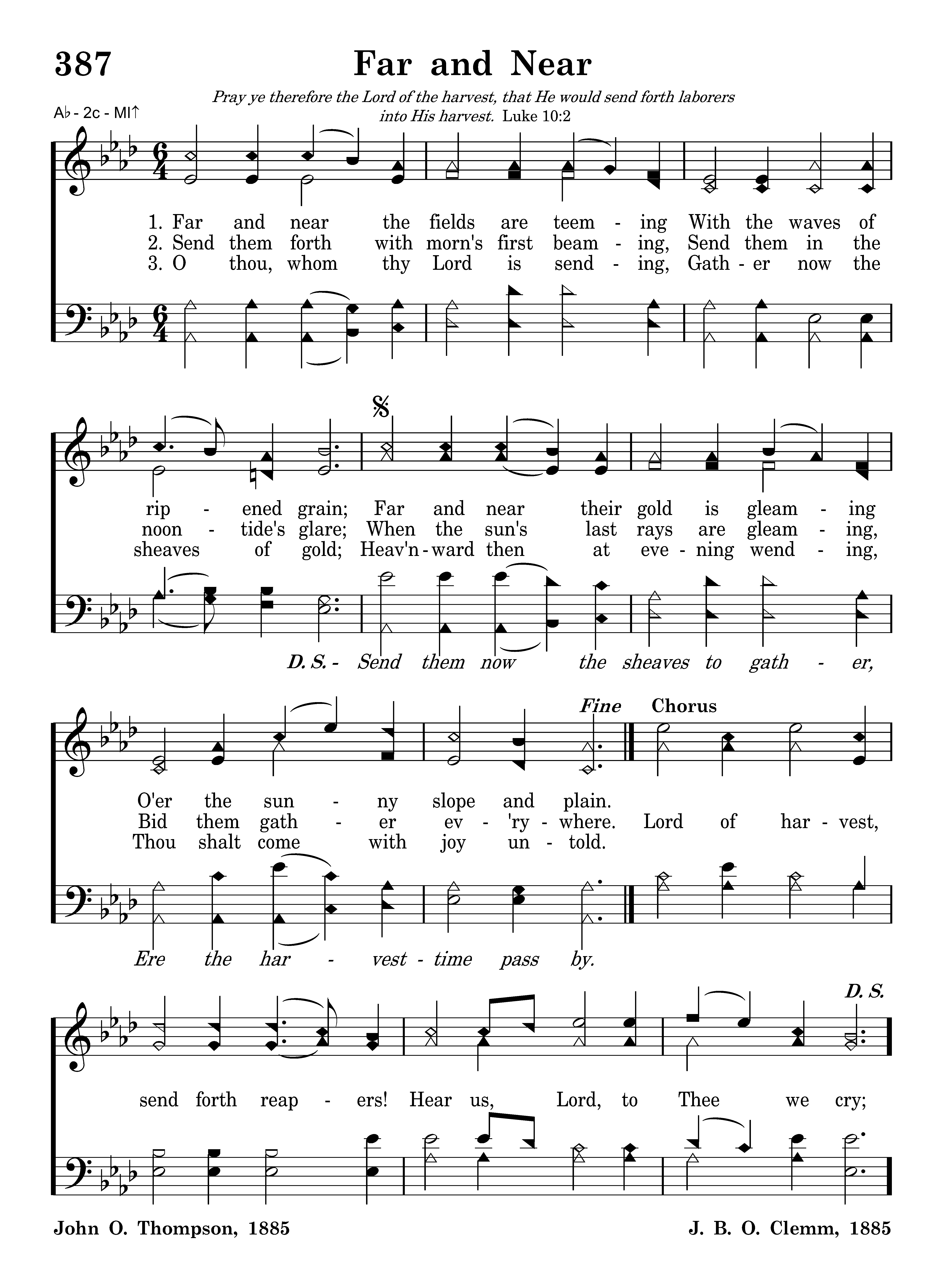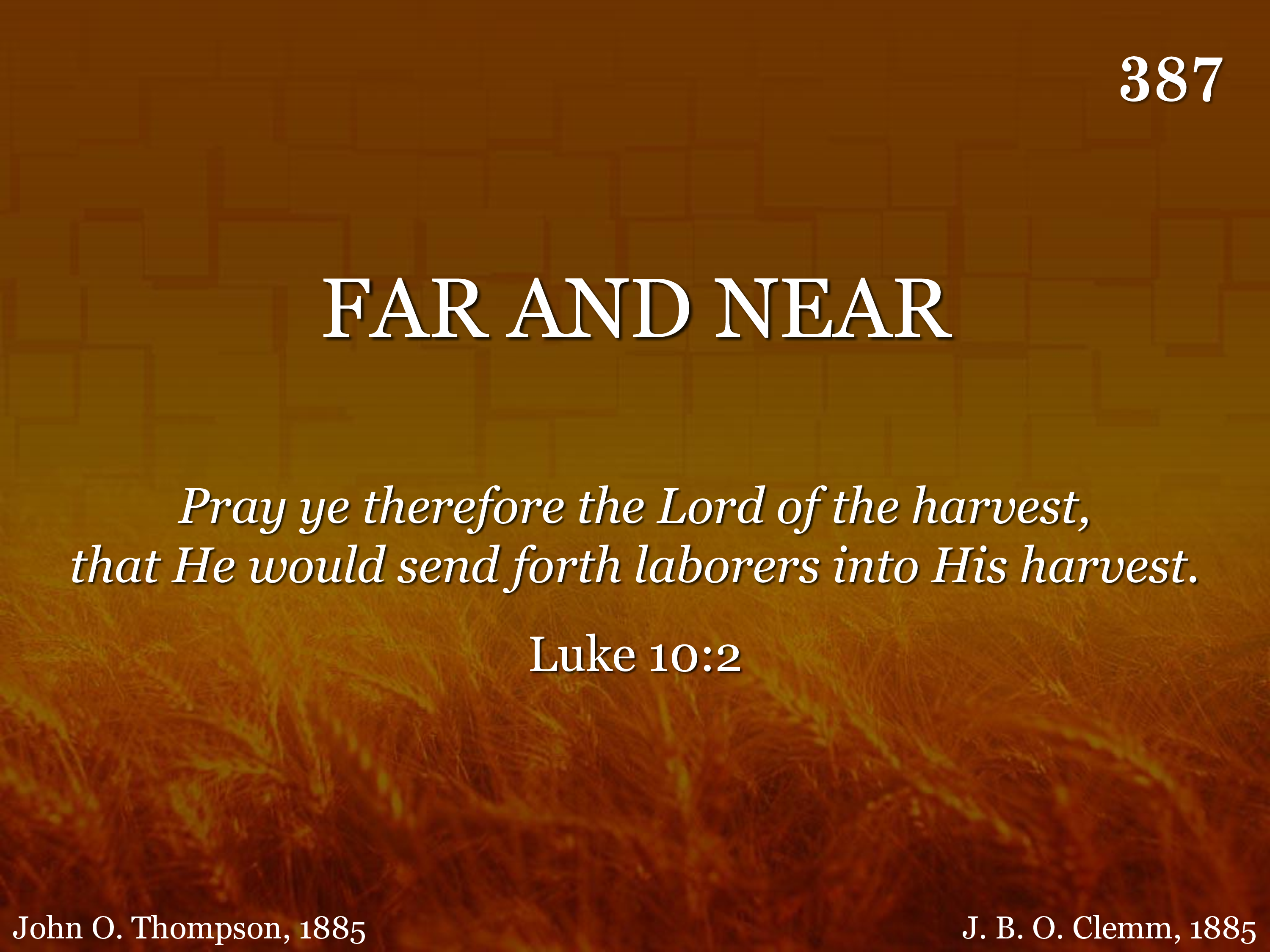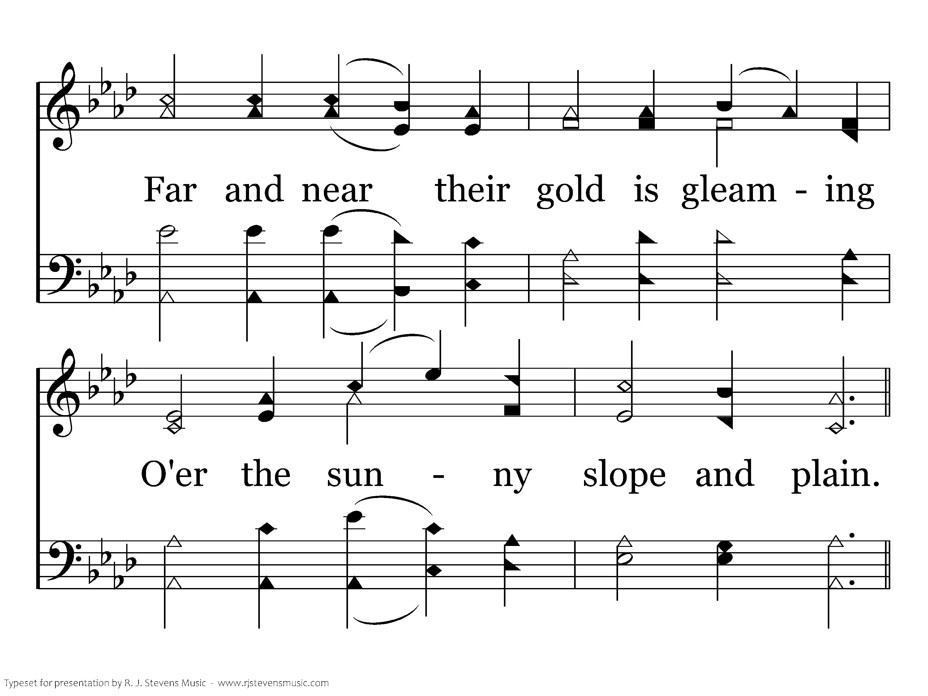 Far and near the fields are teeming With the waves of ripened grain; Far and near their gold is gleaming O'er the sunny slope and plain.