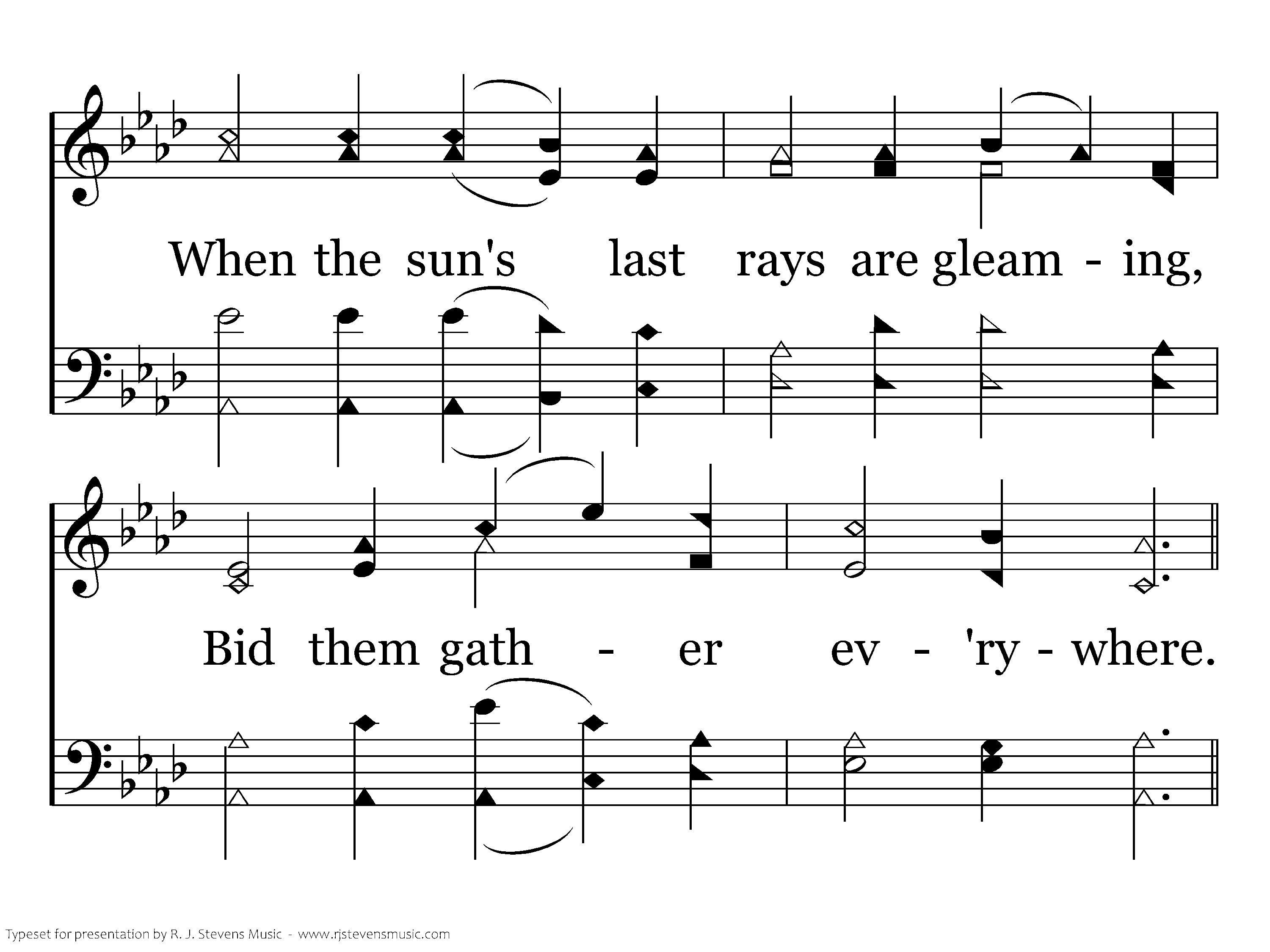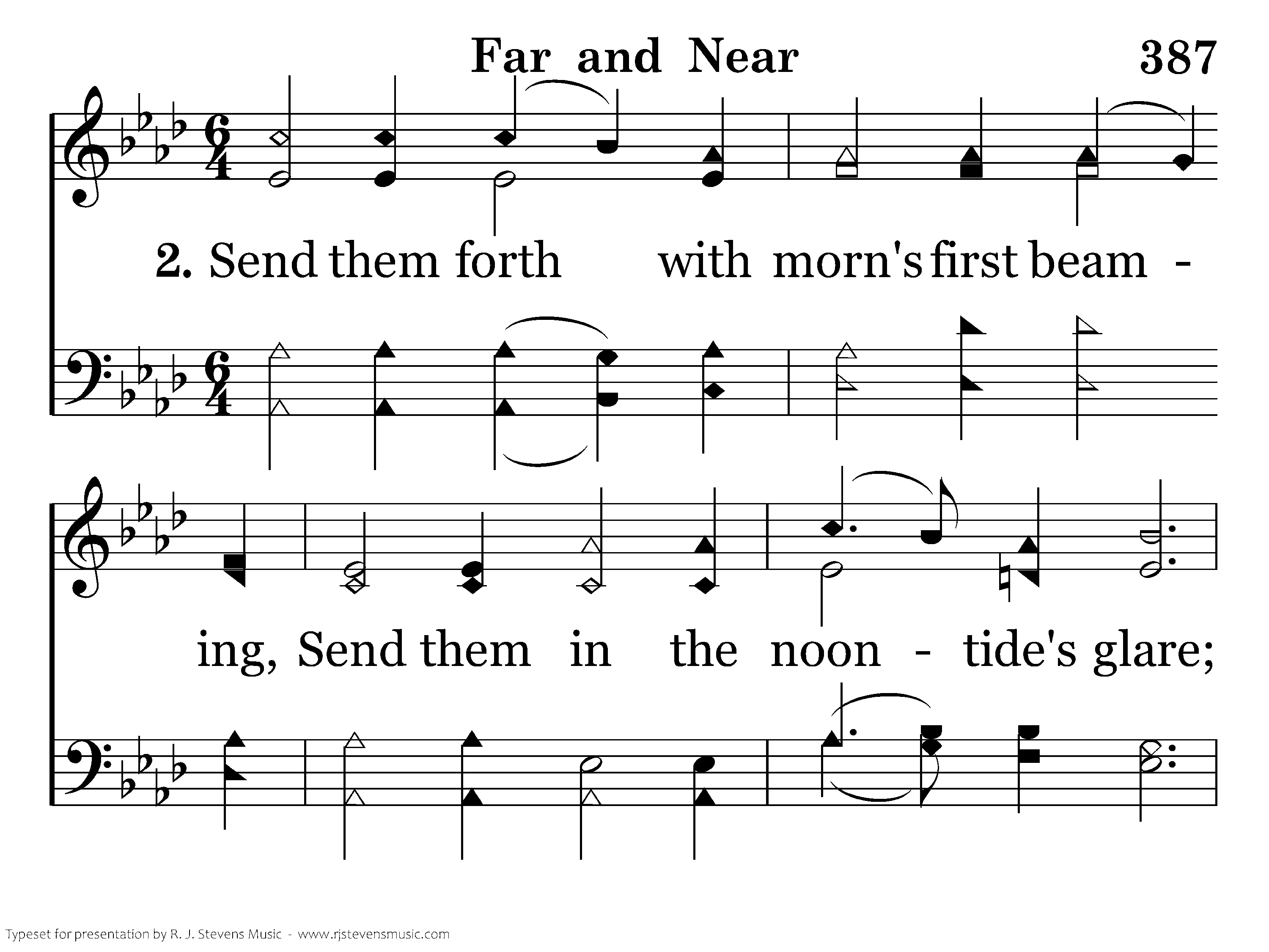 Send them forth with morn's first beaming, Send them in the noontide's glare; When the sun's last rays are gleaming, Bid them gather ev'rywhere.