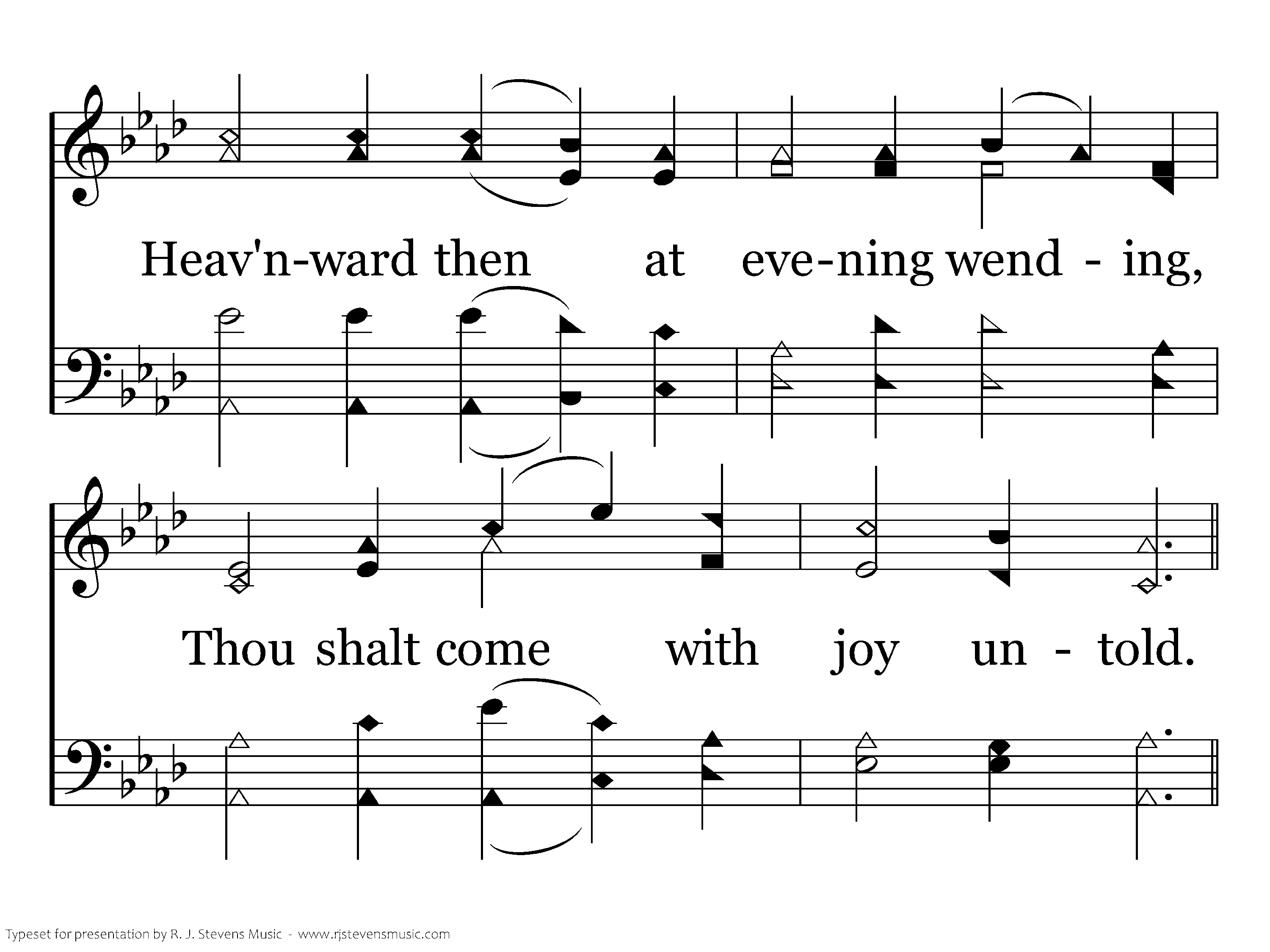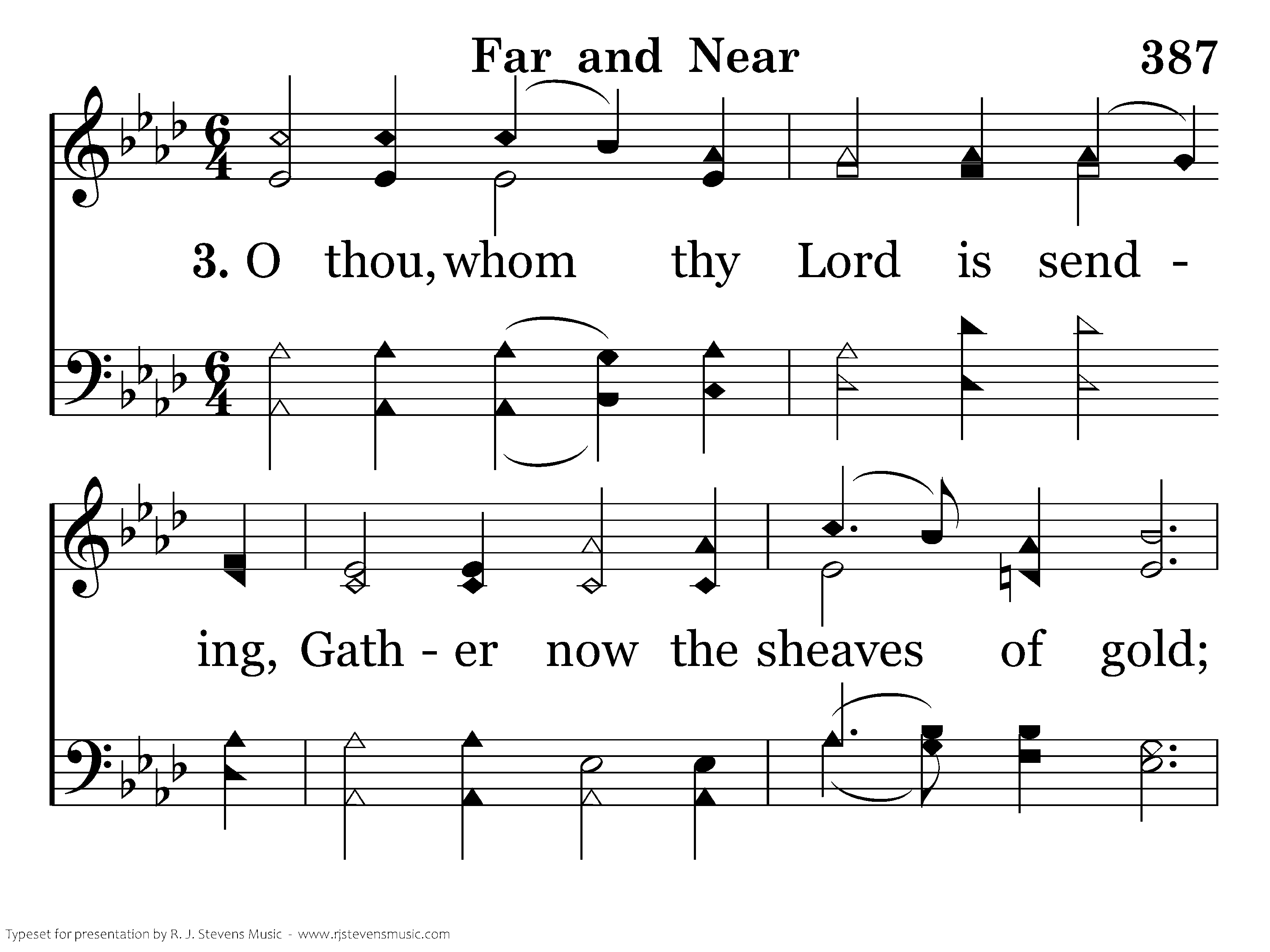 O thou, whom thy Lord is sending, Gather now the sheaves of gold; Heav'nward then at evening wending, Thou shalt come with joy untold.