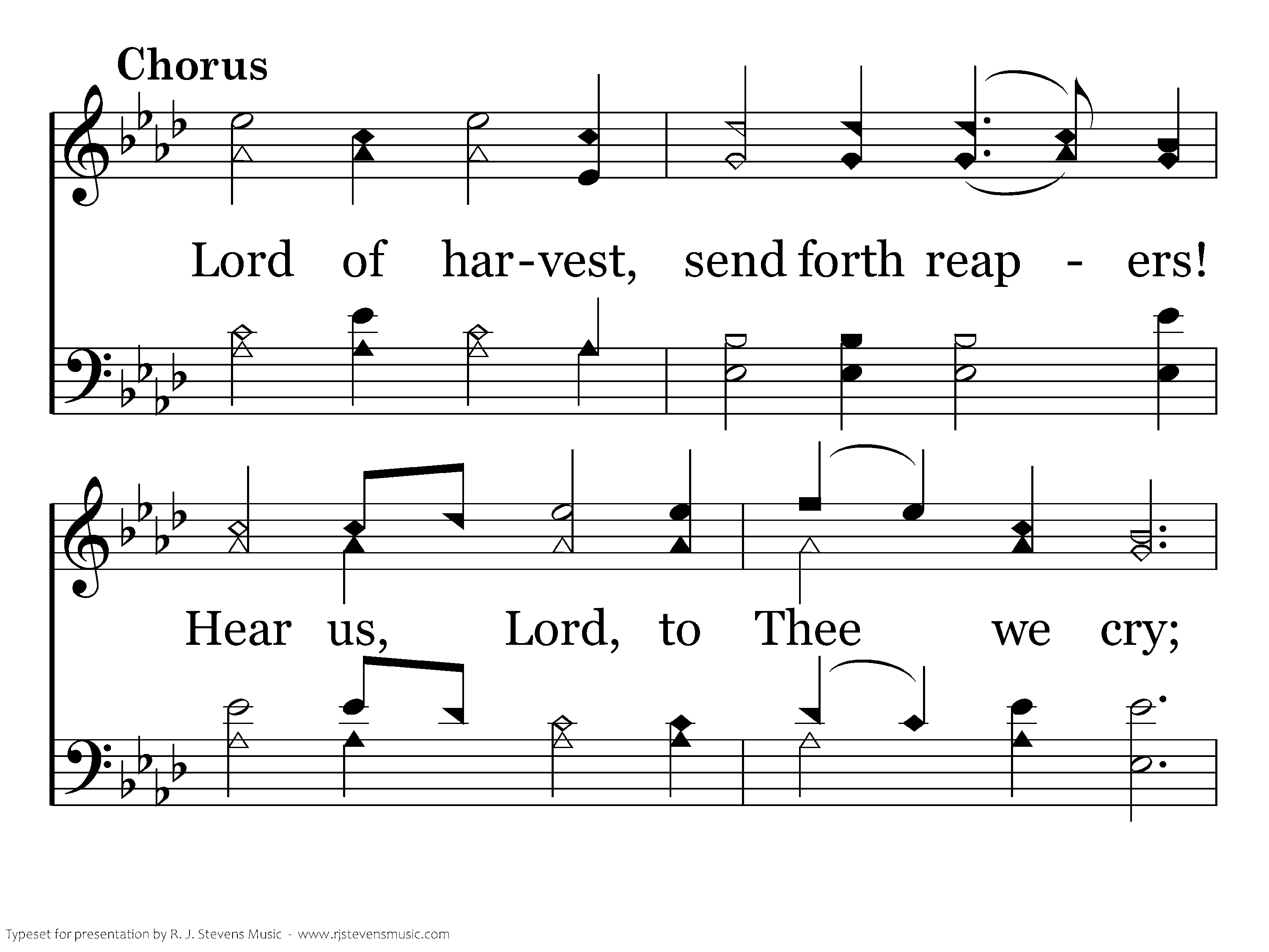 Lord of harvest, send forth reapers! Hear us, Lord, to Thee we cry, Send them now the sheaves to gather, Ere the harvesttime pass by.