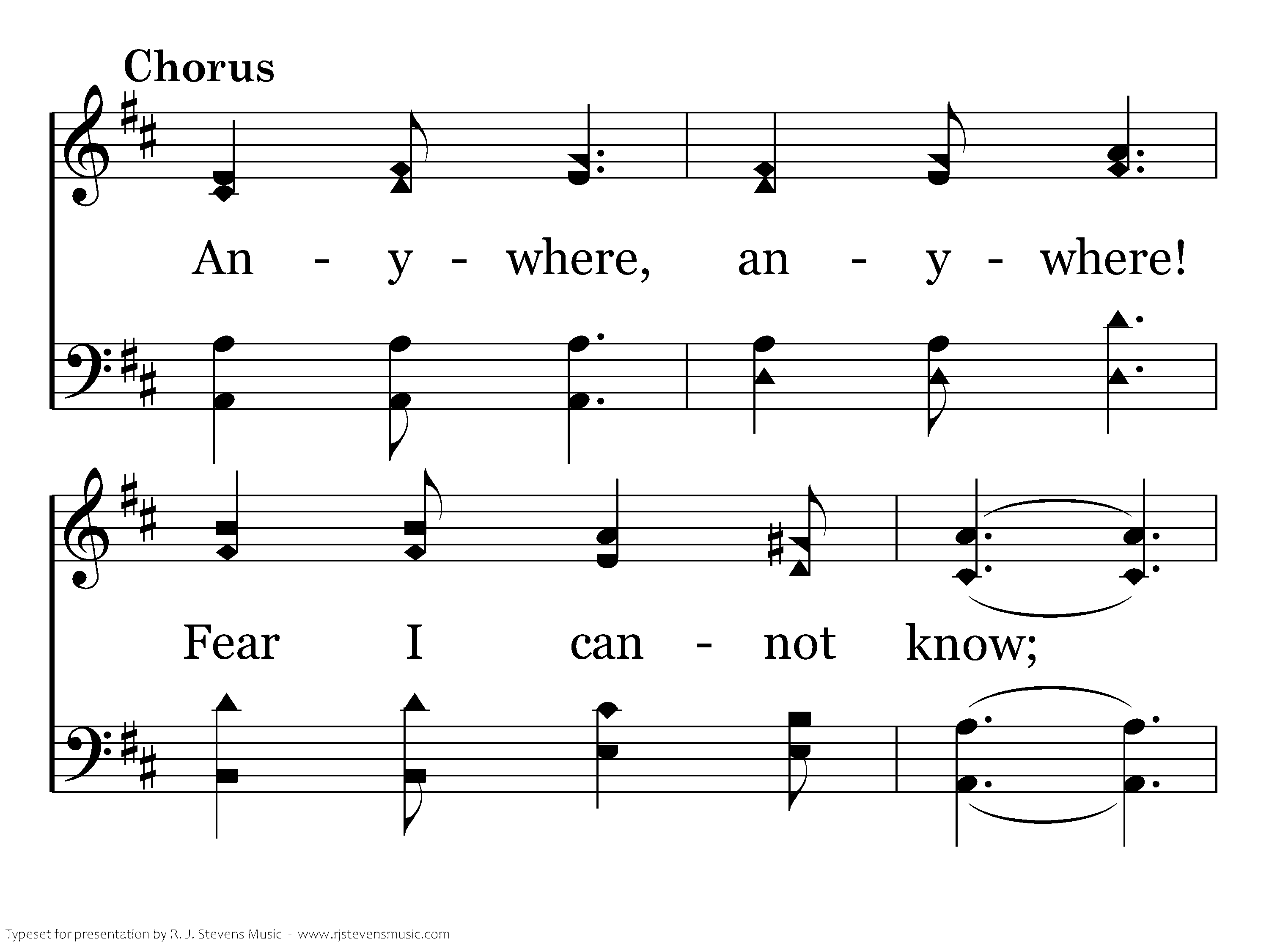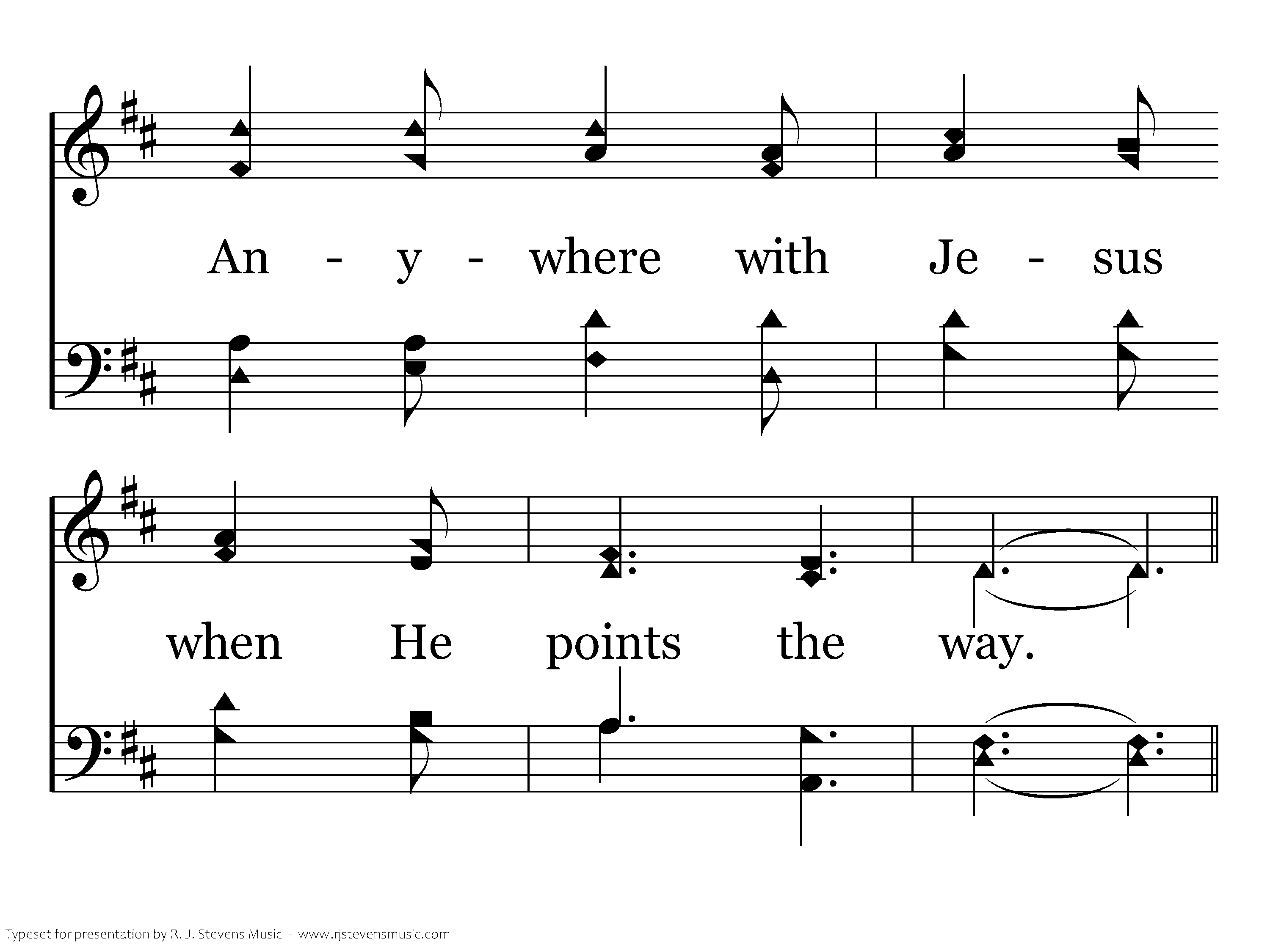 Anywhere with Jesus, over land and sea, Telling souls in darkness of salvation free; Ready as He summons me to go or stay, Anywhere with Jesus when He points the way.