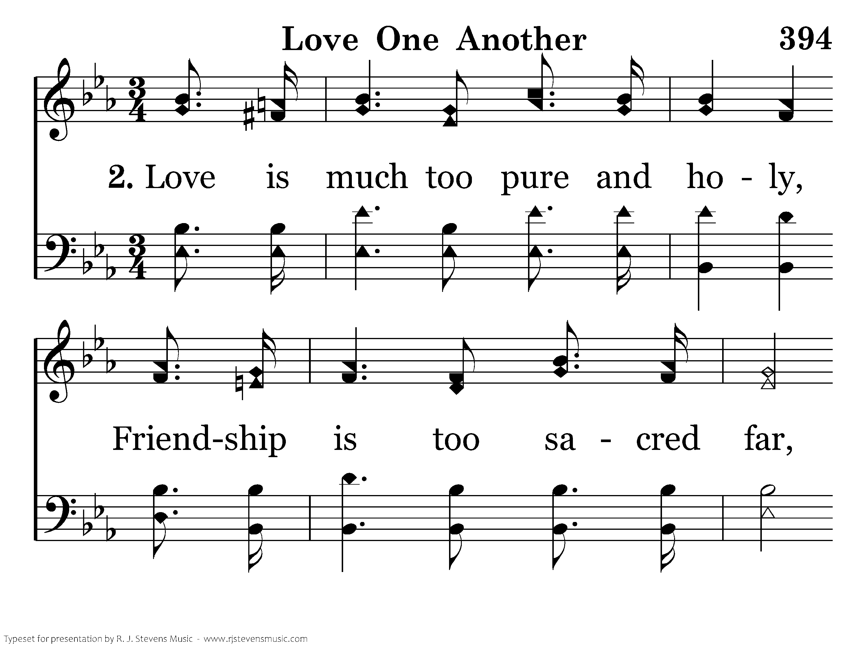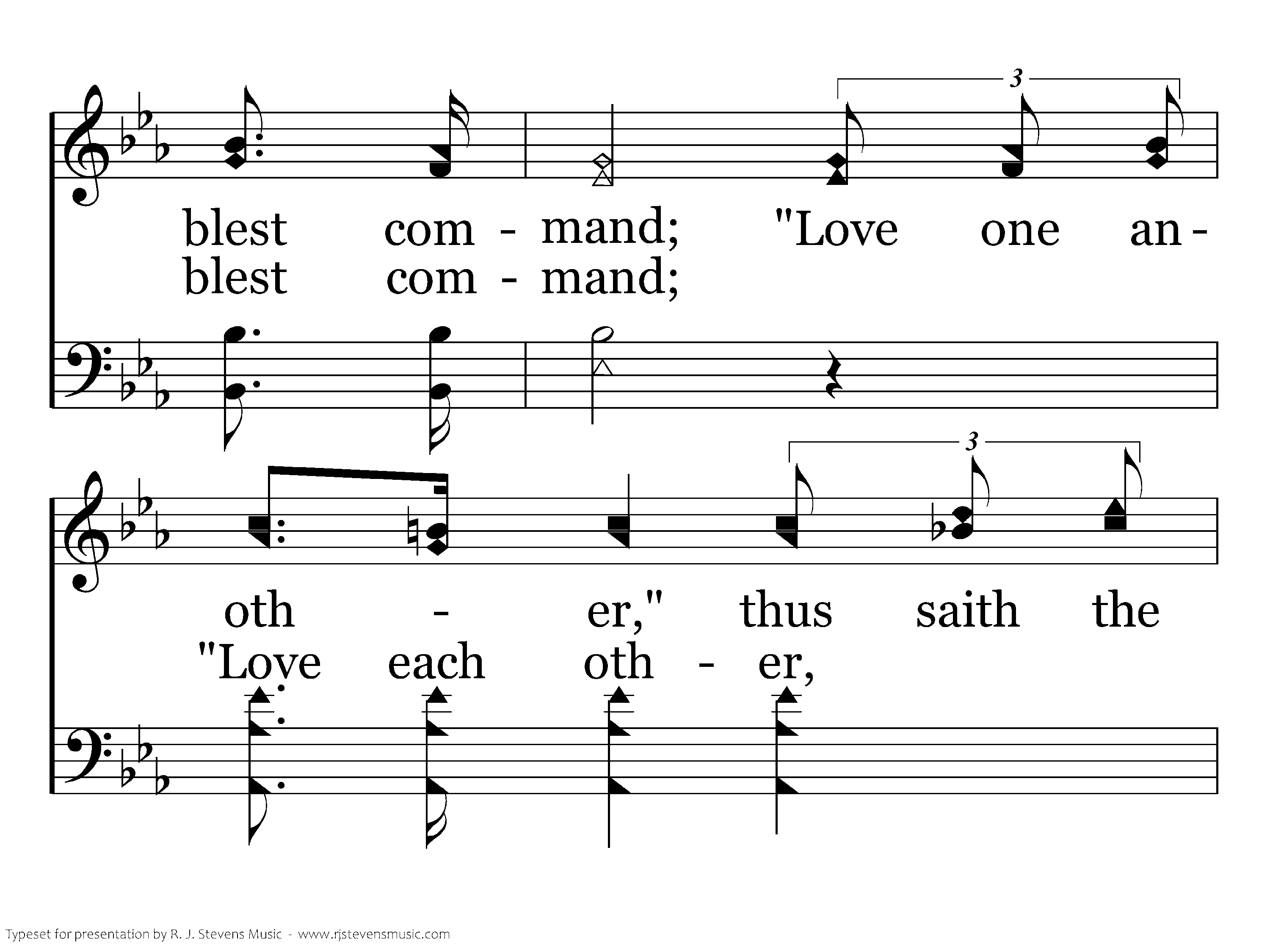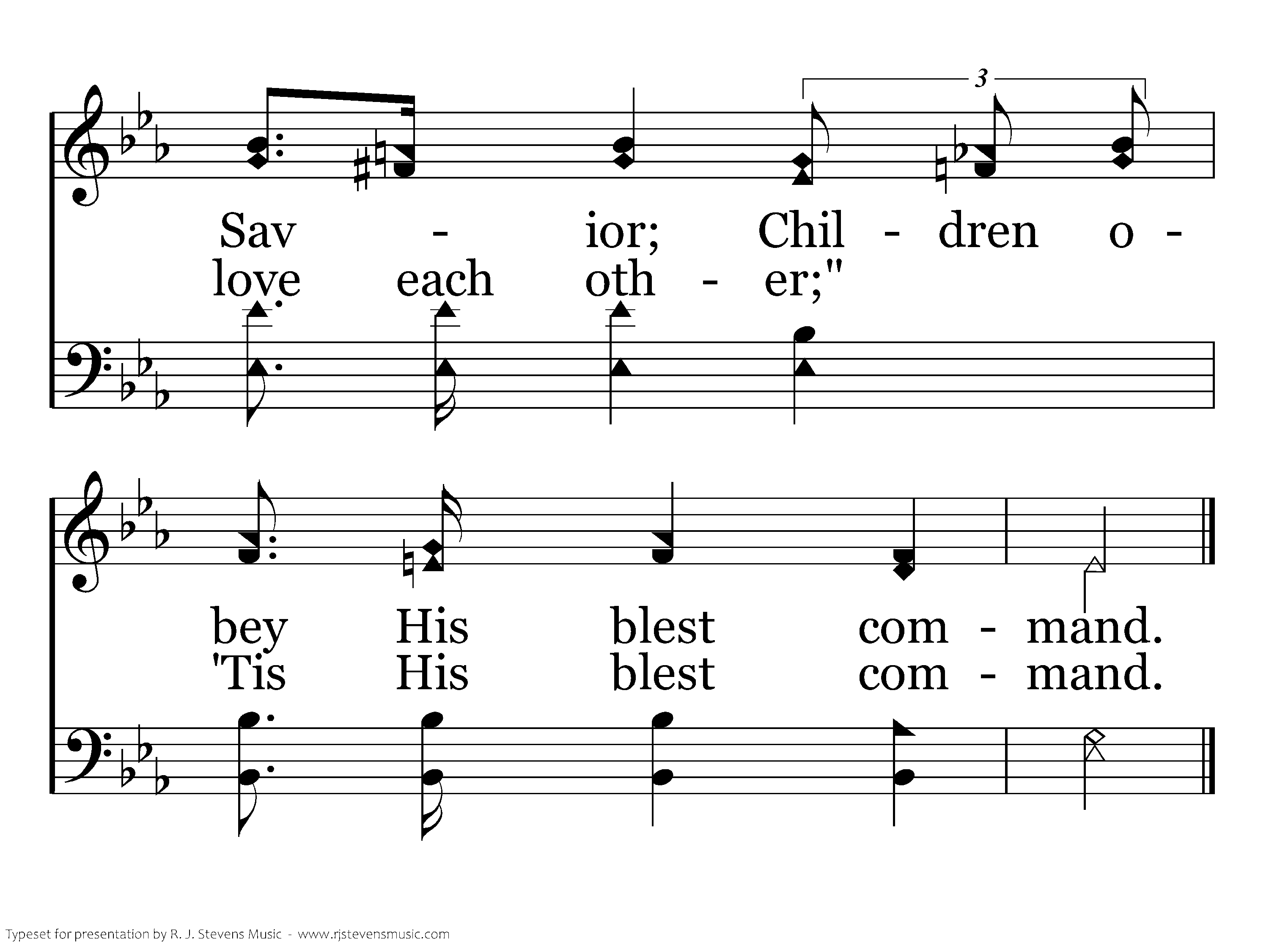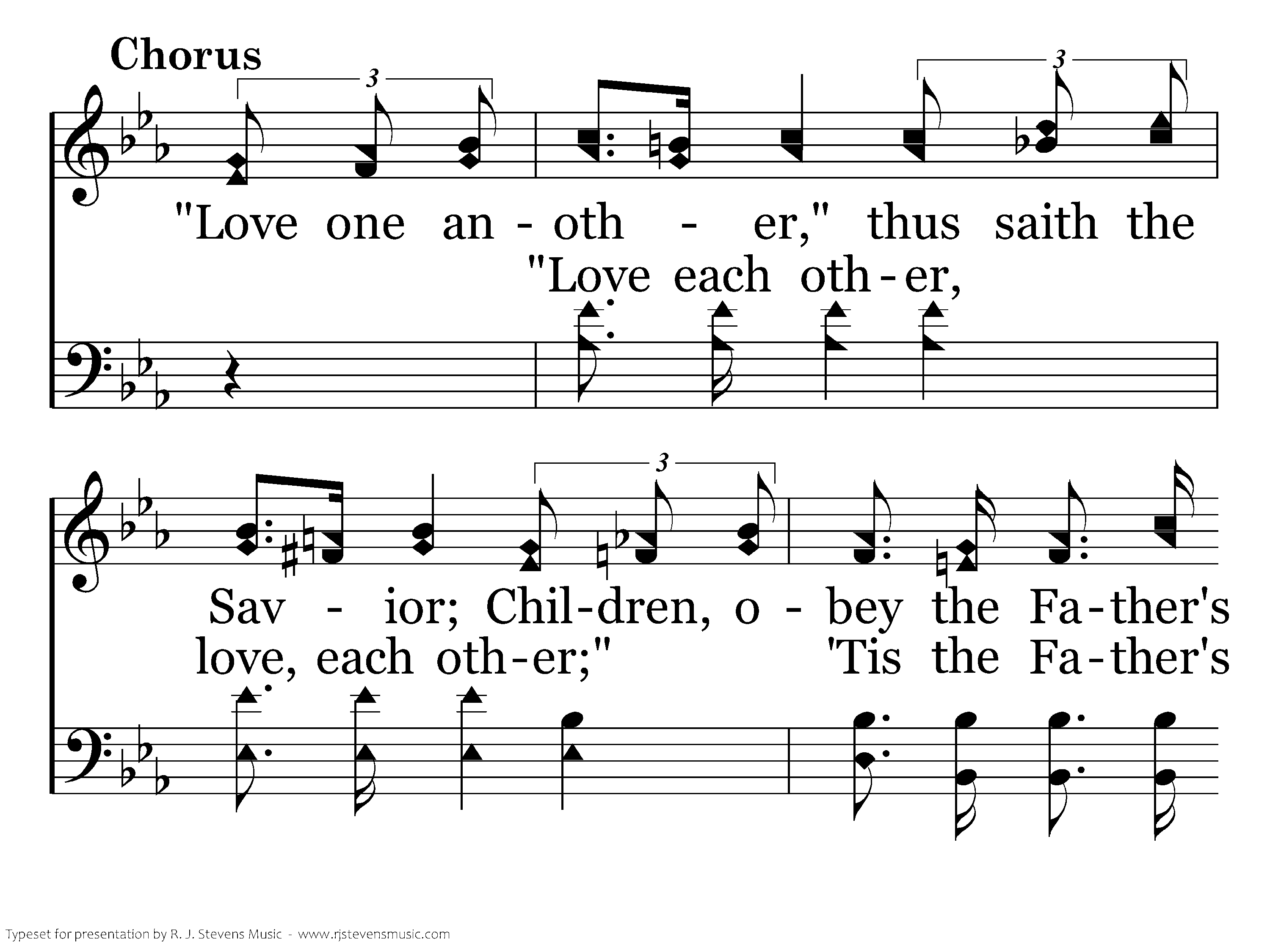 "Love one another," thus saith the Savior; Children, obey the Father's blest command; "Love one another," thus saith the Savior; Children obey His blest command.