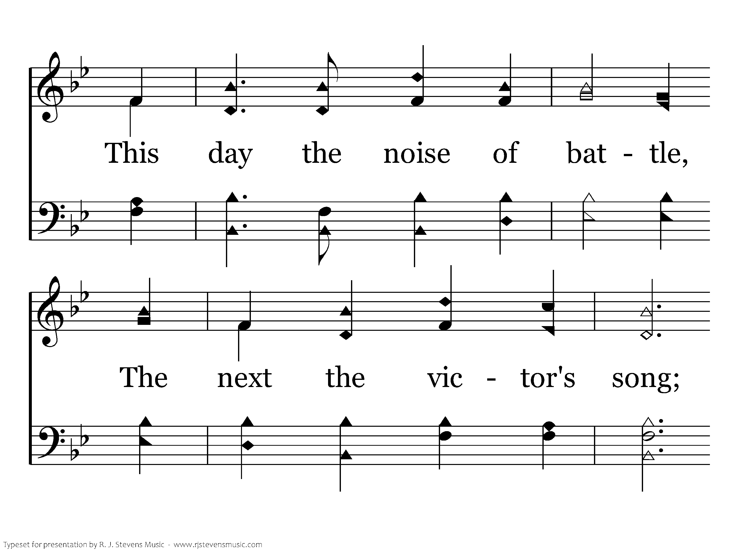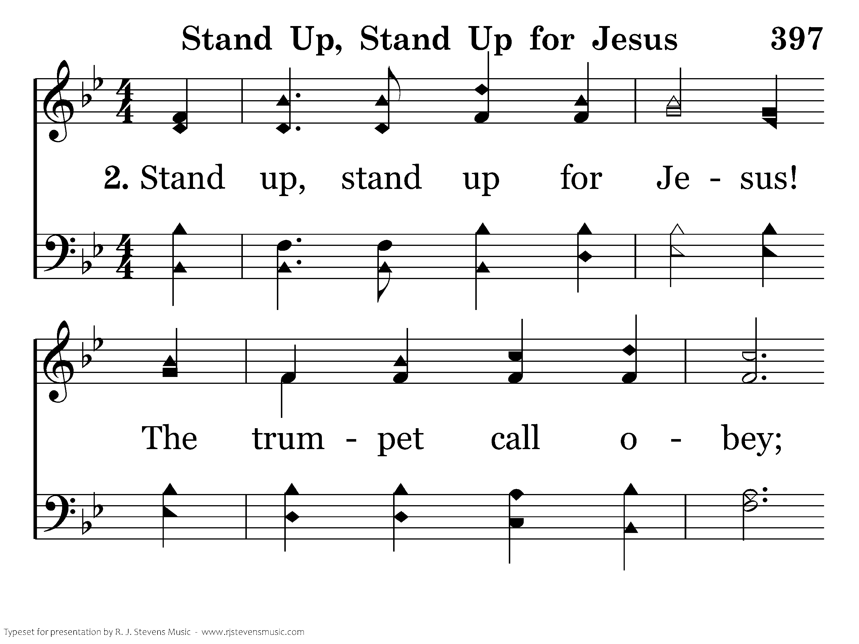 Stand up, stand up for Jesus! The trumpet call obey; Forth to the mighty conflict, In this His glorious day; Ye that are men now serve Him, Against unnumbered foes; Your courage rise with danger, And strength to strength oppose.