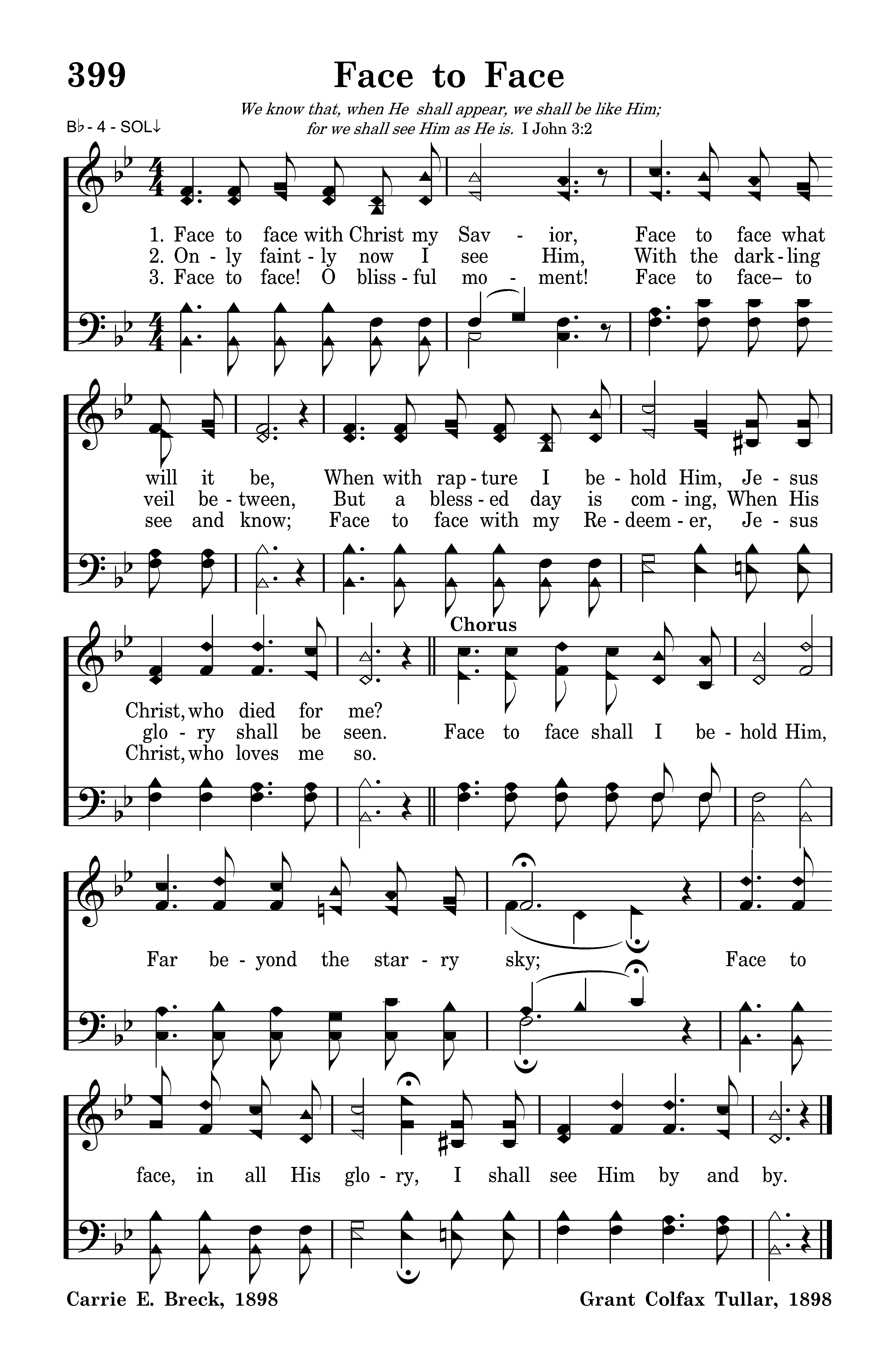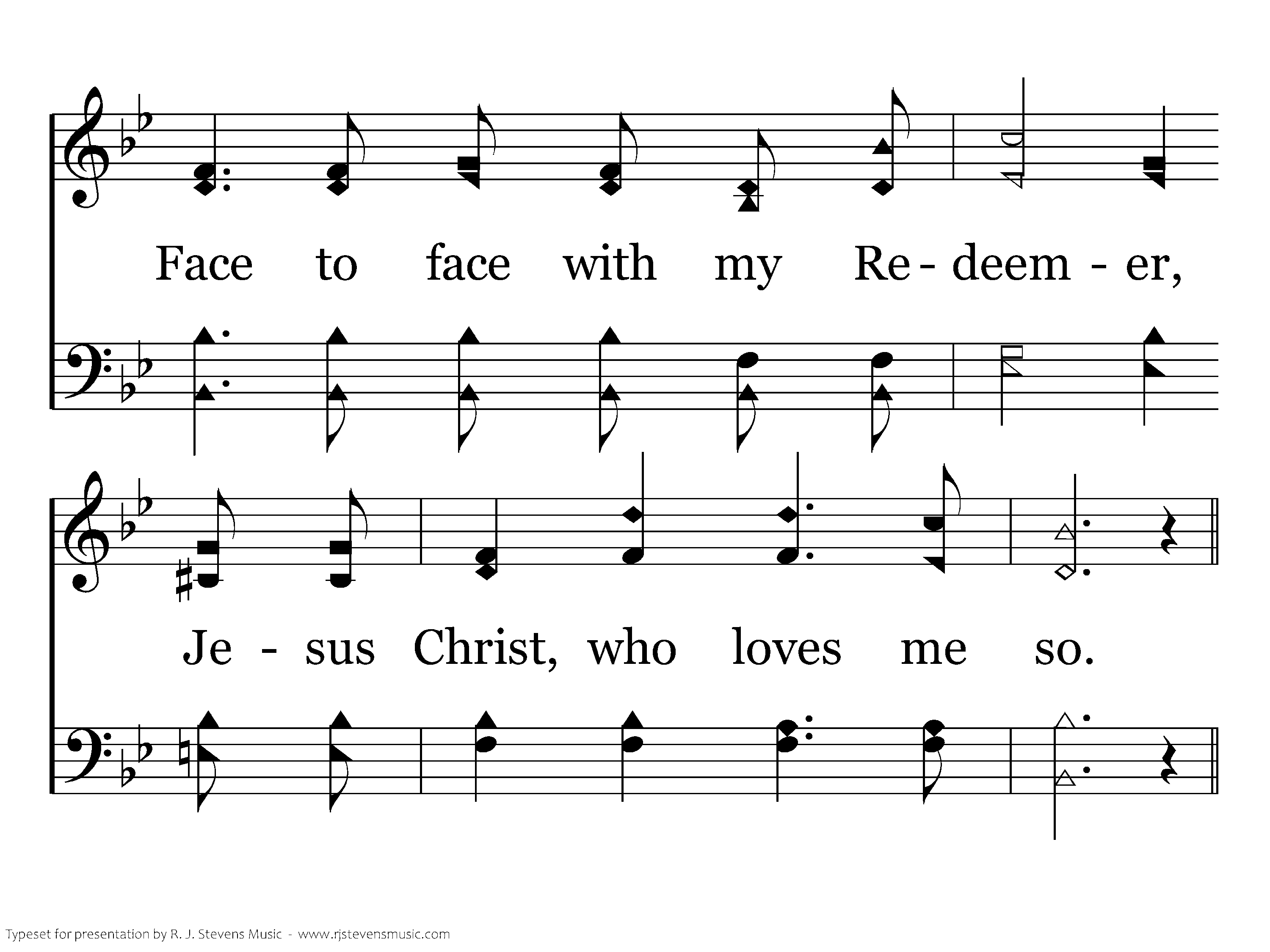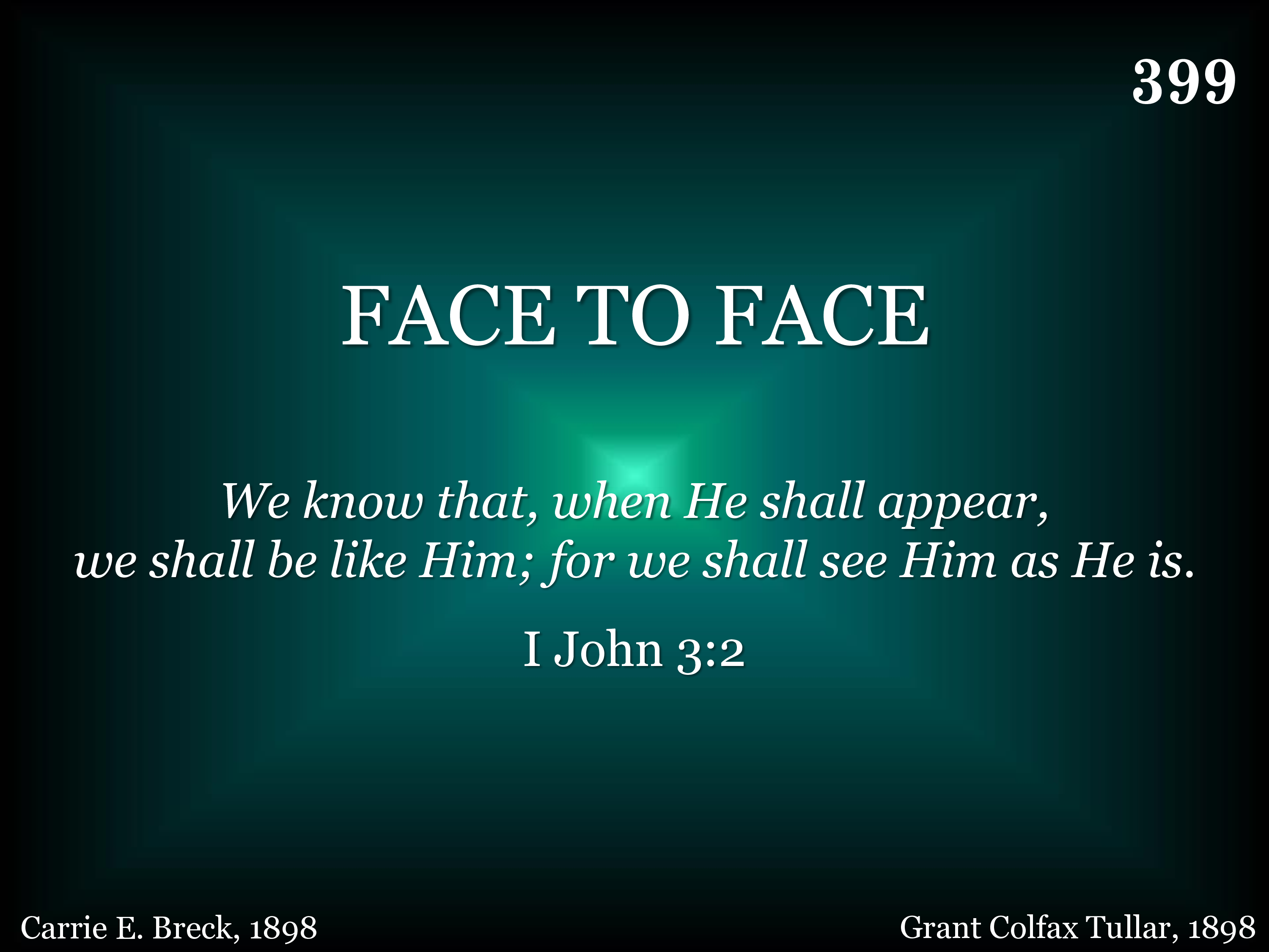 Face to face shall I behold Him, Far beyond the starry sky, Face to face in all His glory, I shall see Him by and by.
