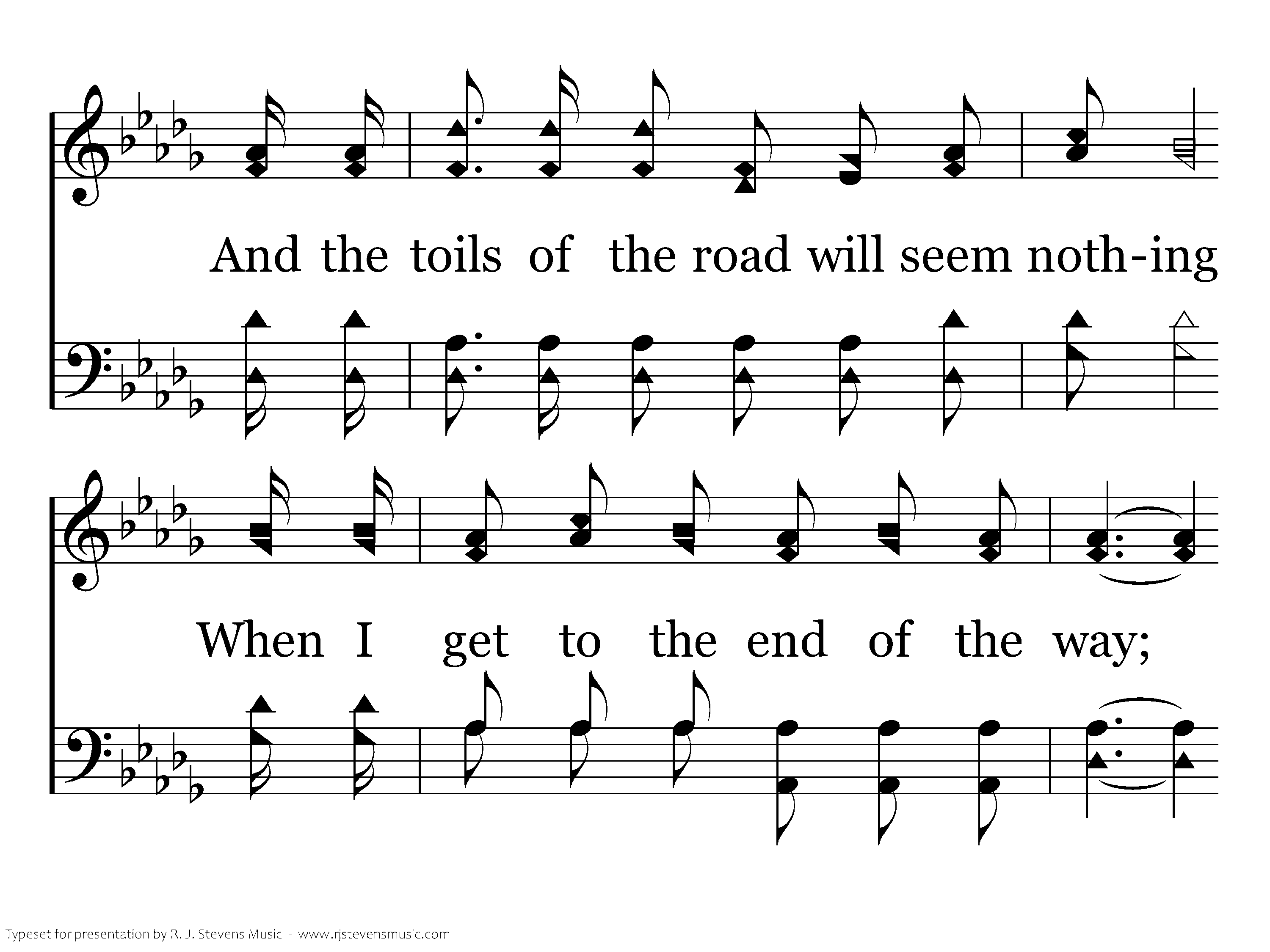 When the last feeble step has been taken, And the gates of that city appear, And the beautiful songs of the angels Float out on my listening ear; When all that now seems so mysterious Will be bright and as clear as the day; Then the toils of the road will seem nothing, When I get to the end of the way; And the toils of the road will seem nothing, When I get to the end of the way.