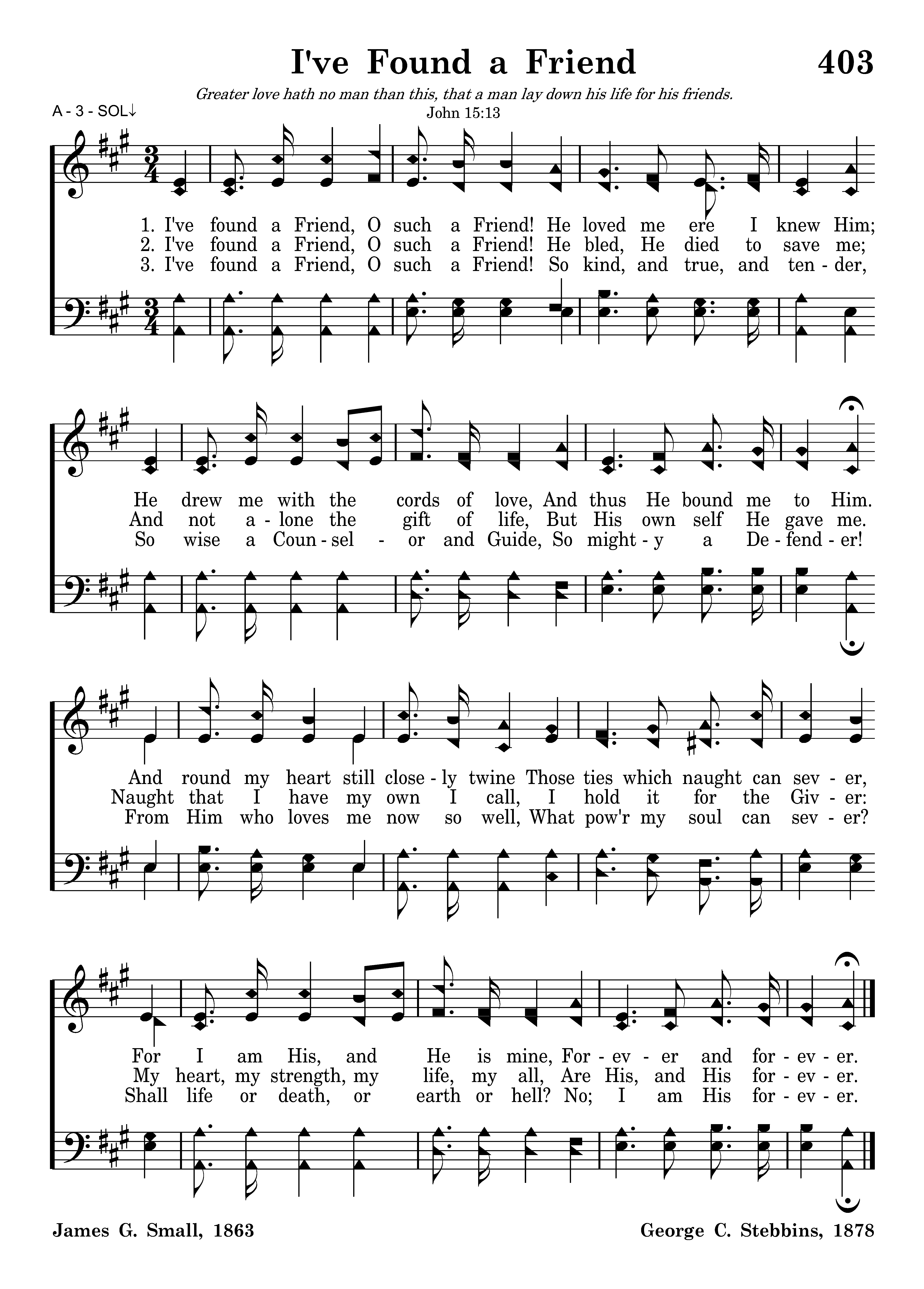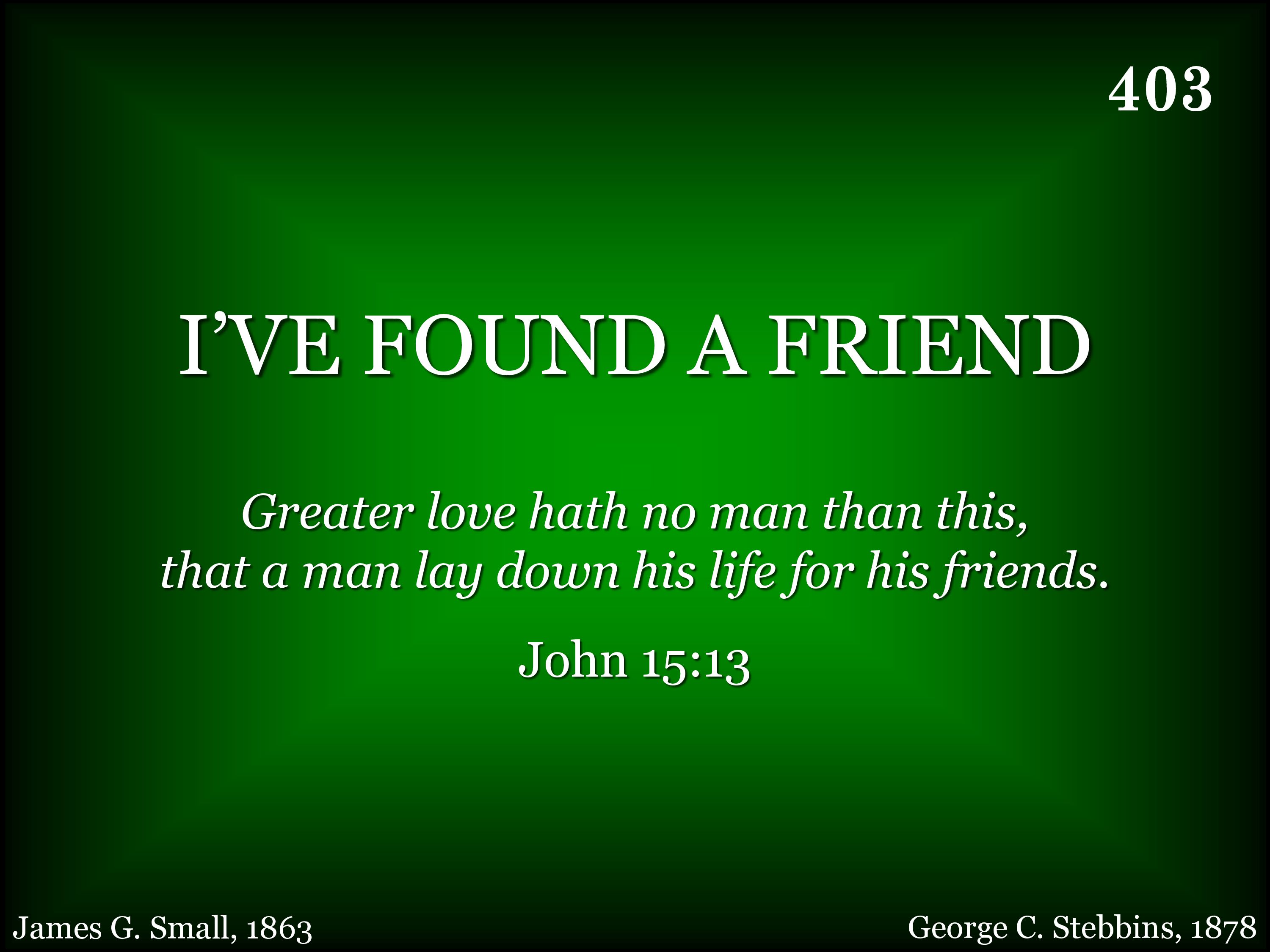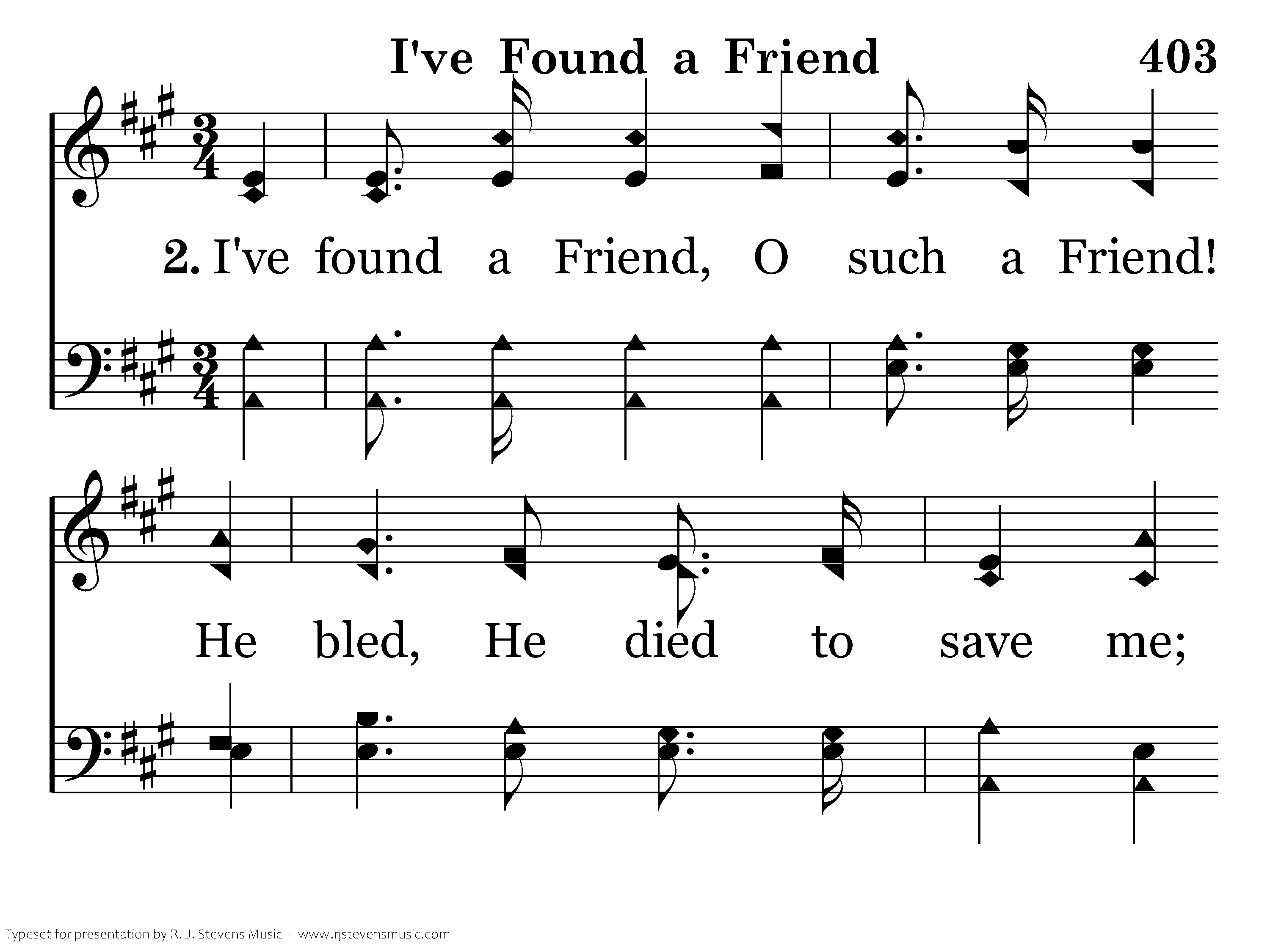 I've found a Friend, O such a Friend! He bled, He died to save me; And not alone the gift of life, But His own self He gave me. Naught that I have my own I call, I hold it for the Giver: My heart, my strength, my life, my all, Are His, and His forever.
