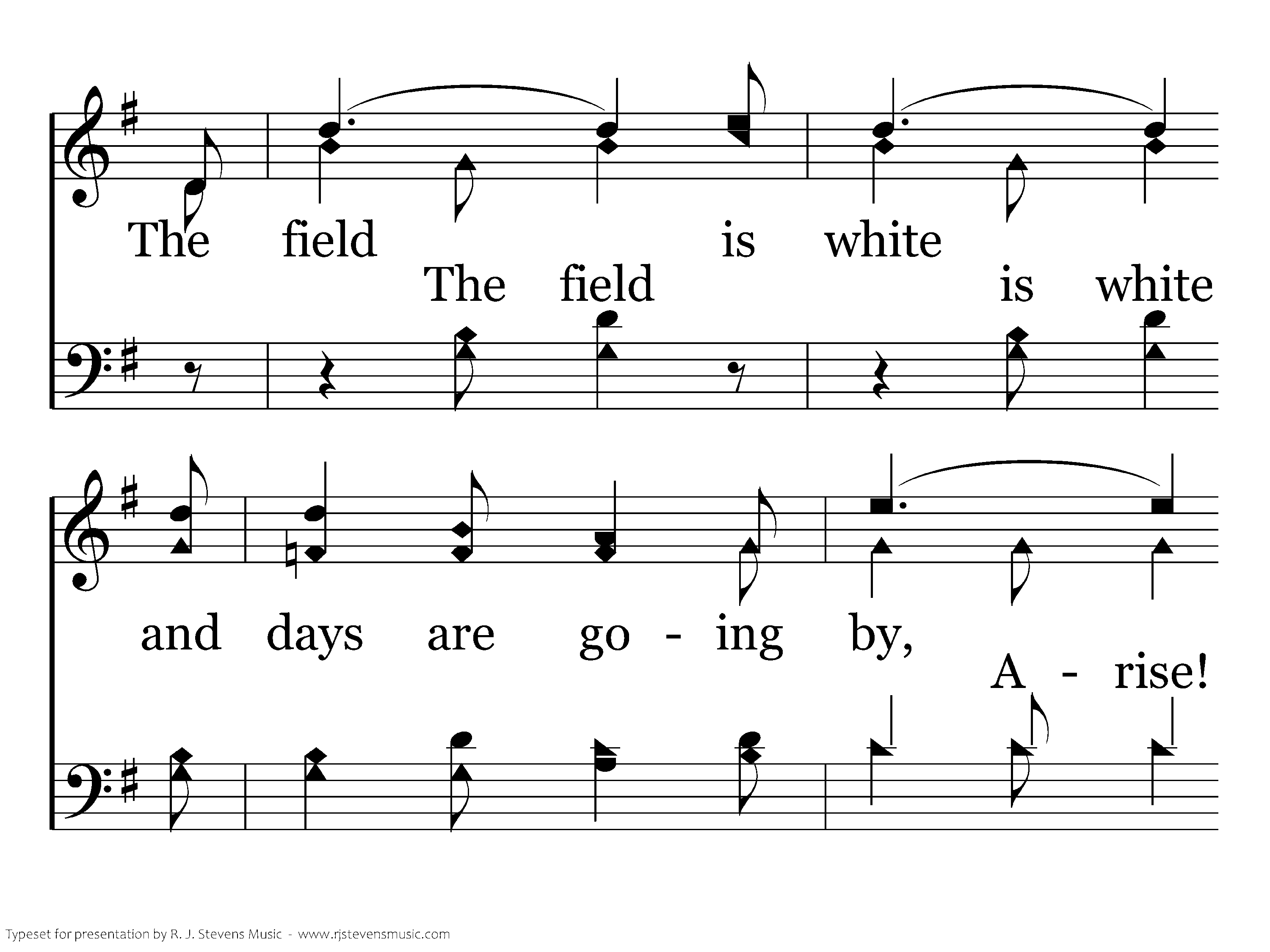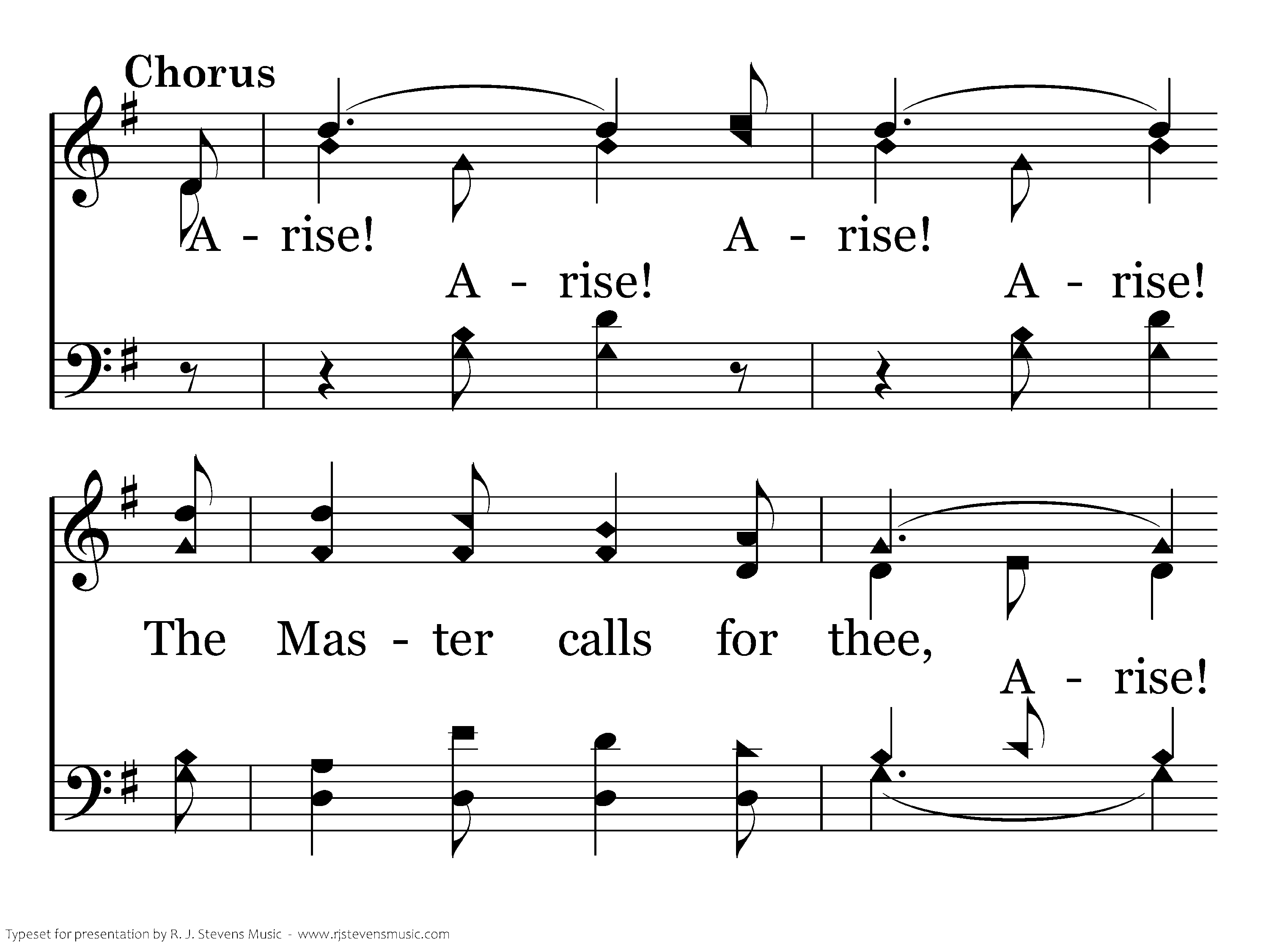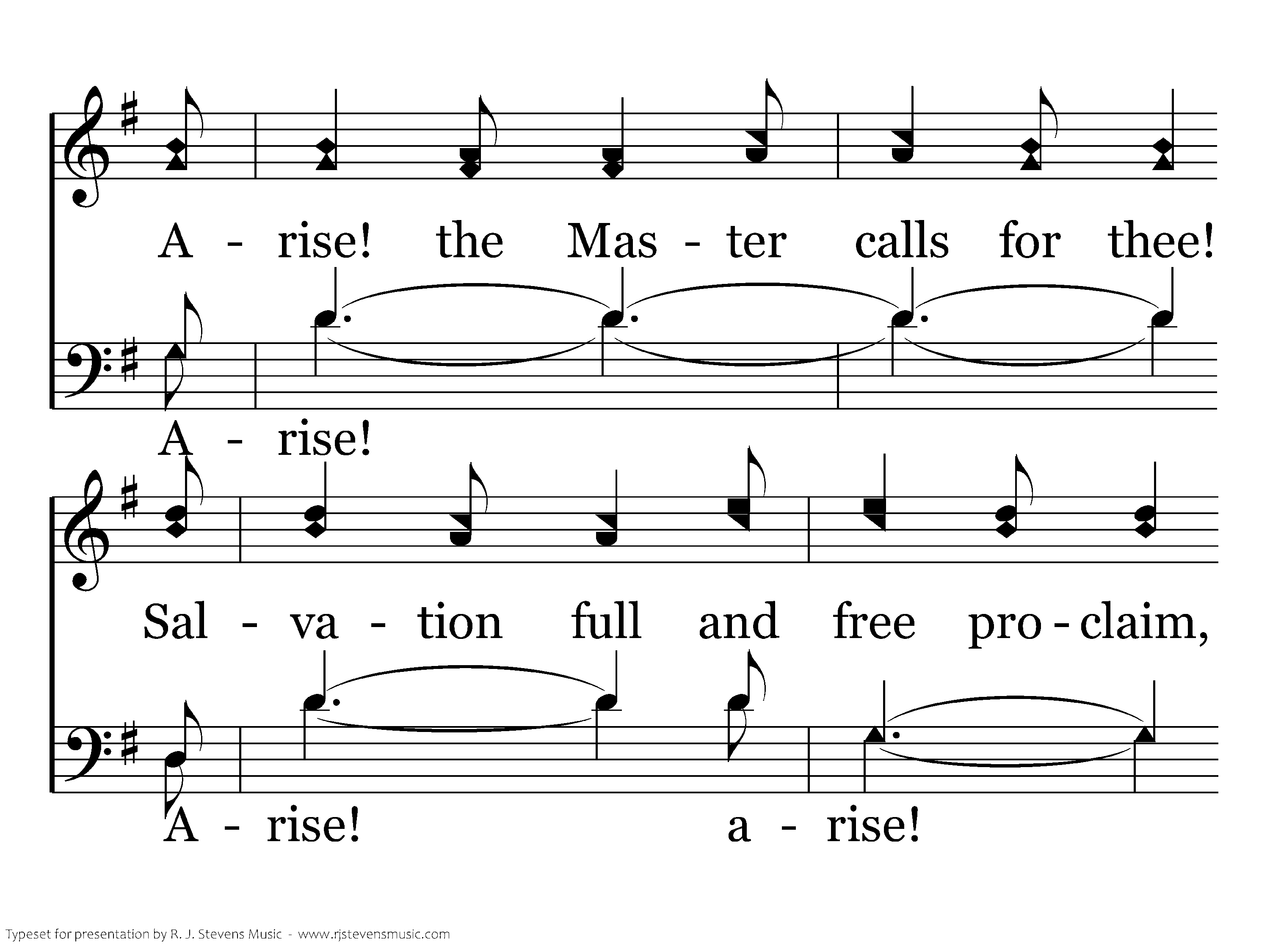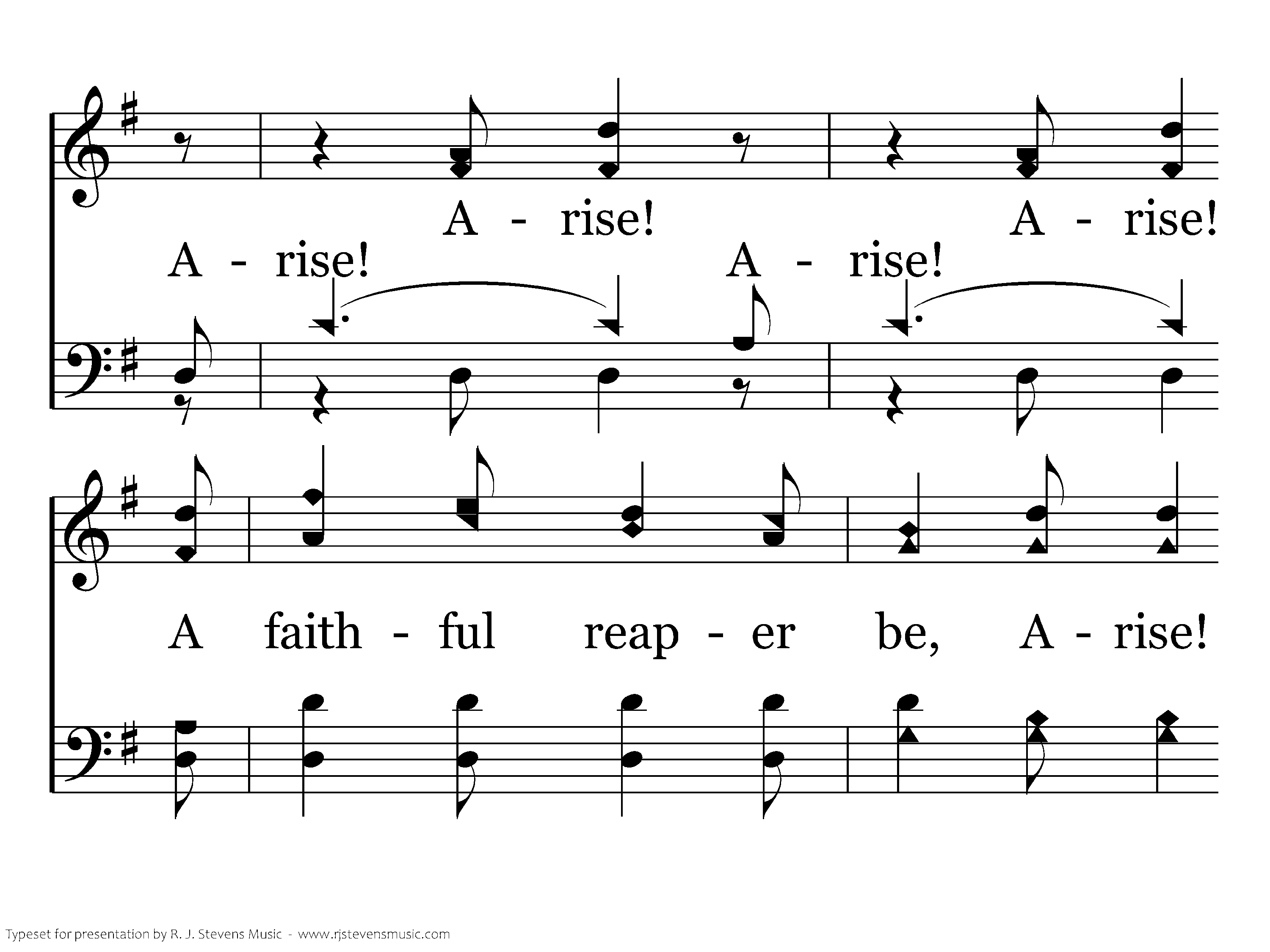 Arise! Arise! The Master call for thee, Arise! Arise! A faithful reaper be, Arise! The field is white and days are going by, Awake! Awake! And answer, "Here am I!"