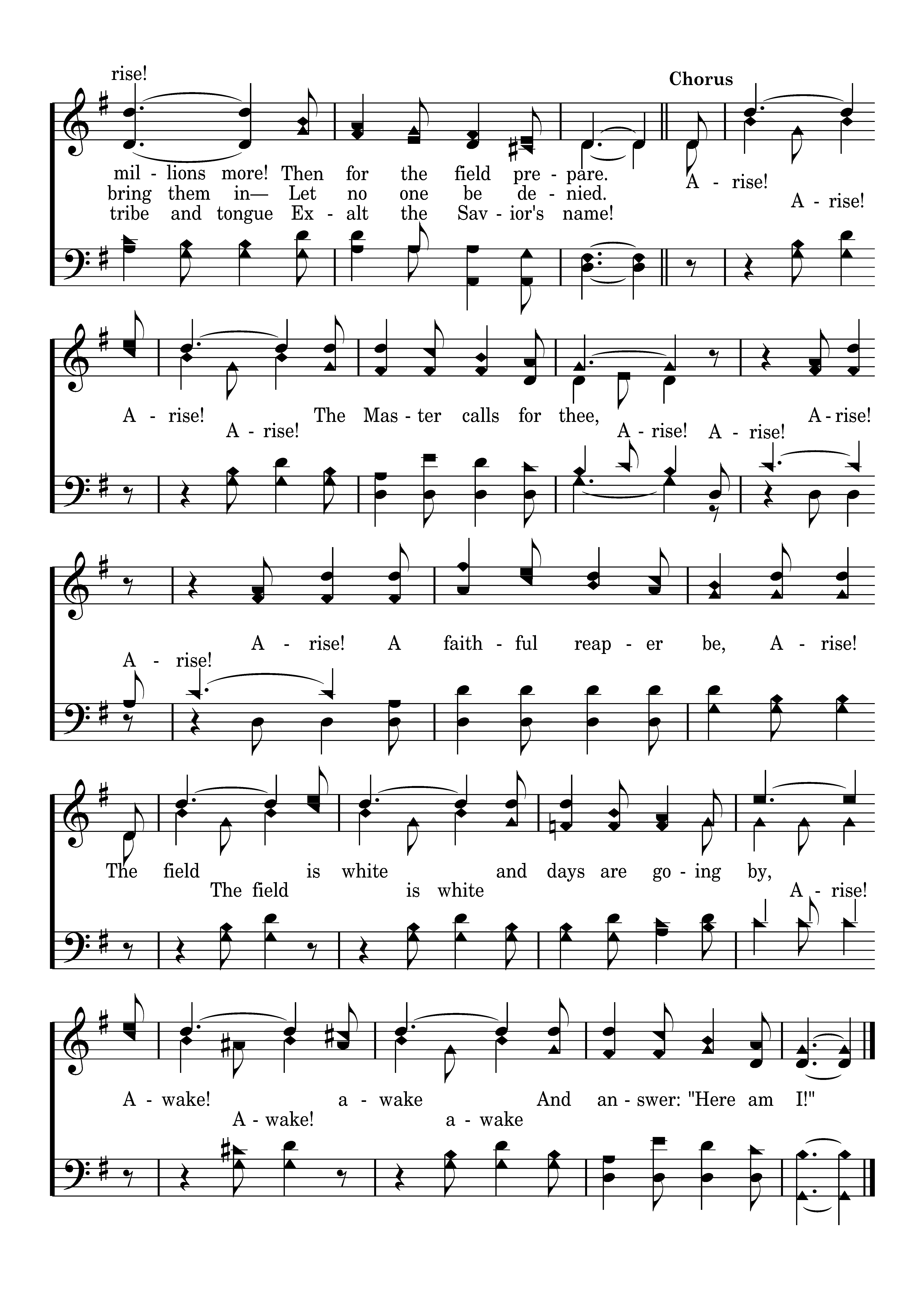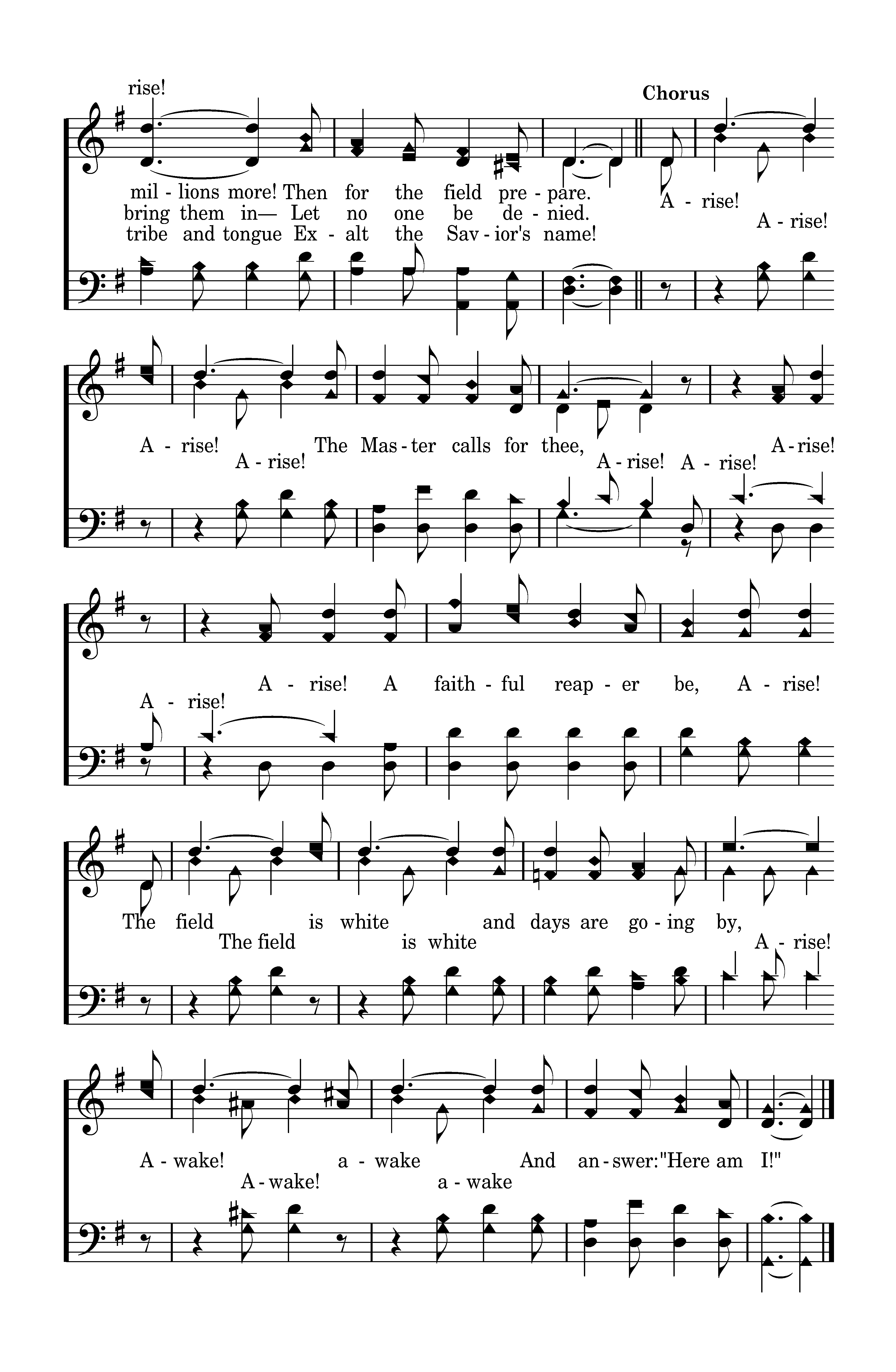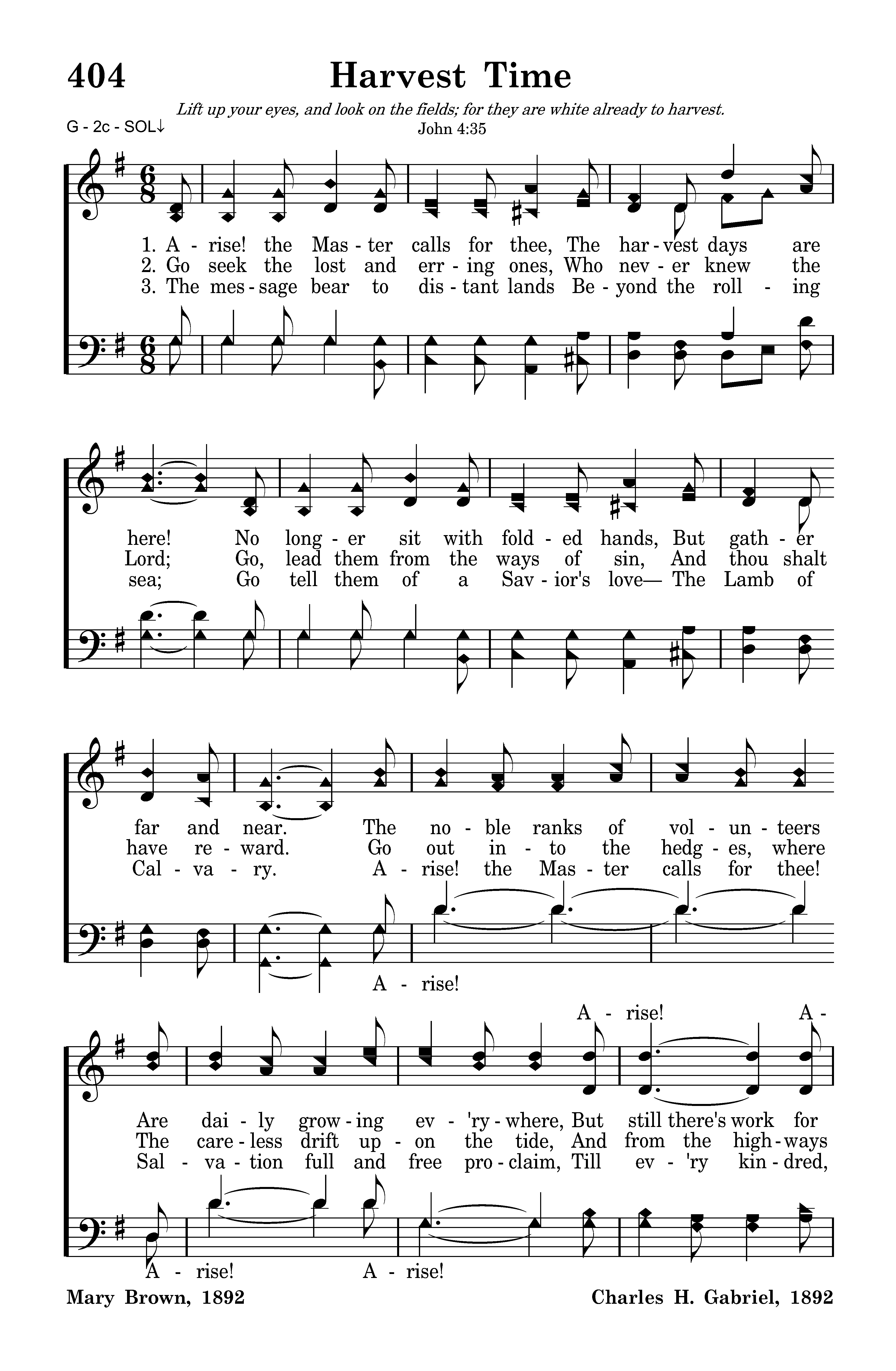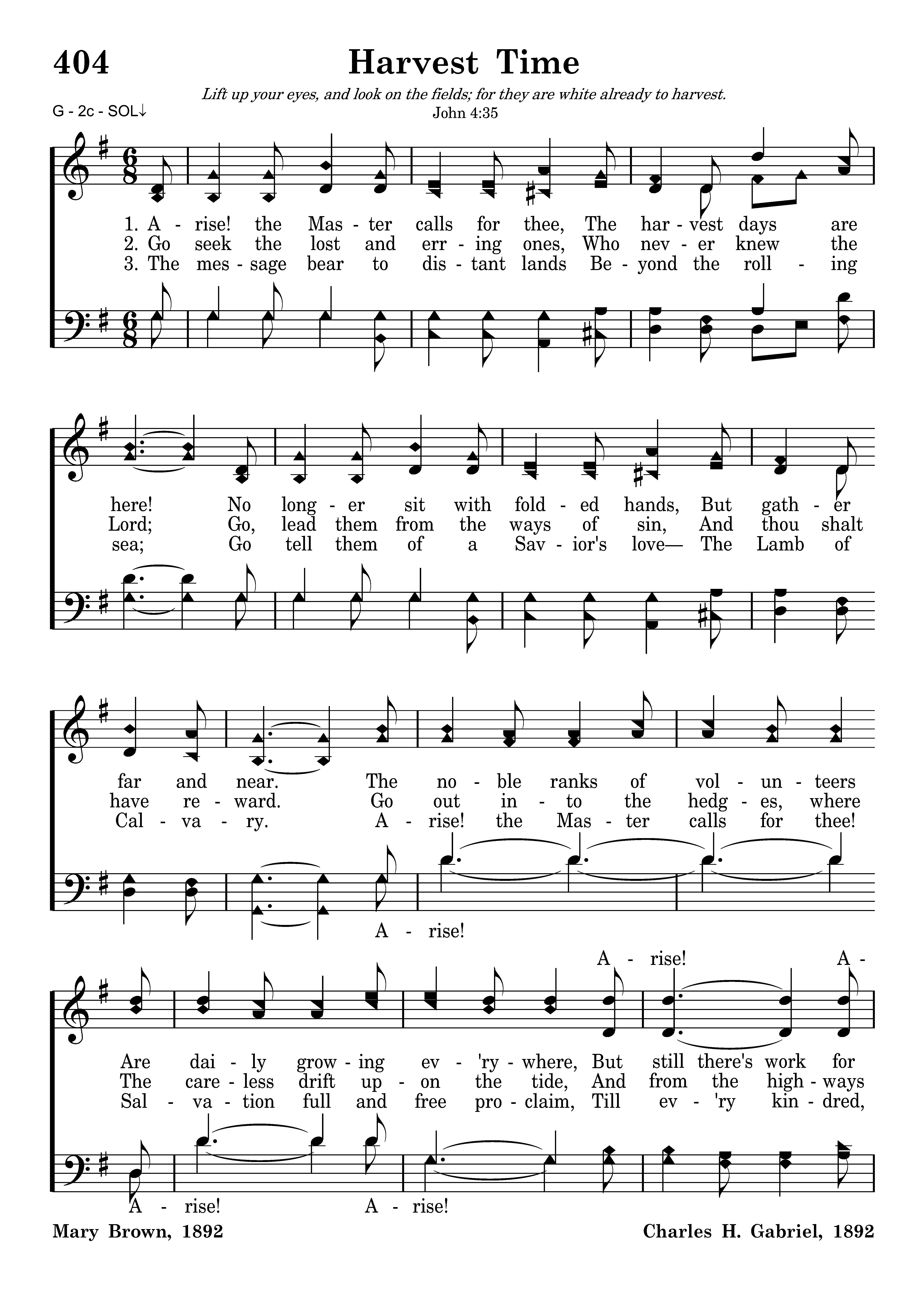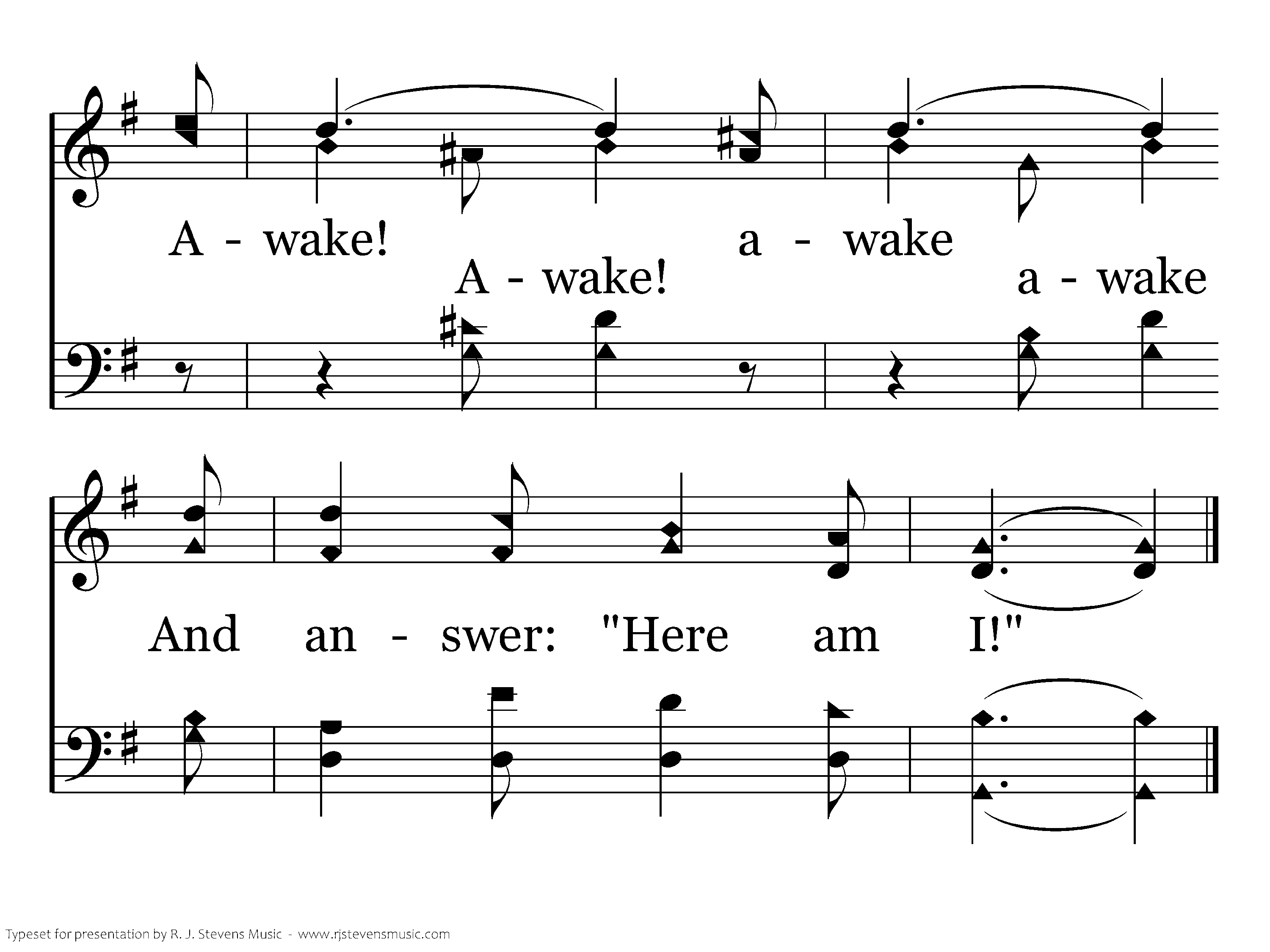 Arise! Arise! The Master call for thee, Arise! Arise! A faithful reaper be, Arise! The field is white and days are going by, Awake! Awake! And answer, "Here am I!"