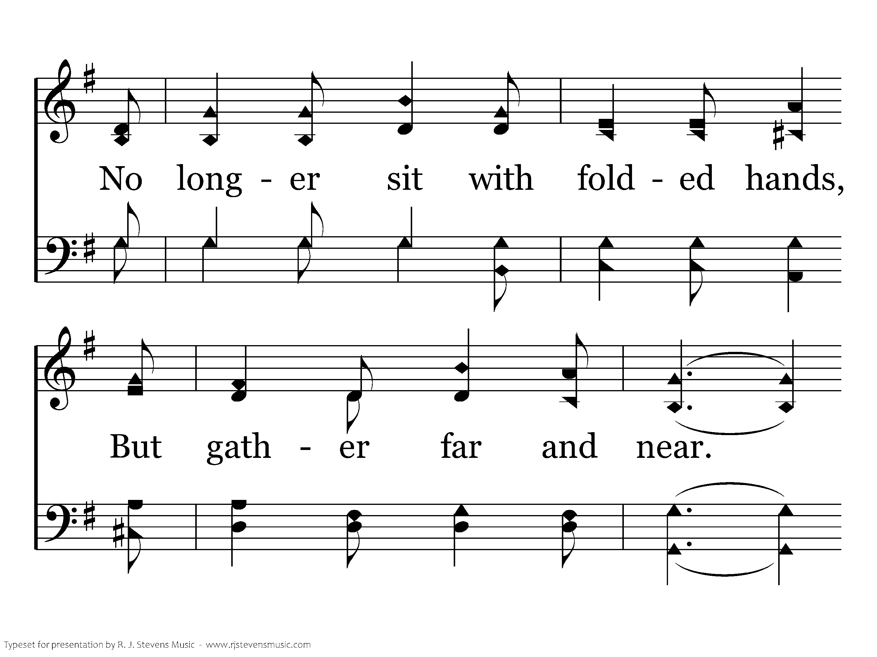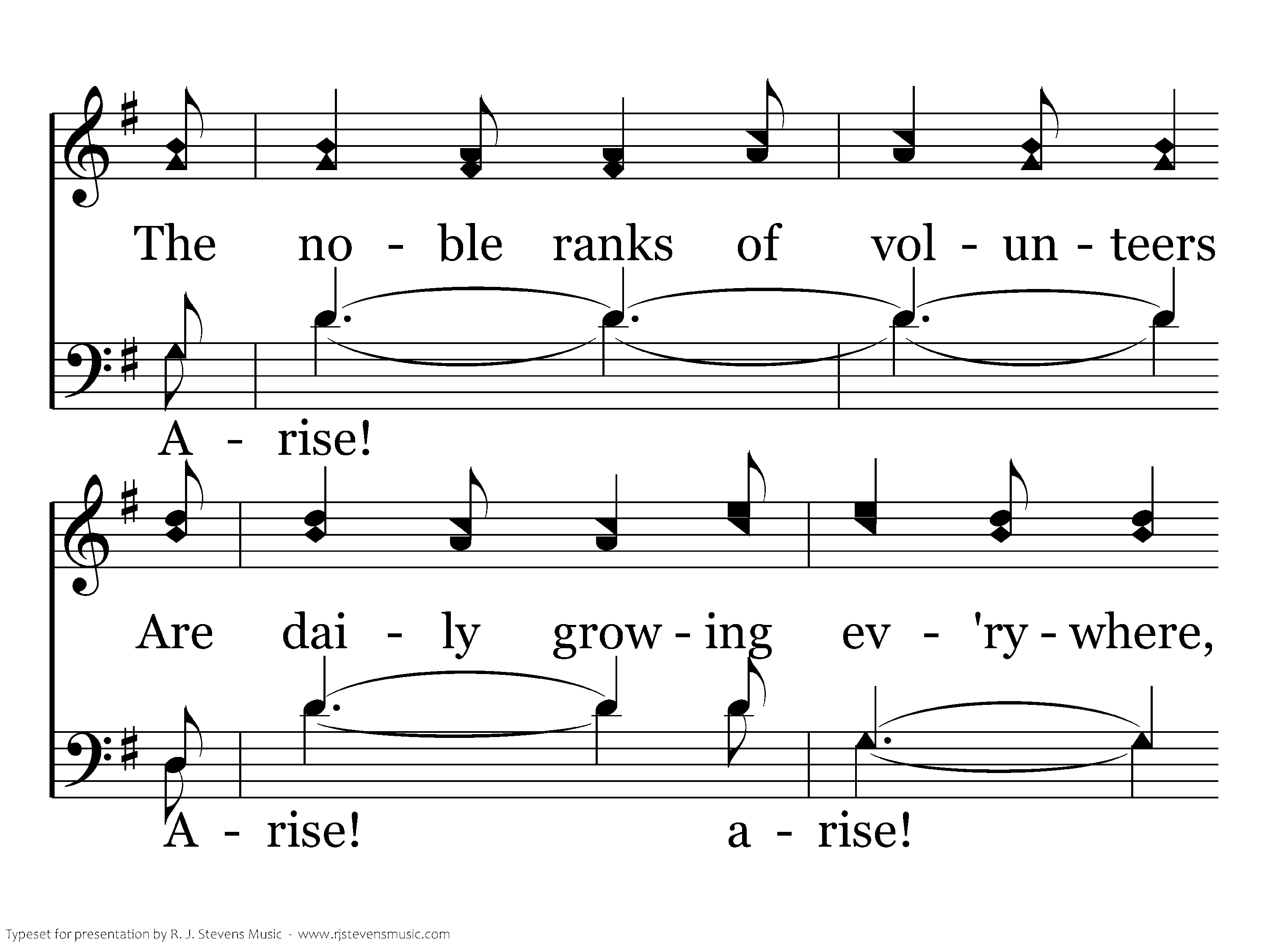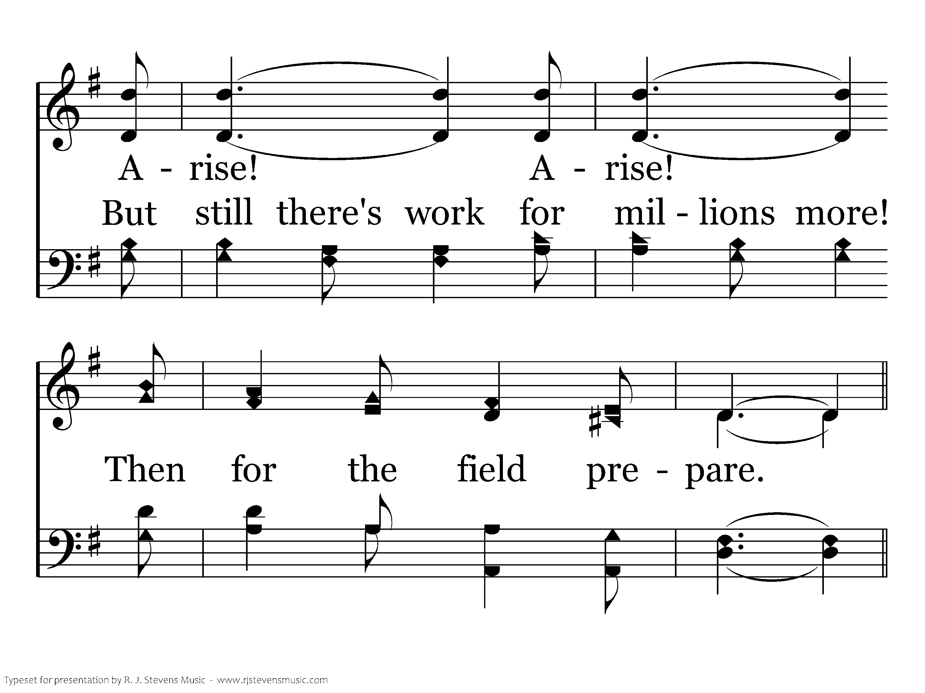 Arise! the Master calls for thee, The harvest days are here! No longer sit with folded hands, But gather far and near. The noble ranks of volunteers Are daily growing ev'rywhere, But still there's work for millions more! Then for the field prepare.