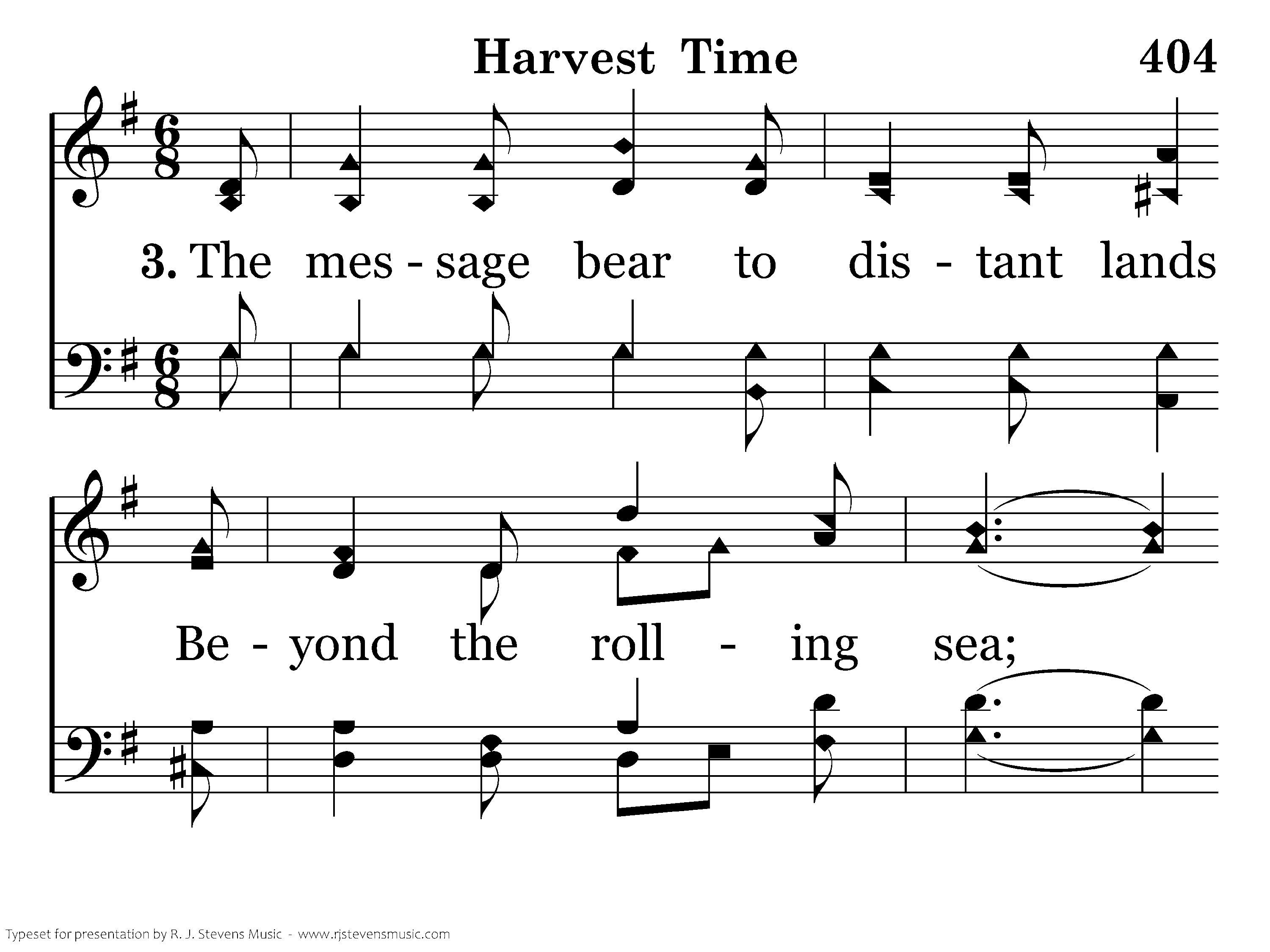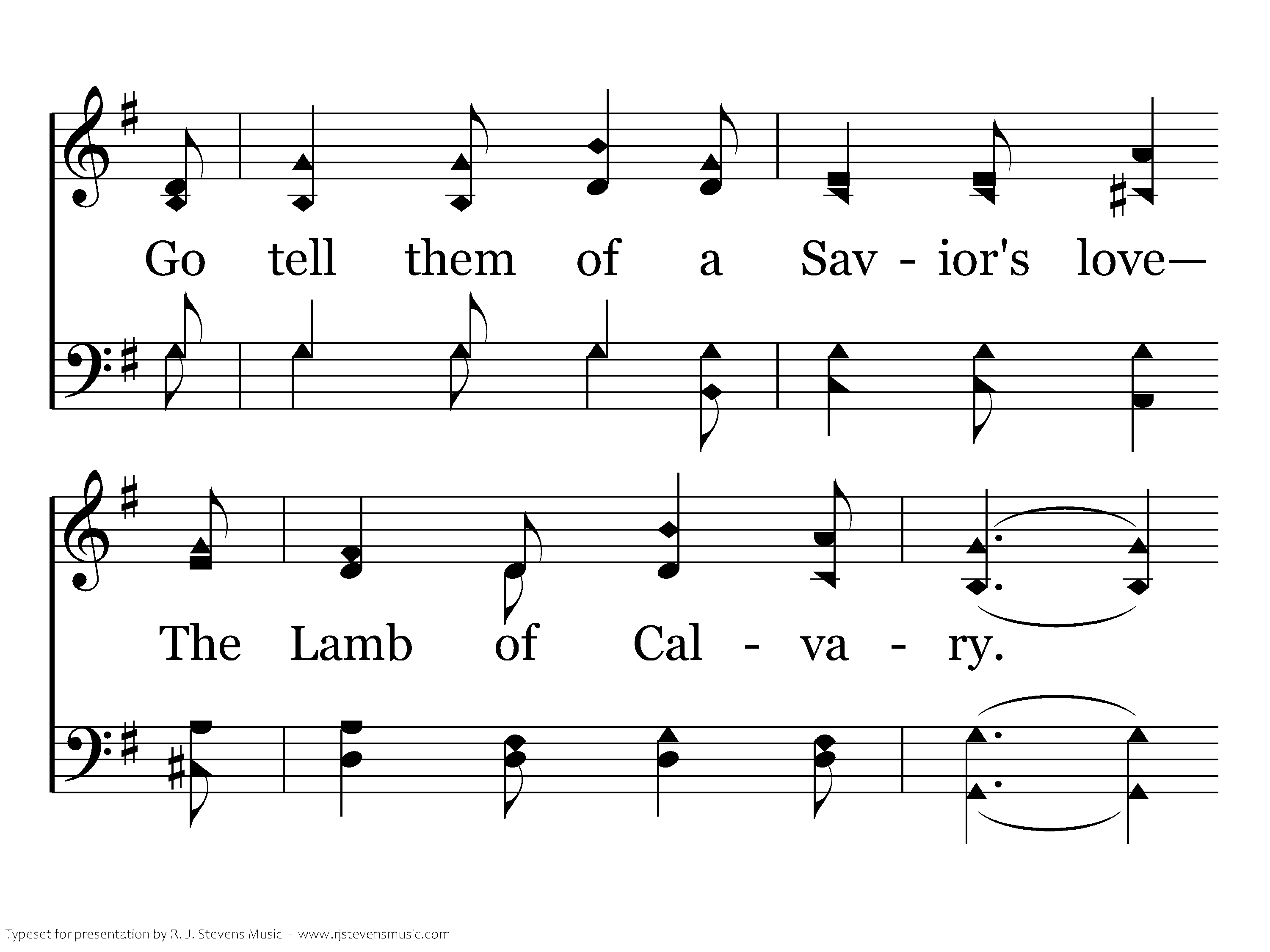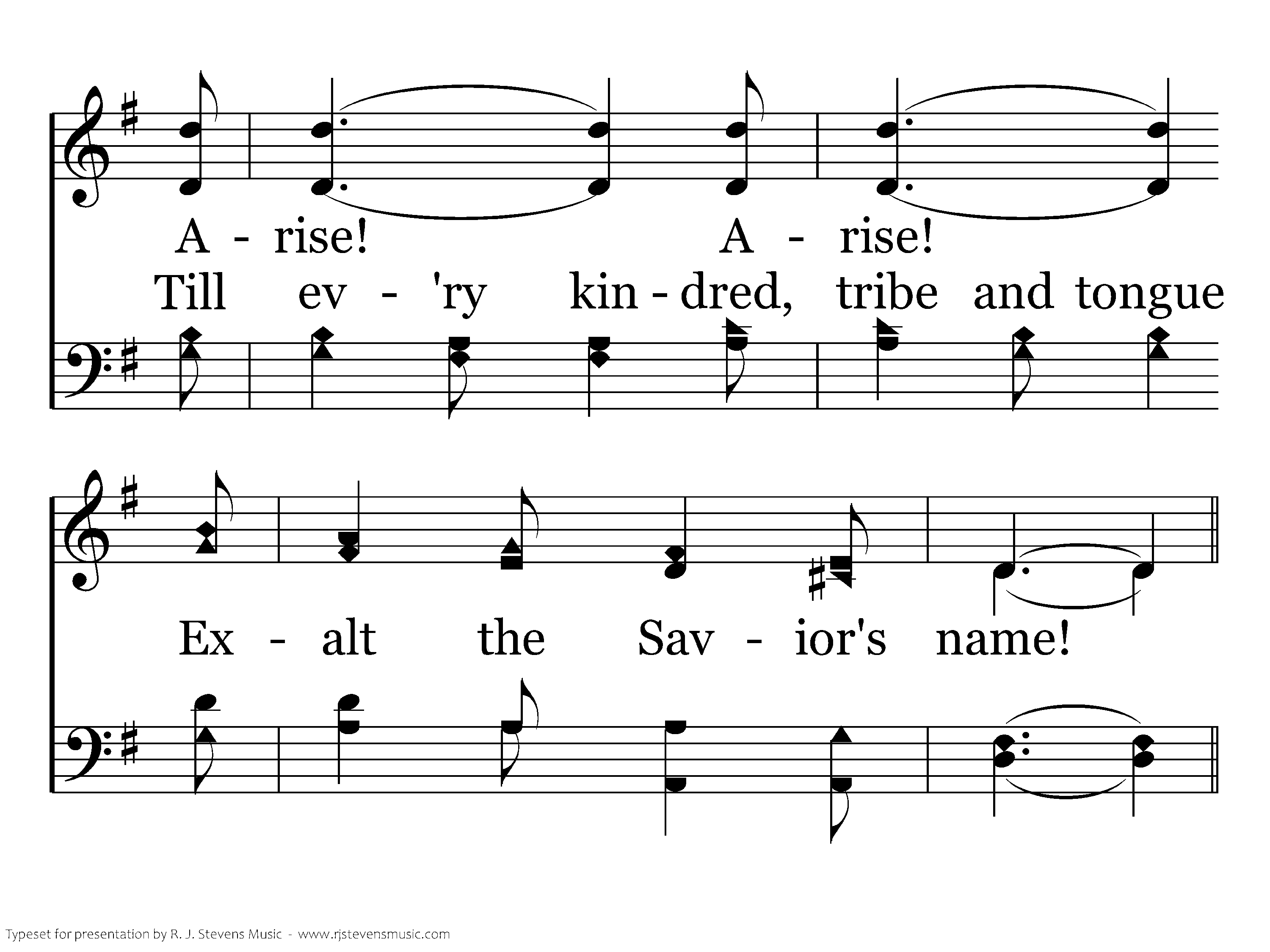 The message bear to distant lands Beyond the rolling sea; Go tell them of a Savior's love— The Lamb of Calvary. Arise! the Master calls for thee! Salvation full and free proclaim, Till ev'ry kindred, tribe and tongue Exalt the Savior's name!