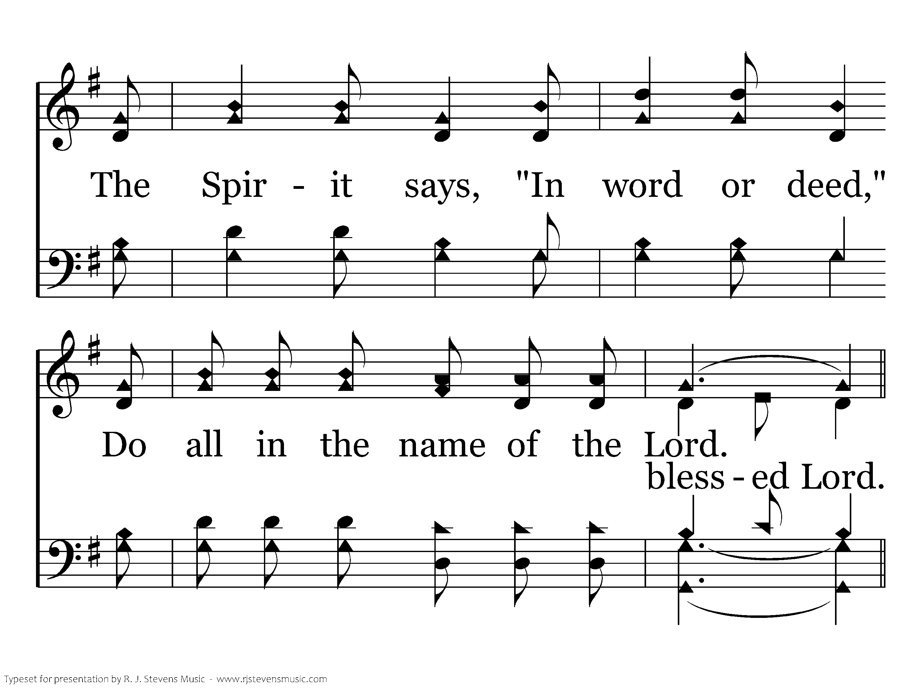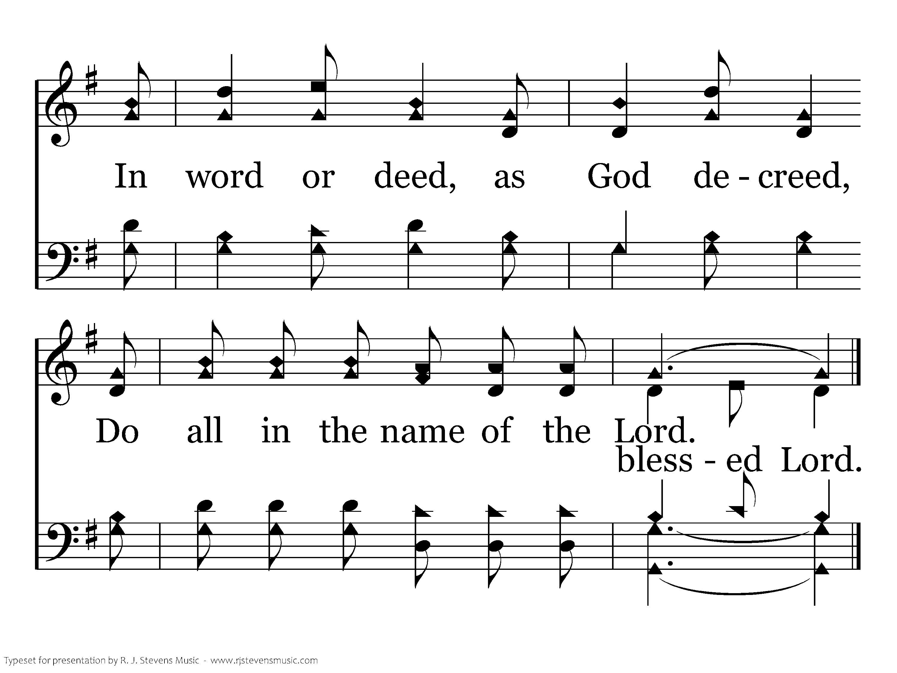Do all in His name, Do all in the name of the Lord; In word or deed, as God de-creed, Do all in the name of the Lord.