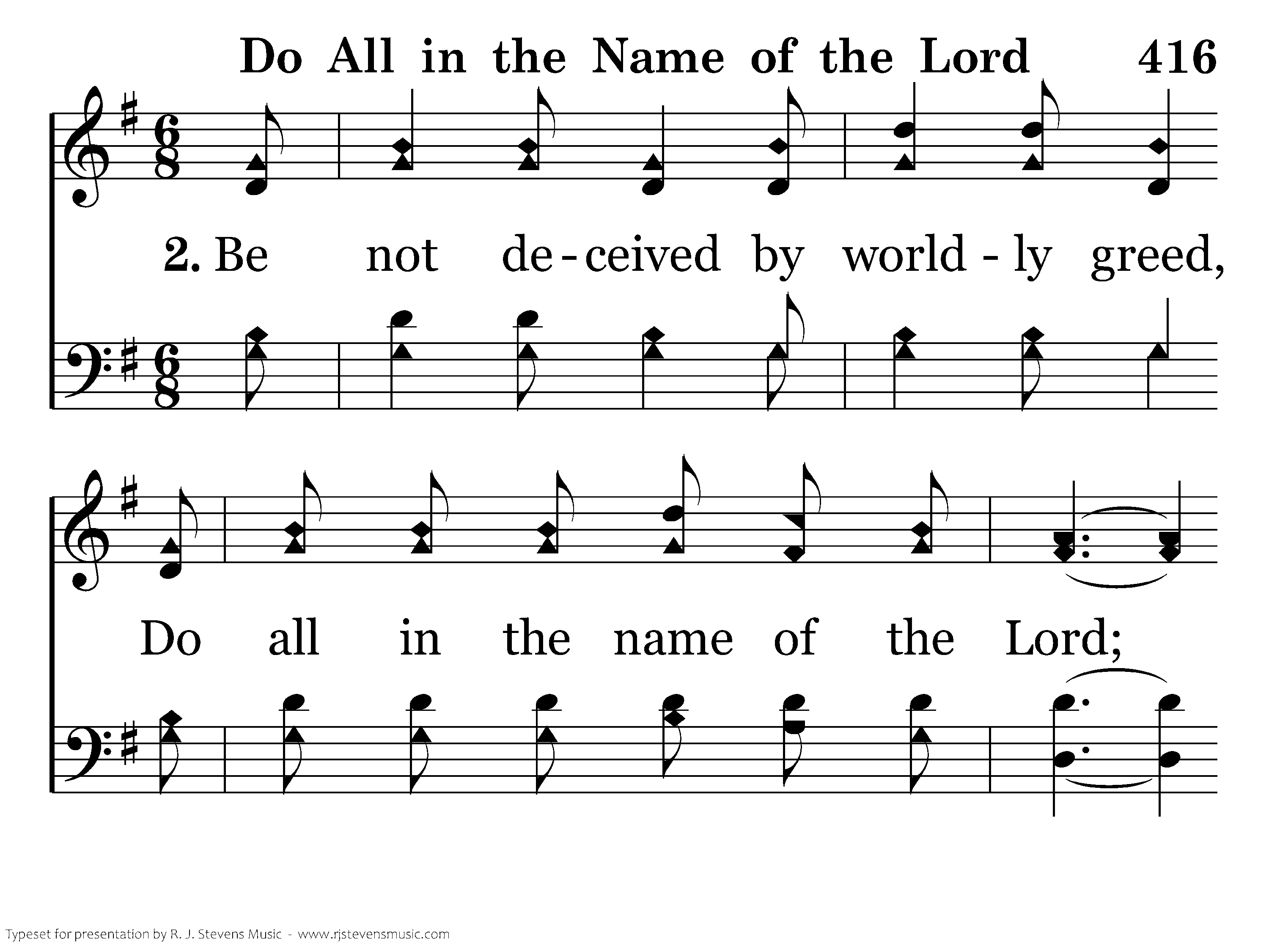Be not deceived by worldly greed, Do all in the name of the Lord; The Spirit says, "In word or deed," Do all in the name of the Lord.
