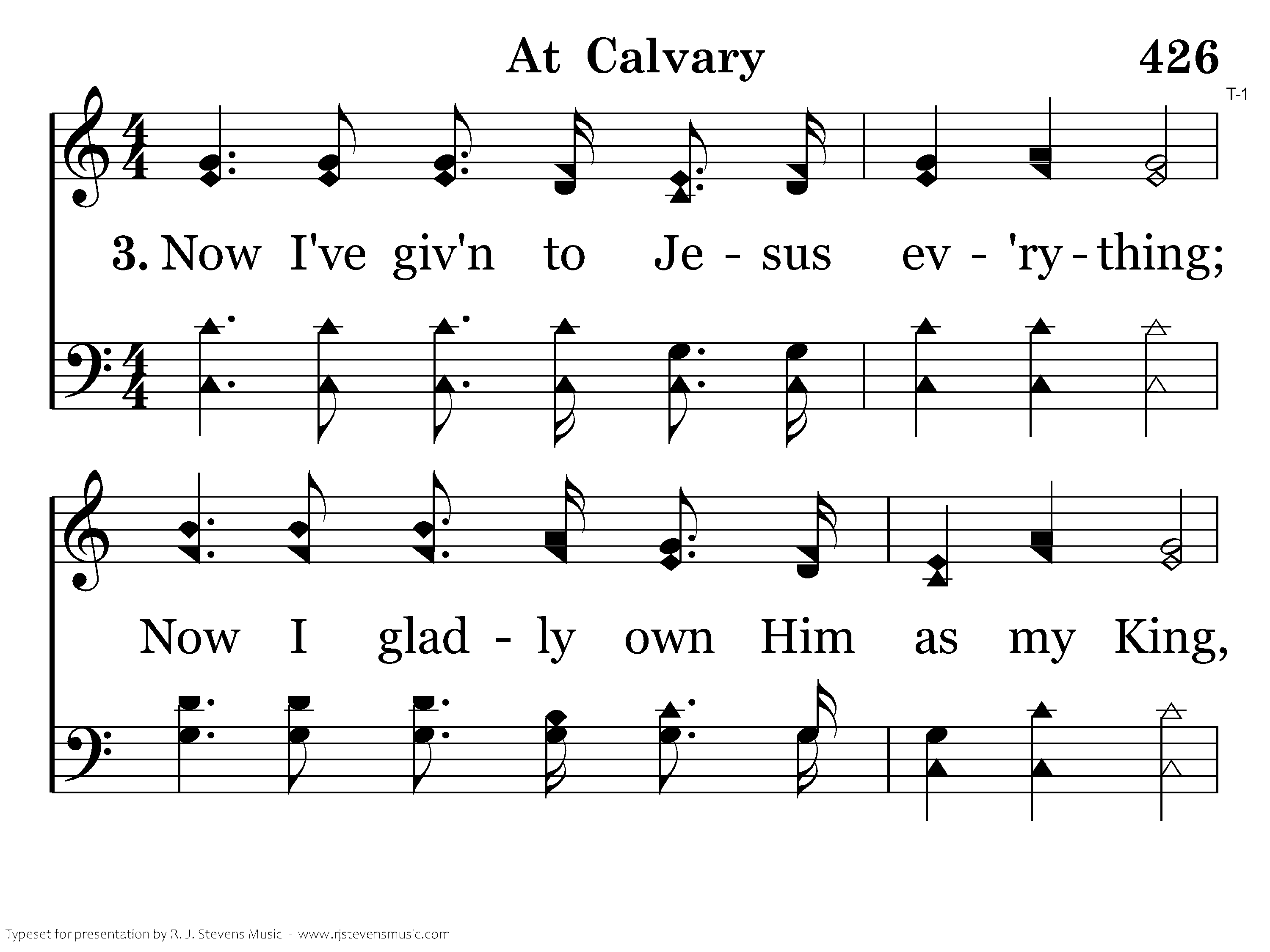 Now I've giv'n to Jesus ev'rything; Now I gladly own Him as my King, Now my raptured soul can only sing of Calvary!