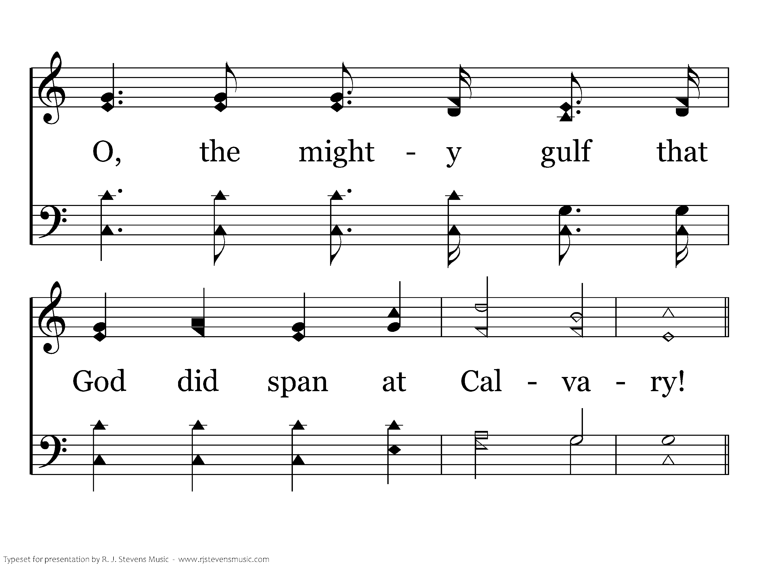 O, the love that drew salvation's plan! O, the grace that bro't it down to man! O, the mighty gulf that God did span at Calvary!