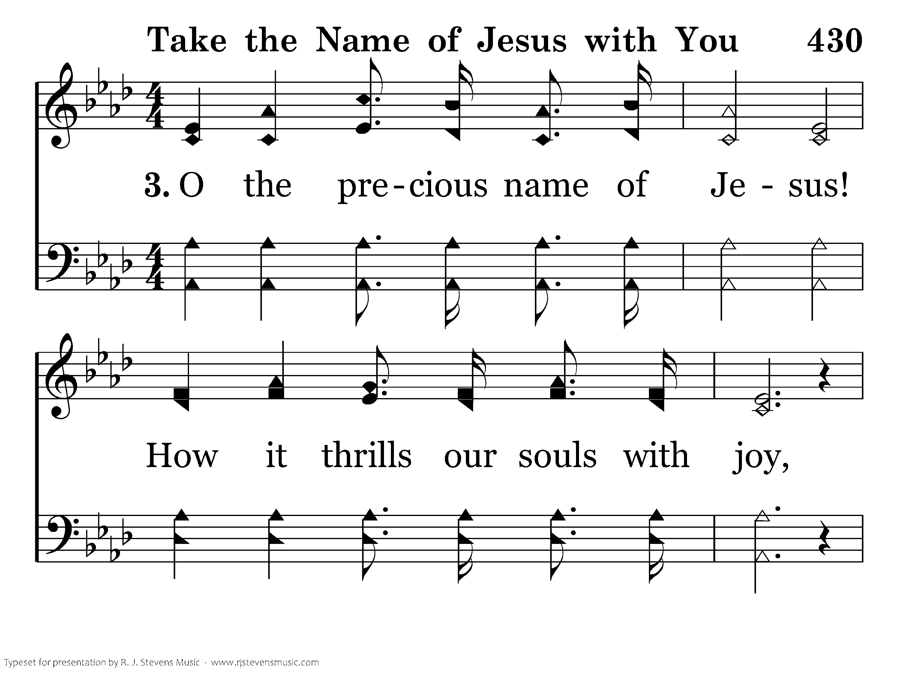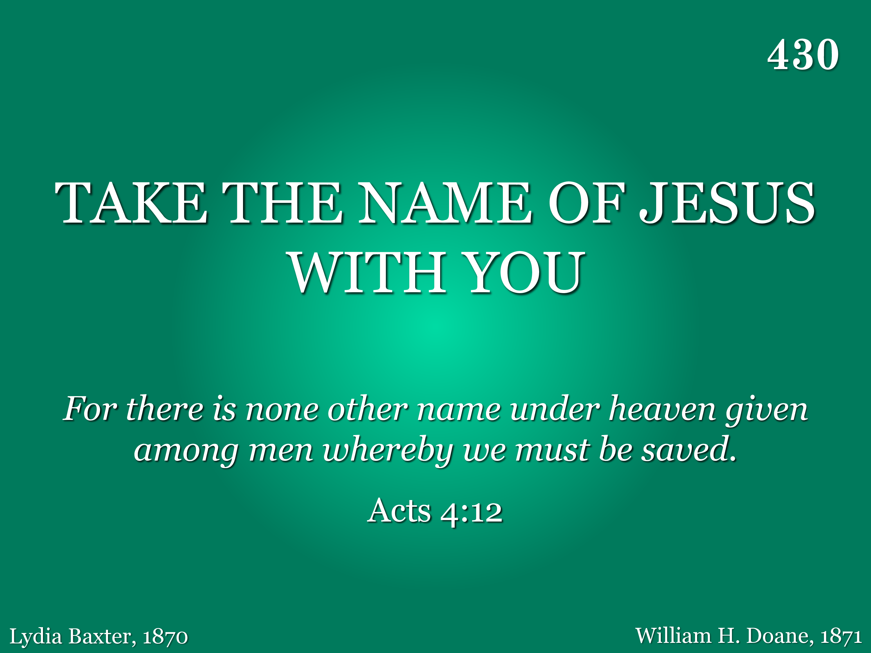 Take the name of Jesus with you, Child of sorrow and of woe; It will joy and comfort give you, Take it then, where'er you go.