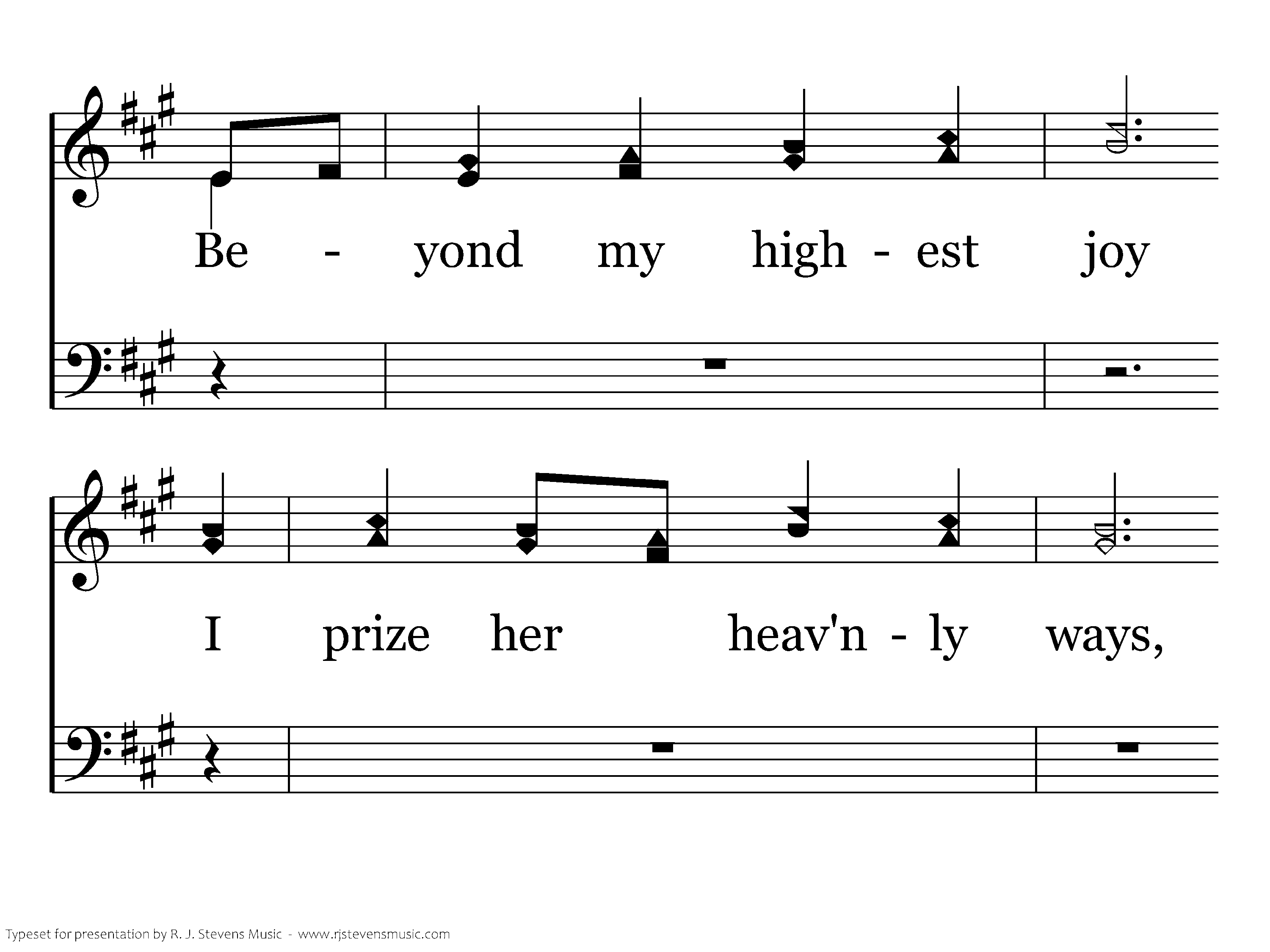 For her my tears shall fall, For her my prayers ascend; To her my cries and toils be giv'n, Till toils and cares shall end; Beyond my highest joy I prize her heav'nly ways, Her sweet communion, solemn vows, Her hymns of love and praise.