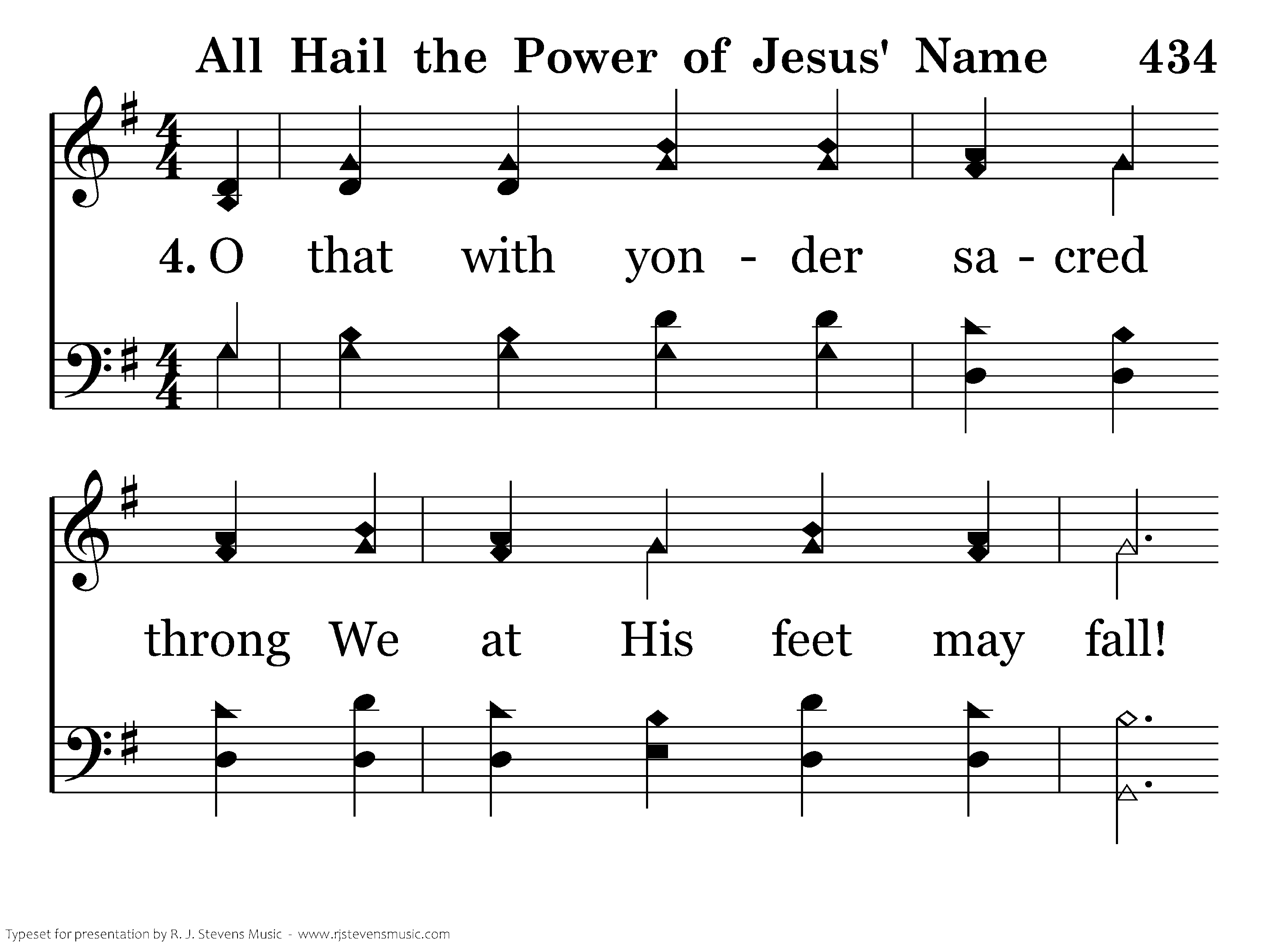 All hail the pow'r of Jesus' name! Let angels prostrate fall! Bring forth the royal diadem, And crown Him Lord of all; Bring forth the royal diadem, And crown Him Lord of all.