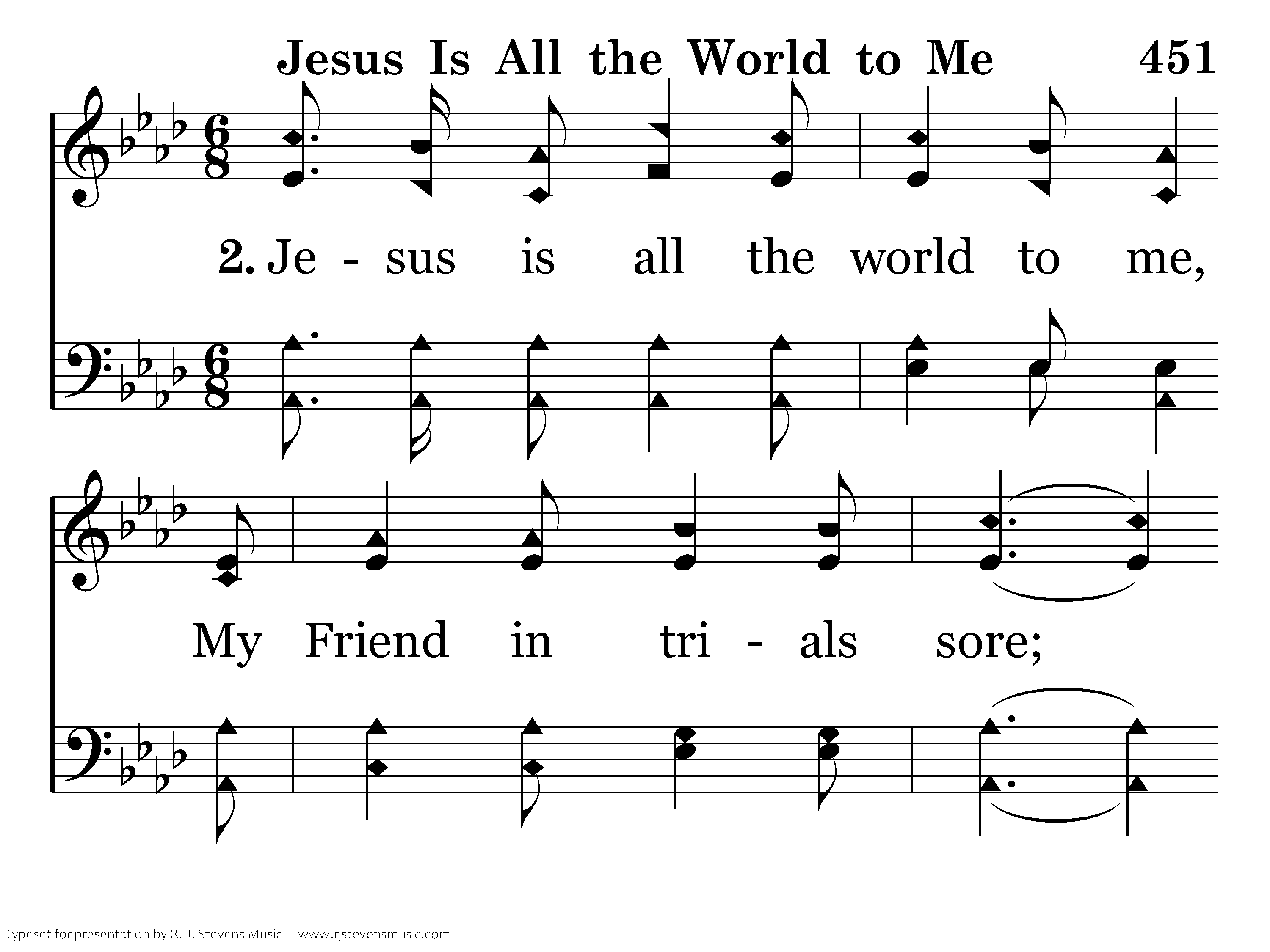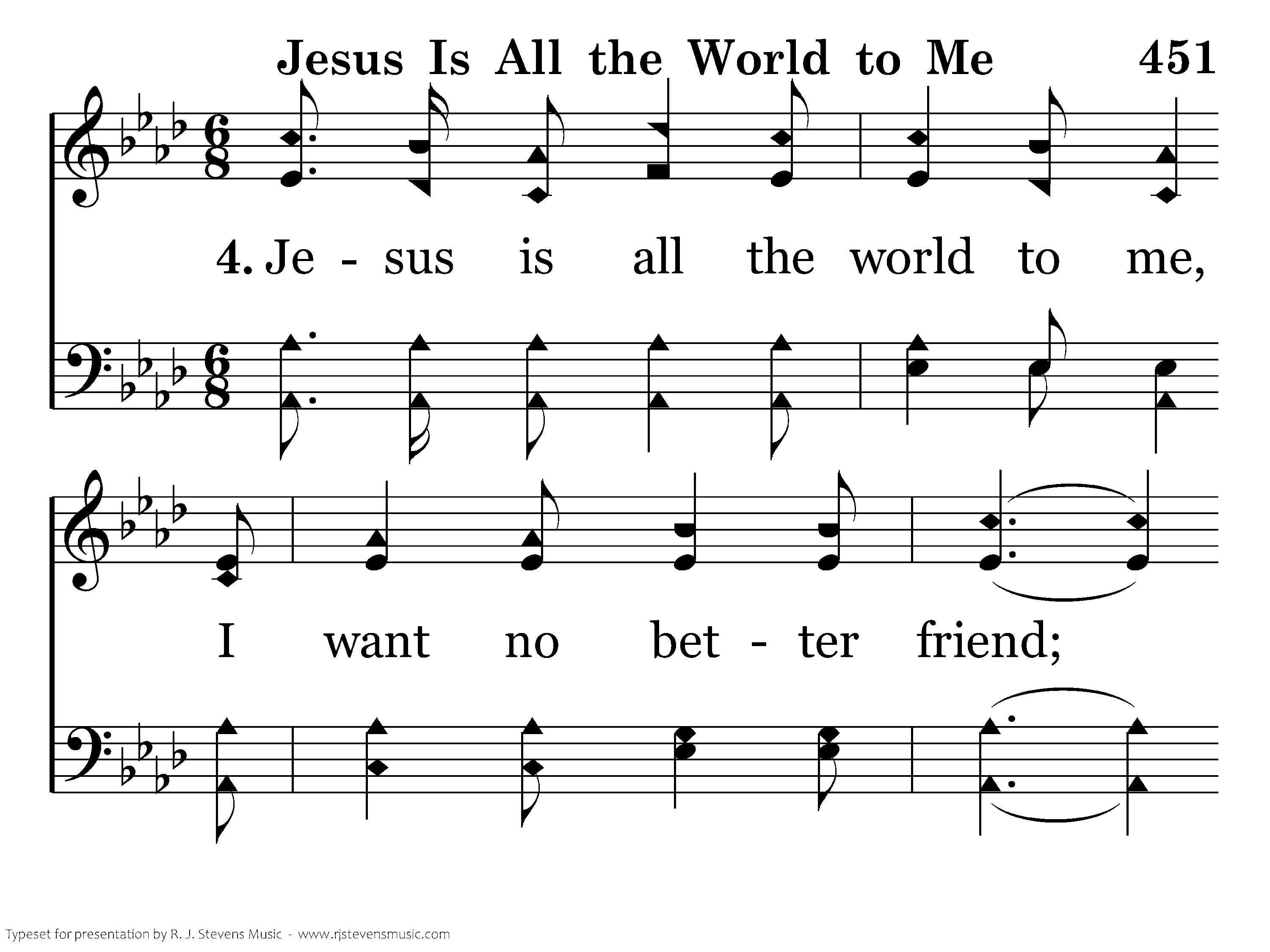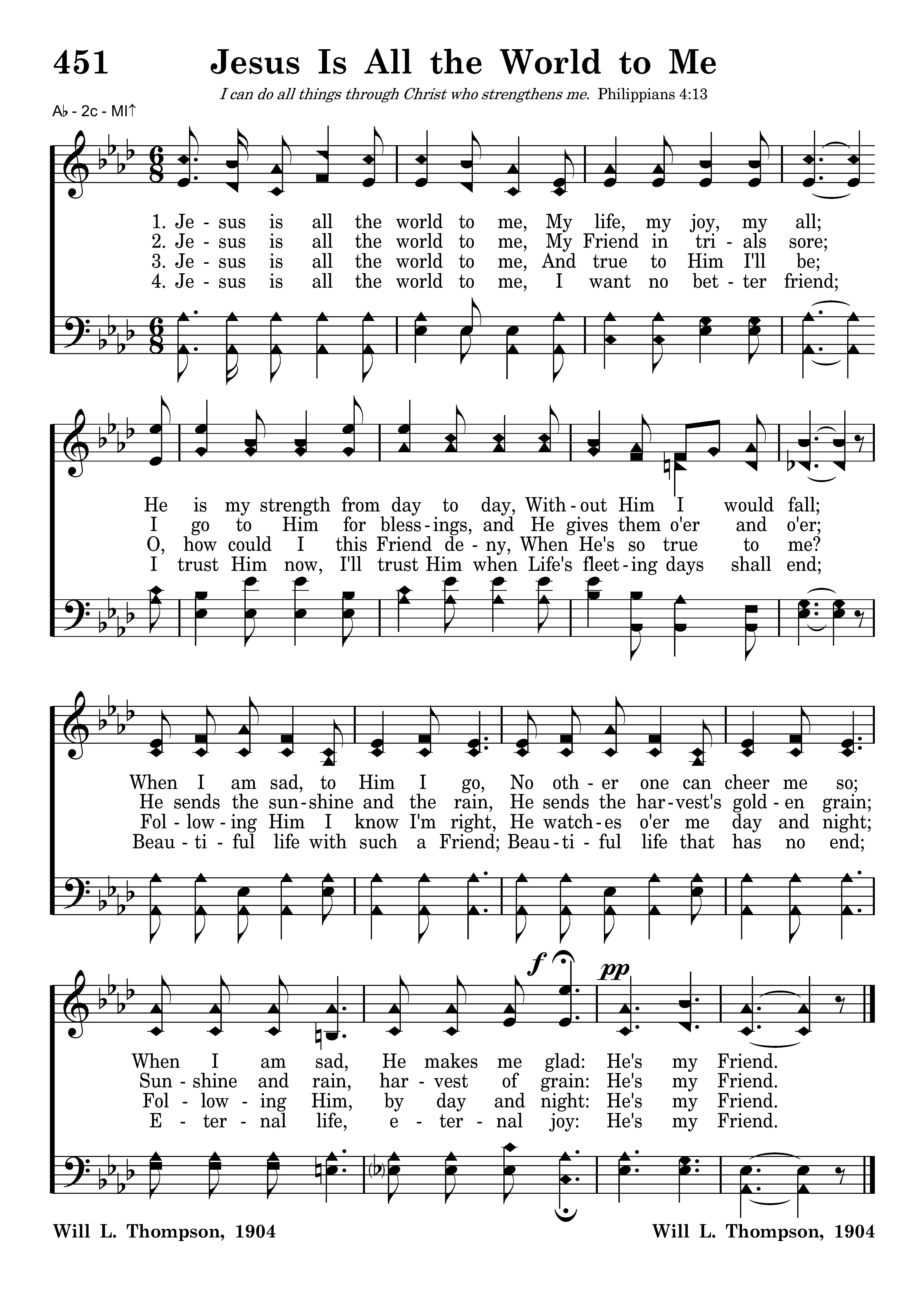 Jesus is all the world to me, And true to Him I'll be; O, how could I this Friend deny, When He's so true to me? Following Him I know I'm right, He watches o'er me day and night; Fol.owing Him, by day and night; He's my Friend