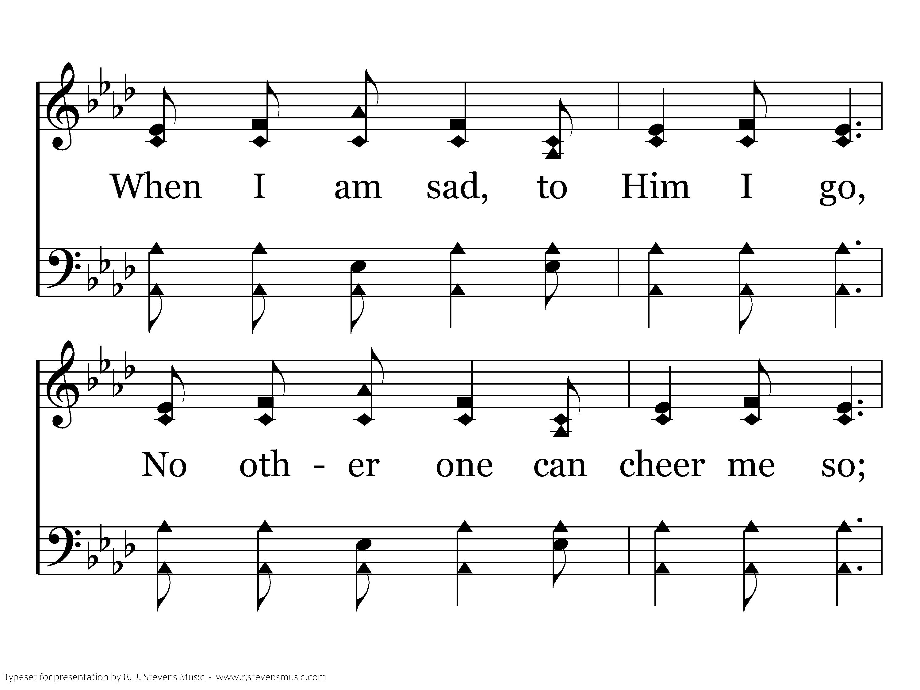 Jesus is all the world to me, My life, my joy, my all; He is my strength from day to day, Without Him I would fall; When I am sad, to Him I go, No other one can cheer me so; When I am sad, He makes me glad: He's my Friend.