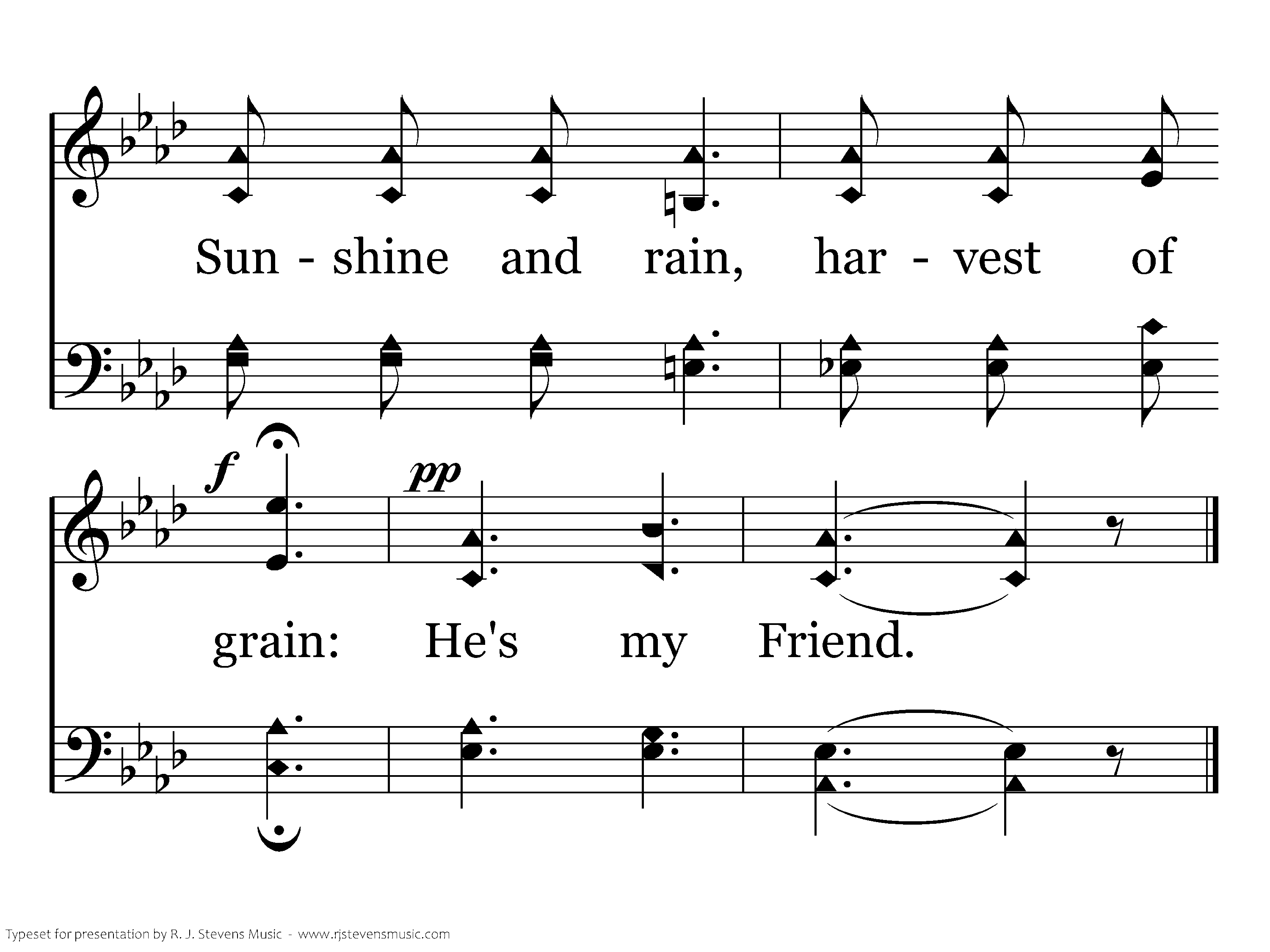 Jesus is all the world to me, My Friend in trials sore; I go to Him for blessings, and He gives them o'er and o'er; He sends the sunshine and the rain, He sends the harvest's golden grain; Sunshine and rain, harvest of grain: He's my Friend.
