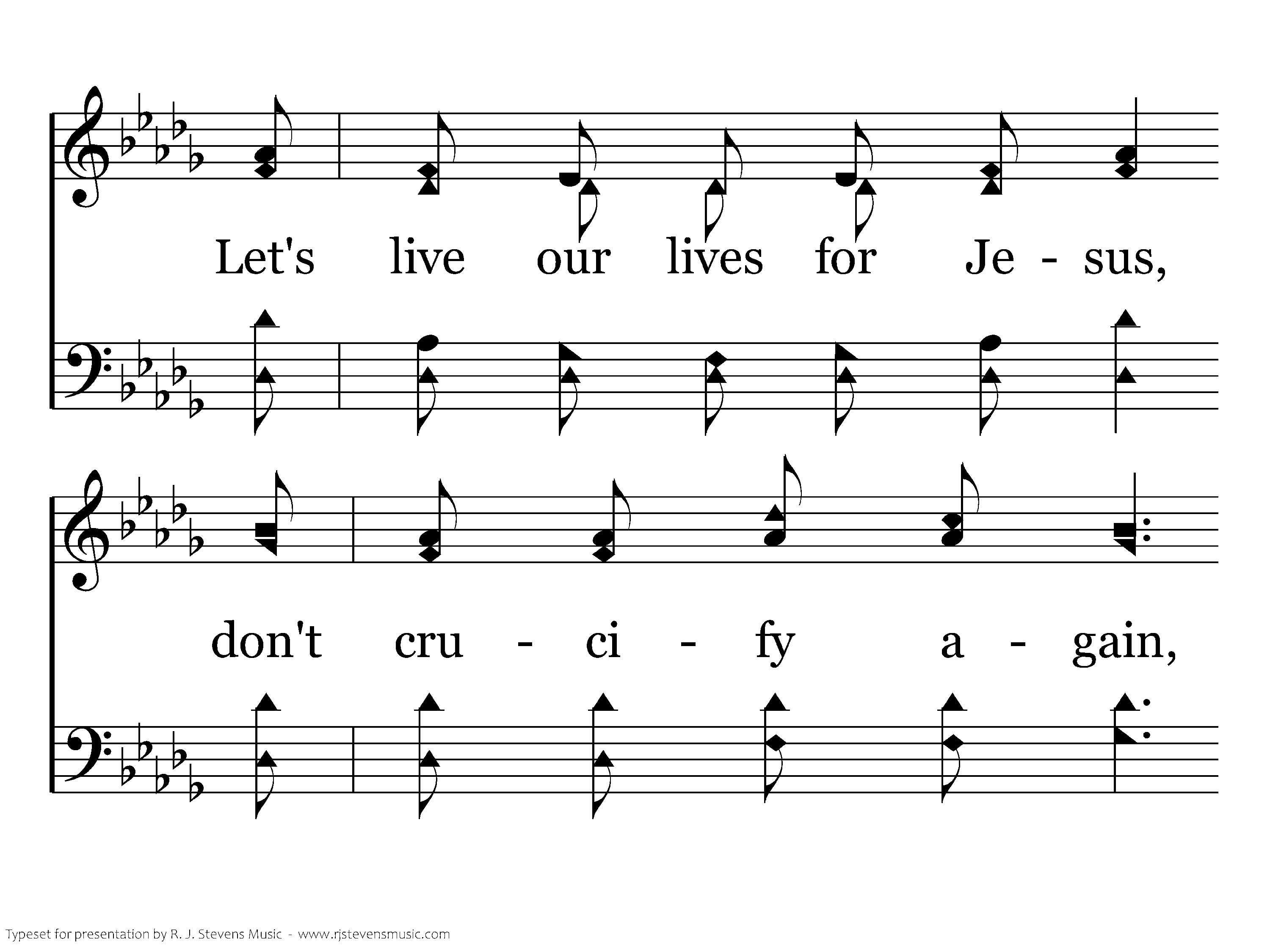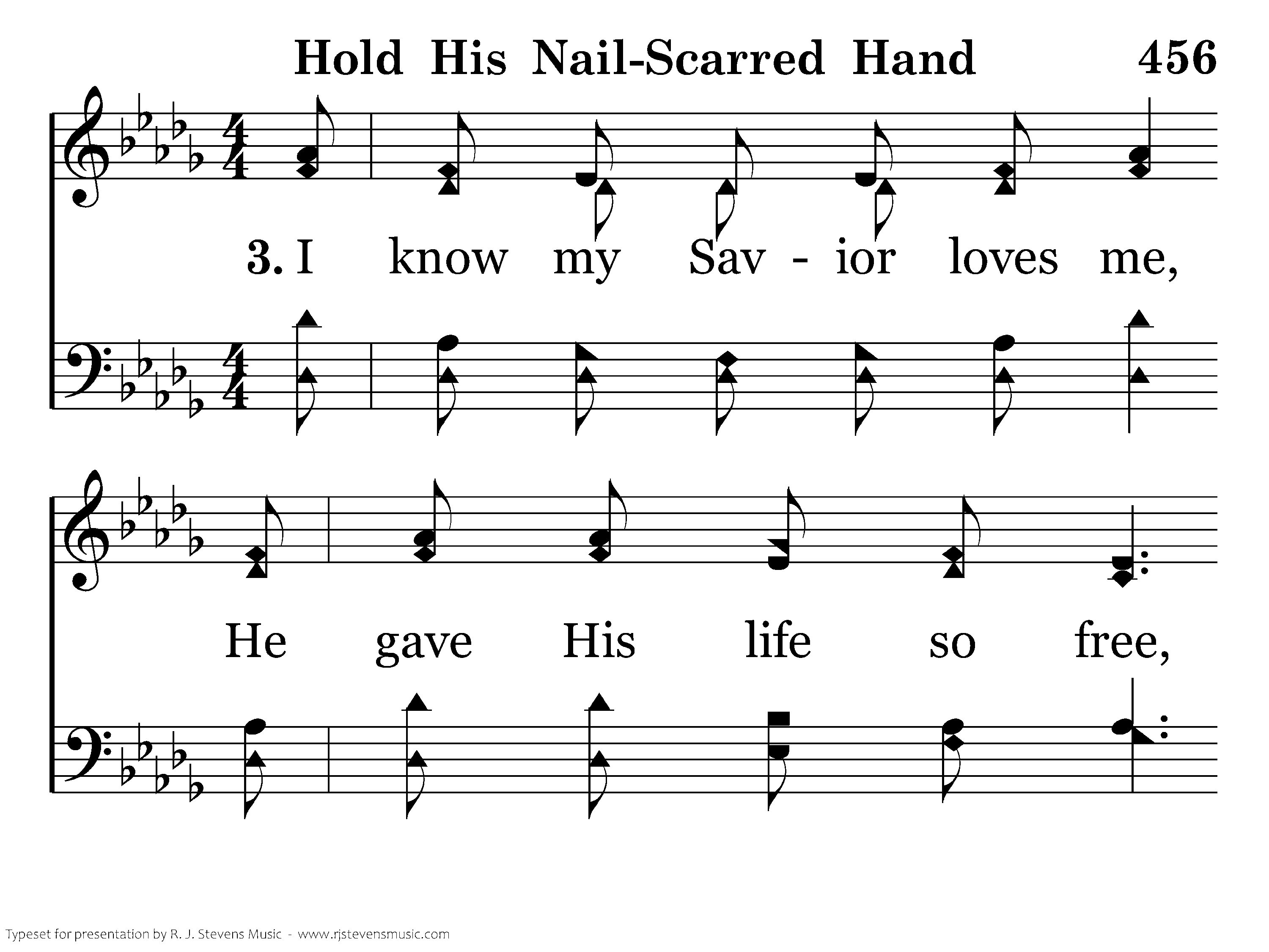 I know my Savior loves me, He gave His life so free, Upon the cross of Calv'ry He died for you and me; Let's live our lives for Jesus, don't crucify again, Give praise and honor to the Lord, and hold His nail-scarred hand.