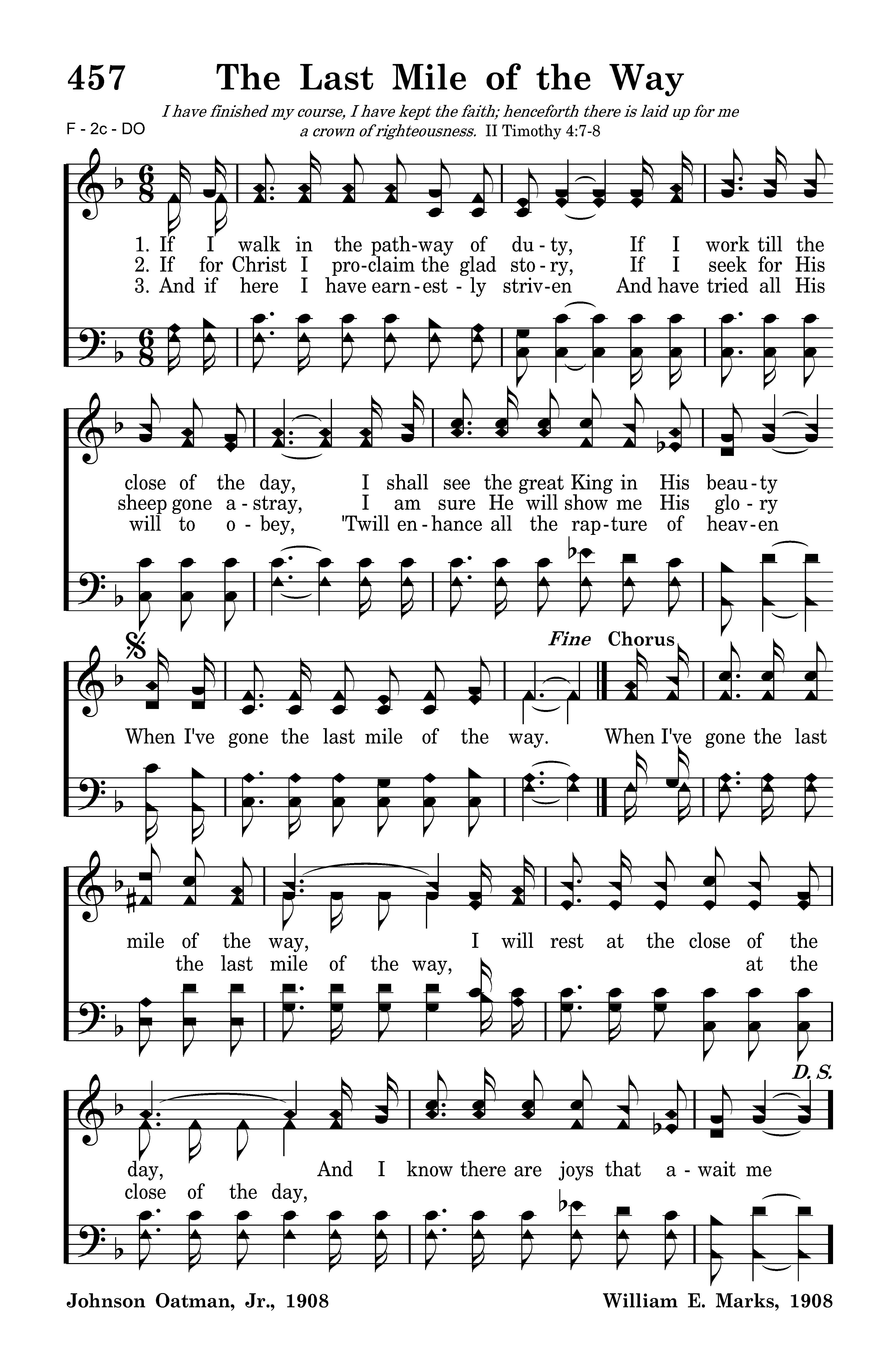 If I walk in the pathway of duty, If I work till the close of the day, I shall see the great King in His beauty When I've gone the last mile of the way.