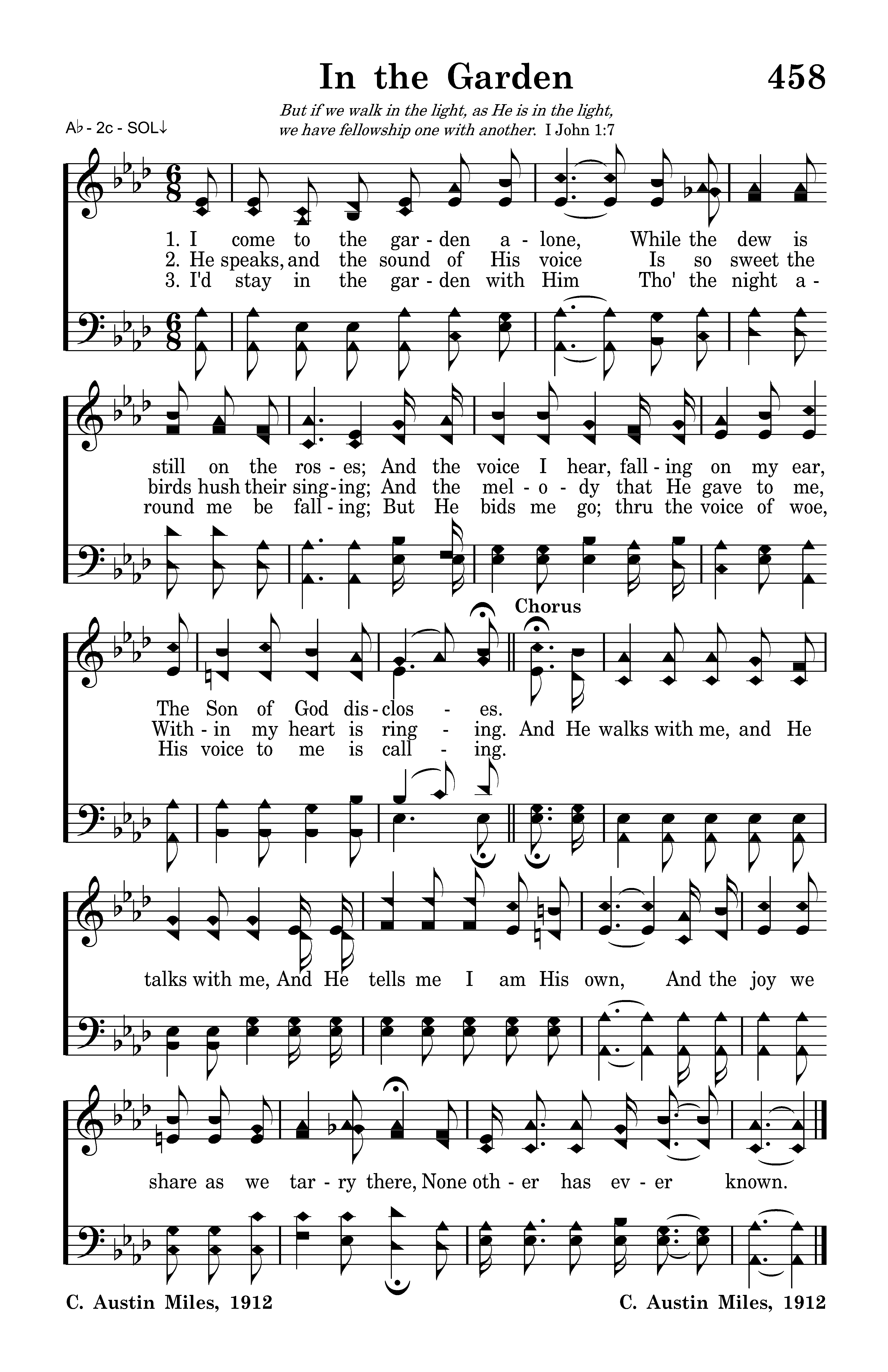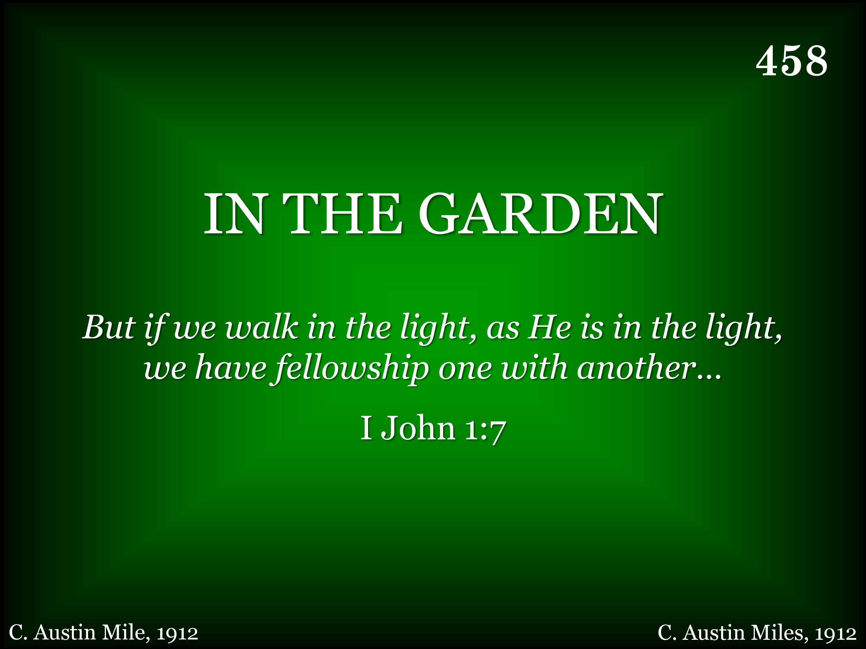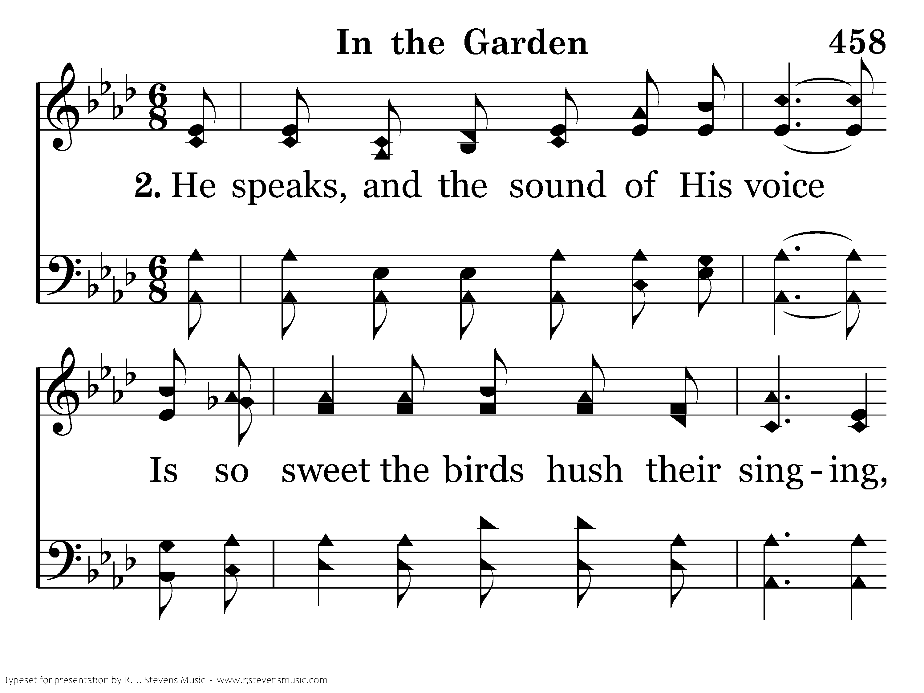 I come to the garden alone, While the dew is still on the roses; And the voice I hear, falling on my ear, The Son of God discloses.