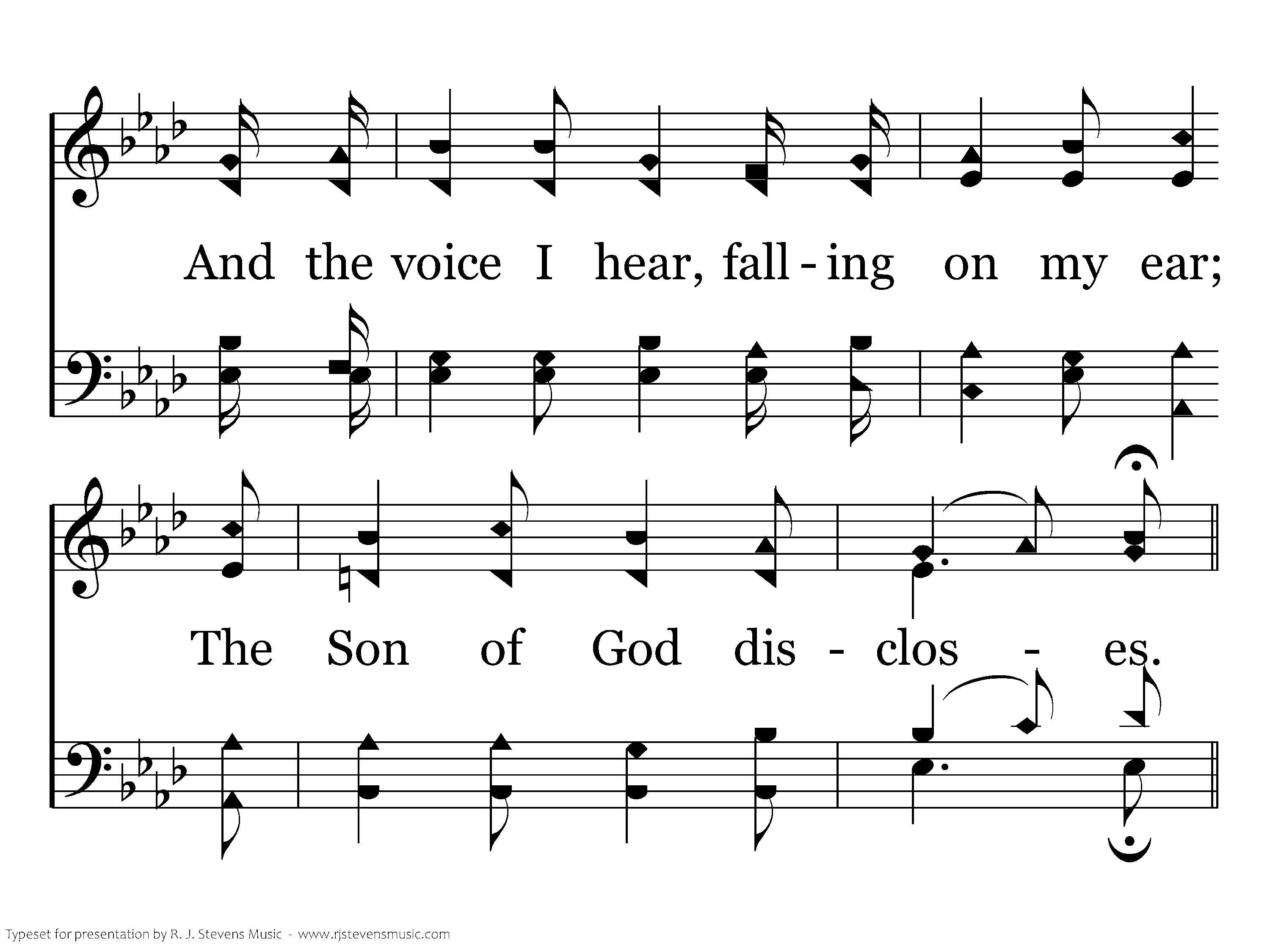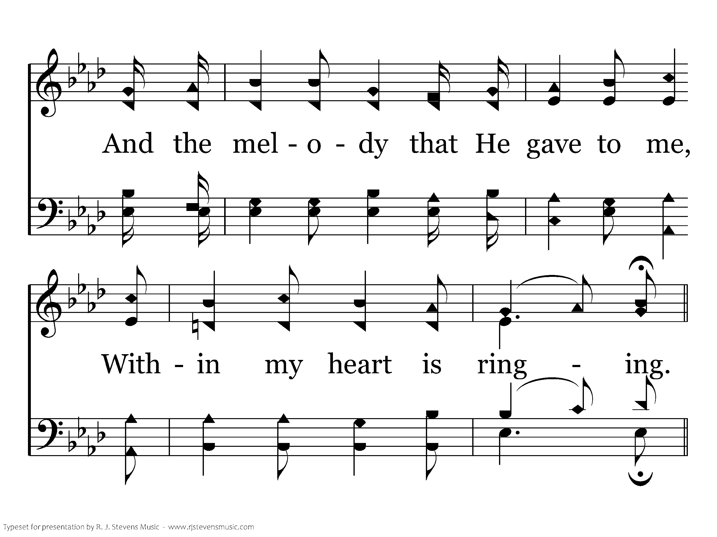 He speaks, and the sound of His voice Is so sweet the birds hush their singing; And the melody that He gave to me, Within my heart is ringing.