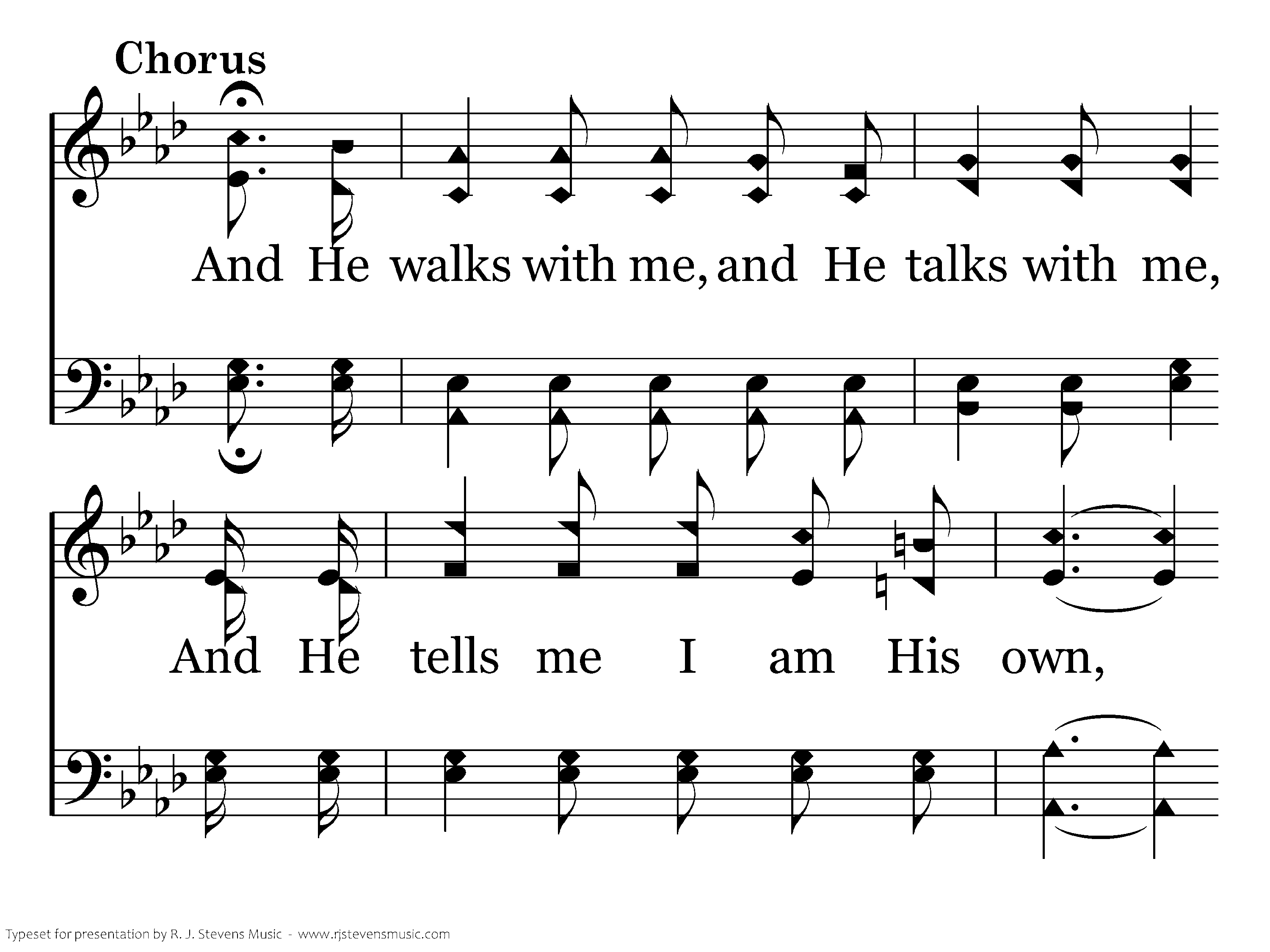 And He walks with me, and He talks with me, And He tells me I am His own, And the joy we share as we tarry there, None other has ever known.