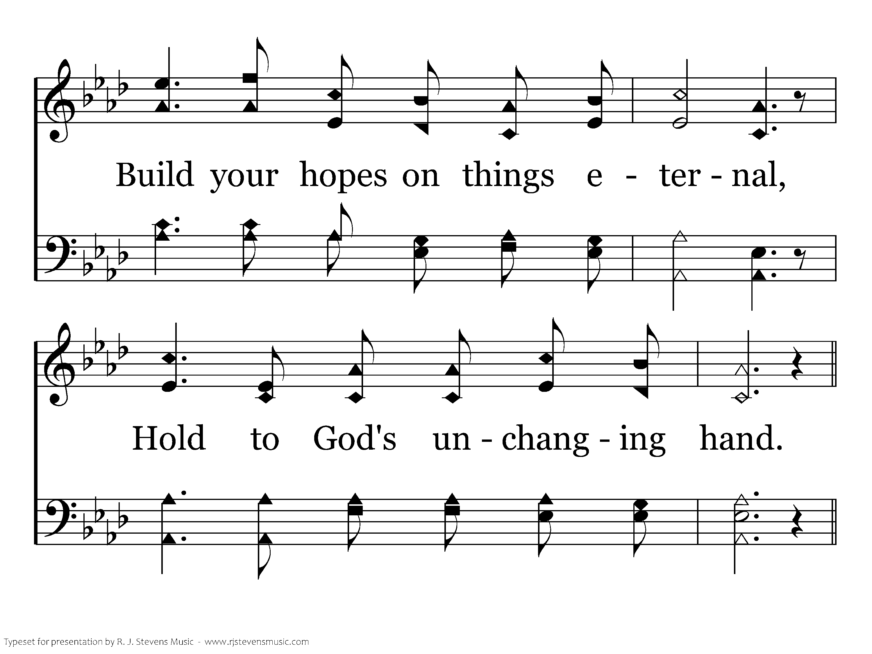 Time is filled with swift transition, Naught of earth unmoved can stand Build your hopes on things eternal, Hold to God's unchanging hand.
