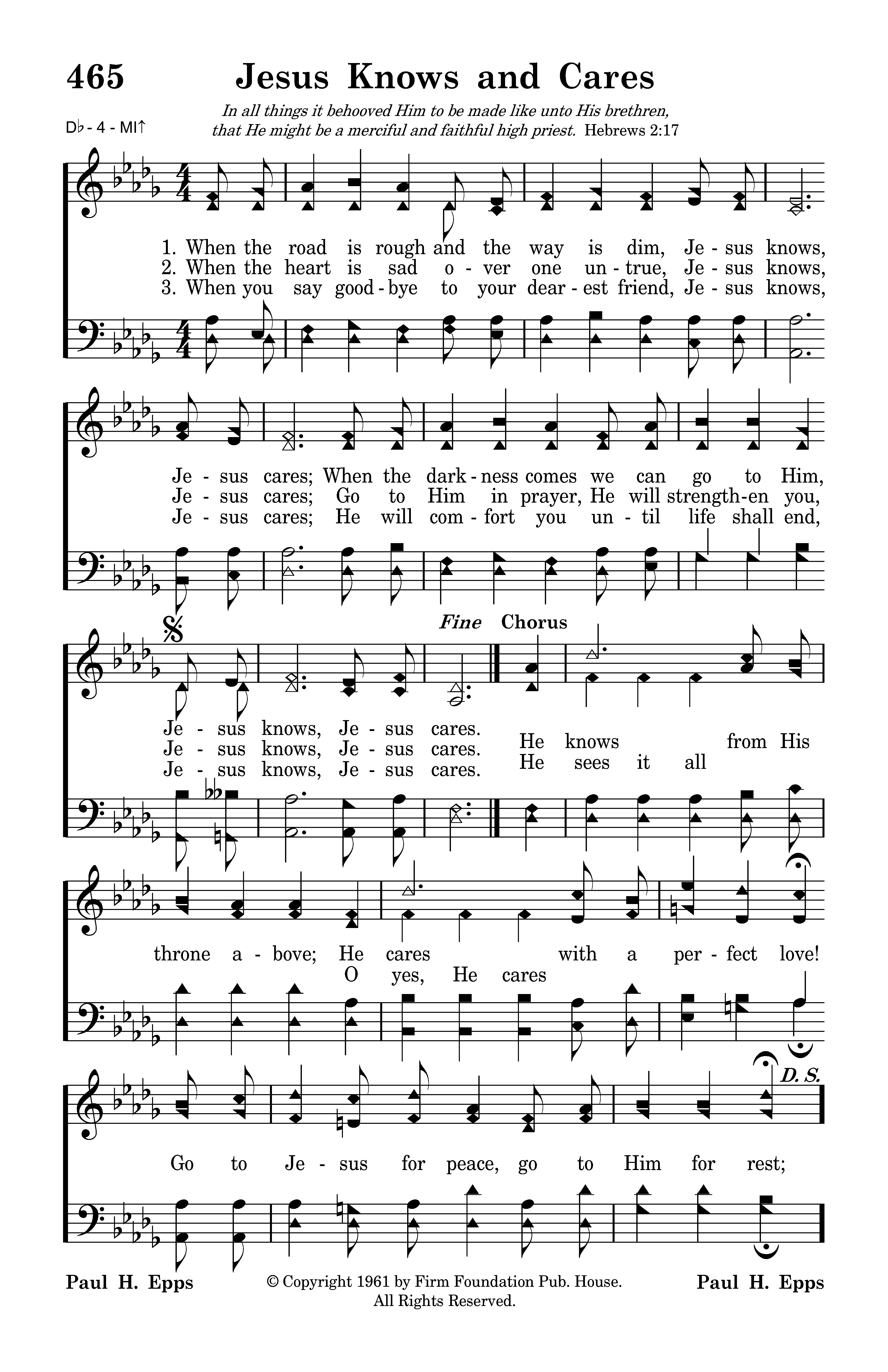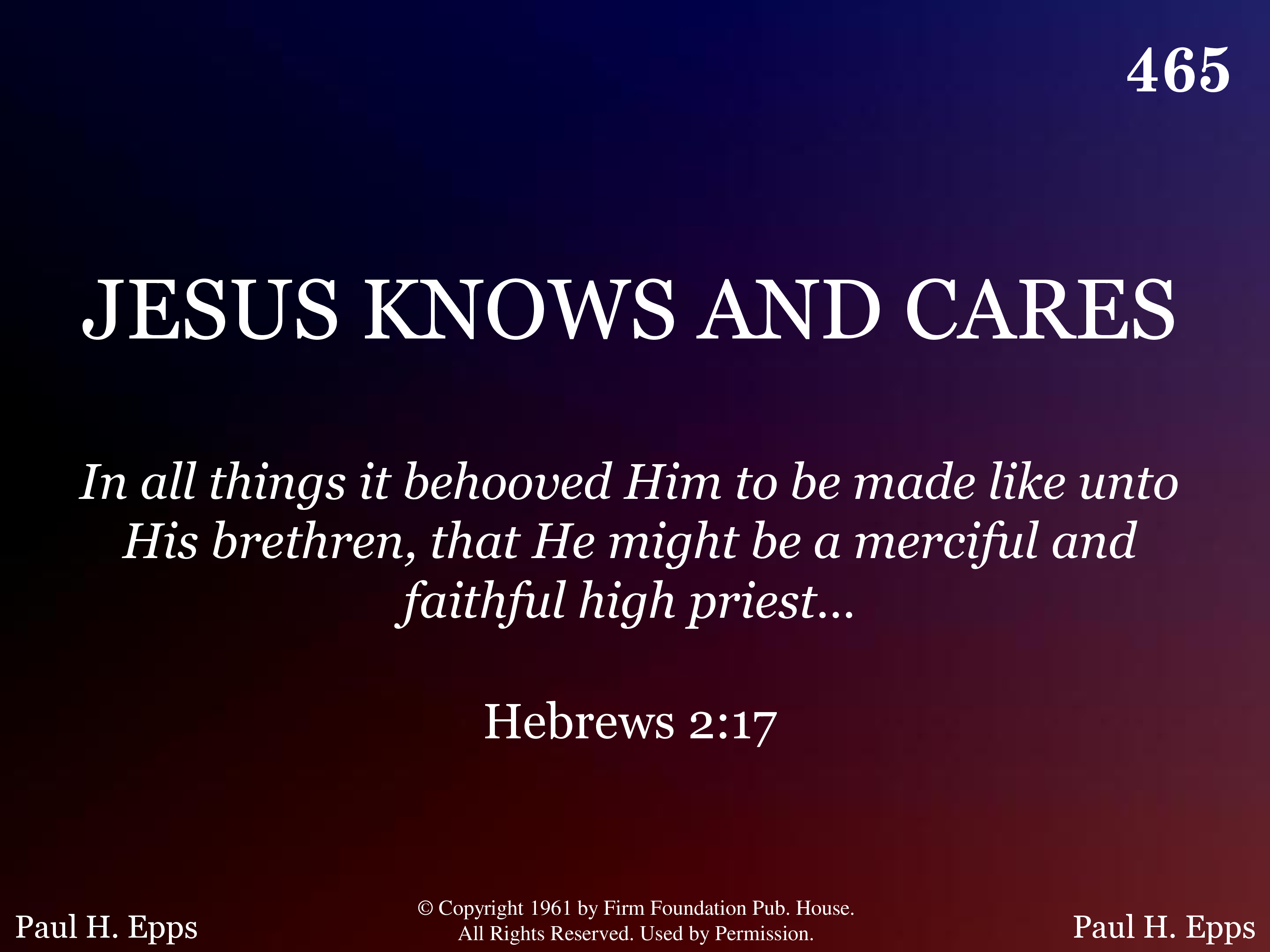 When the road is rough and the way is dim, Jesus knows, Jesus cares; When the darkness comes we can go to Him, Jesus knows, Jesus cares.
