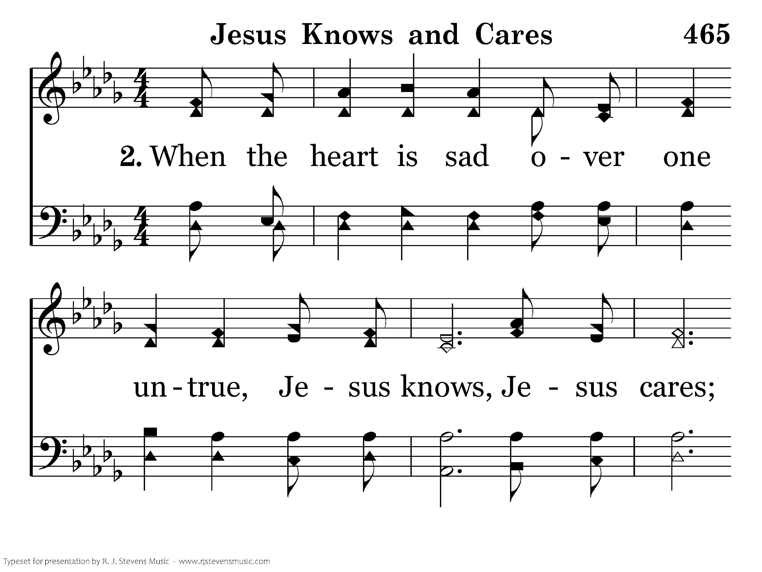 When the heart is sad over one untrue, Jesus knows, Jesus cares; Go to Him in prayer, He will strengthen you, Jesus knows, Jesus cares.